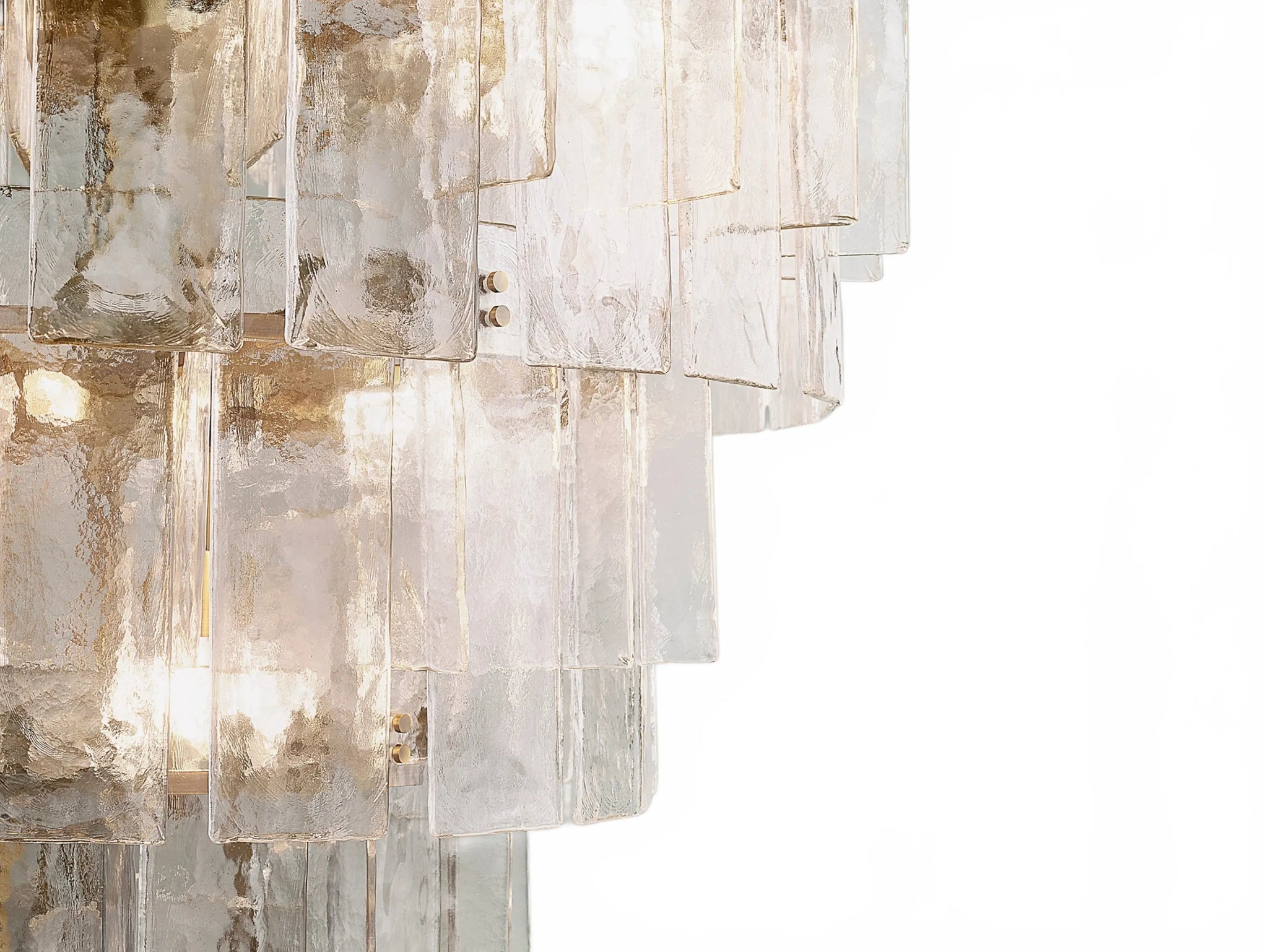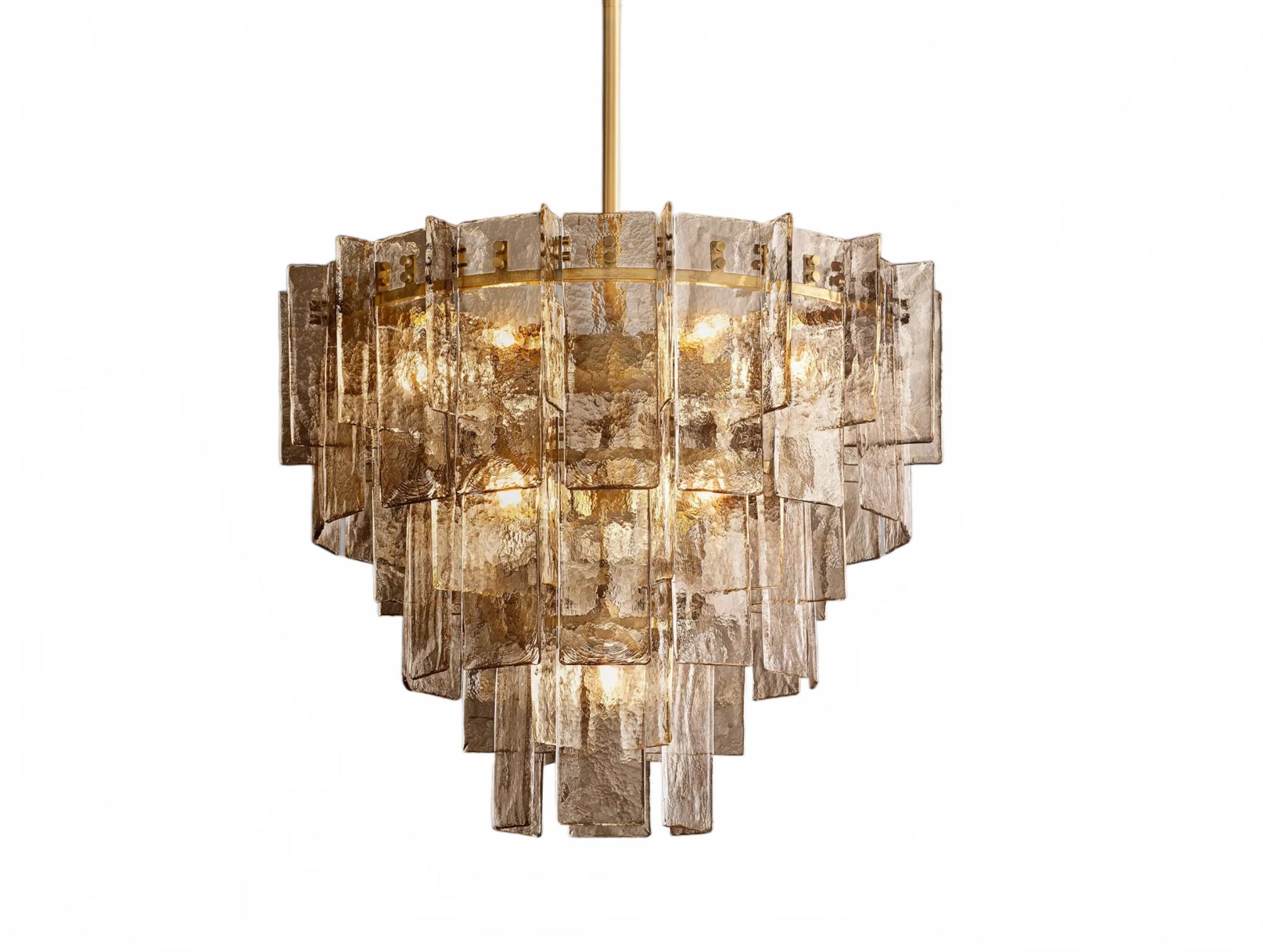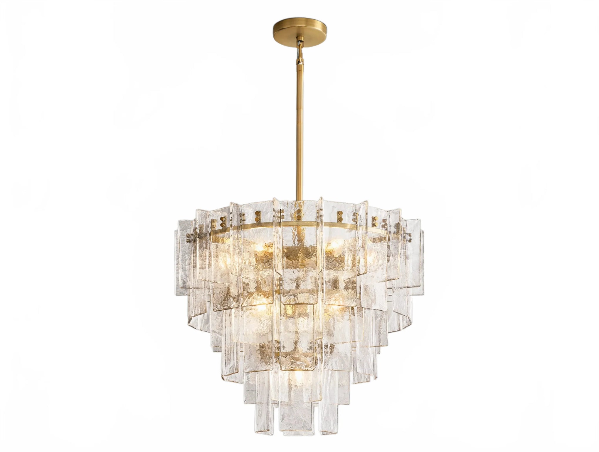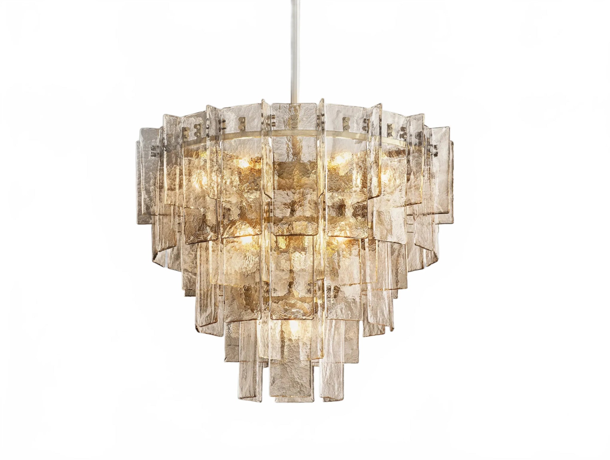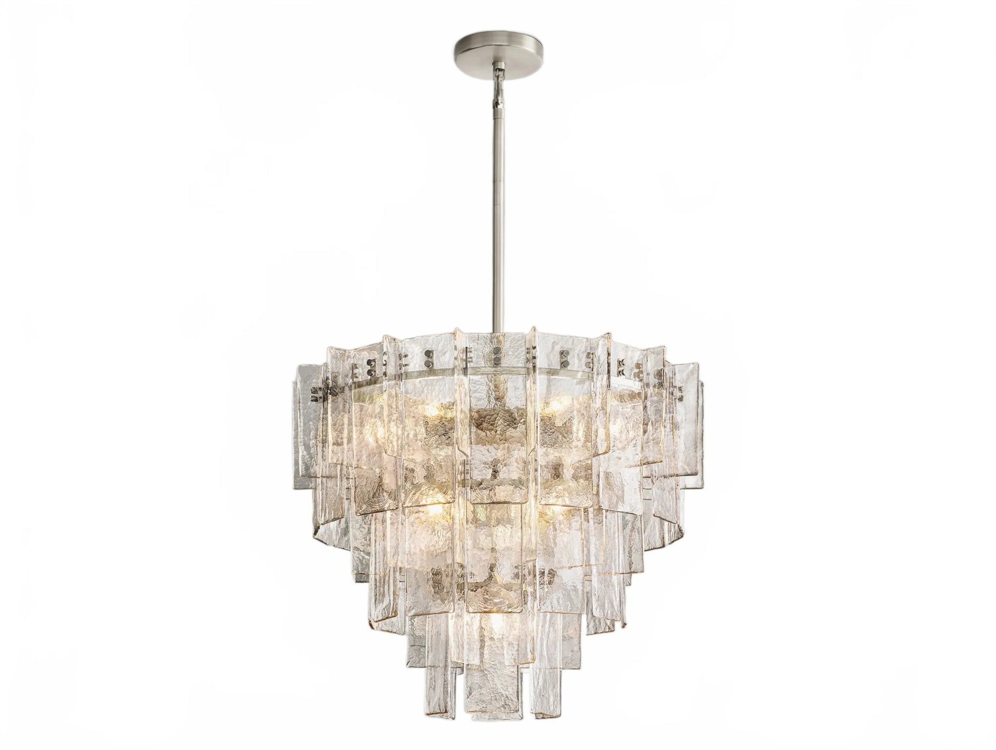 Airy and sculptural, the Dryice chandelier pairs cast glass with steel in a rhythmic, multi-layered silhouette influenced by midcentury geometry. Each ripple-textured glass panel is shaped in a custom mold, producing soft contours and radiant depth. Offered in two sizes to complement diverse interiors, both styles feature integrated dimmer compatibility and adjustable-length rods. Whether showcased as a focal point in a lofty foyer or above a modern dining table, Dryice imparts architectural elegance and luminous warmth.