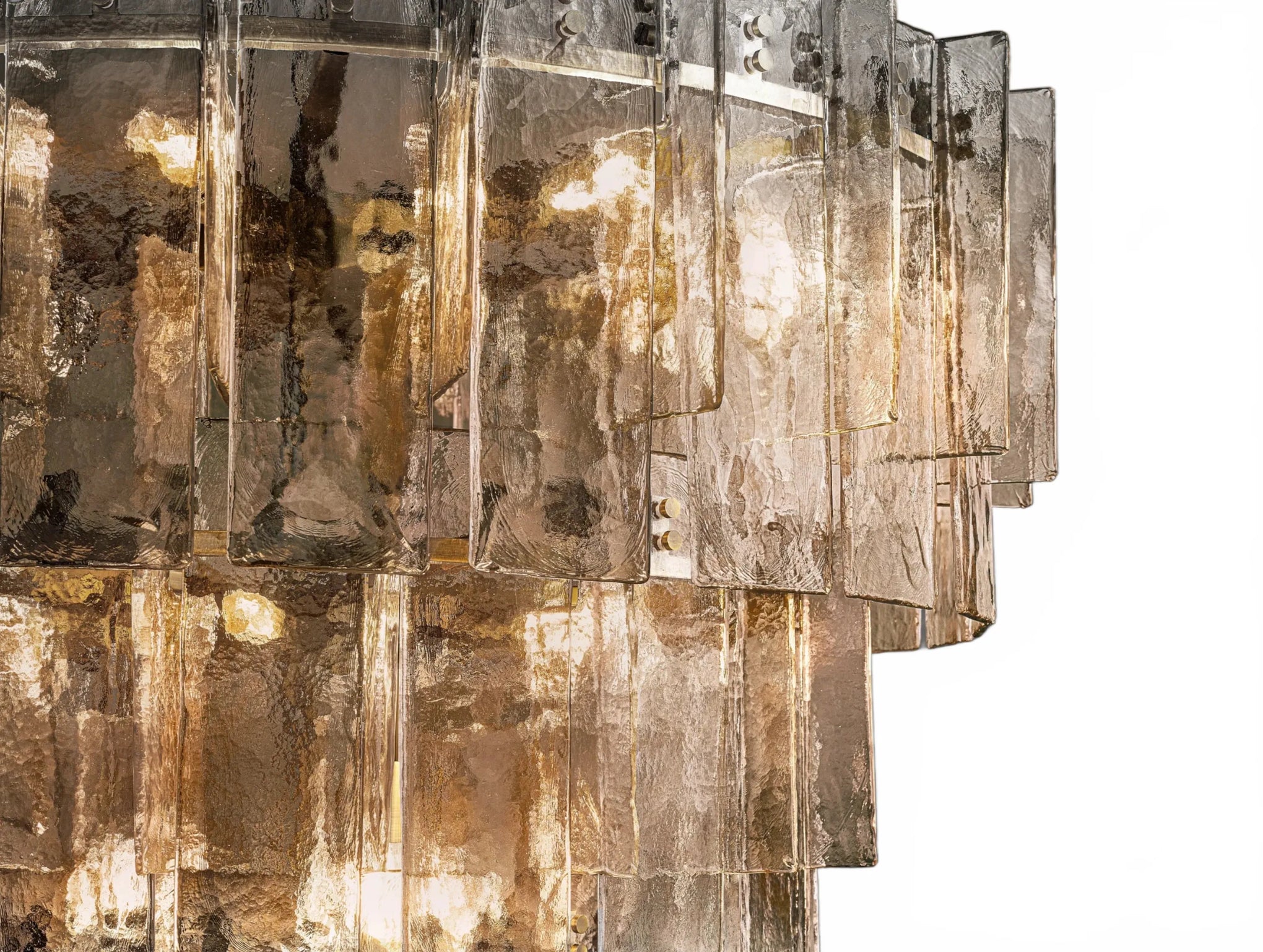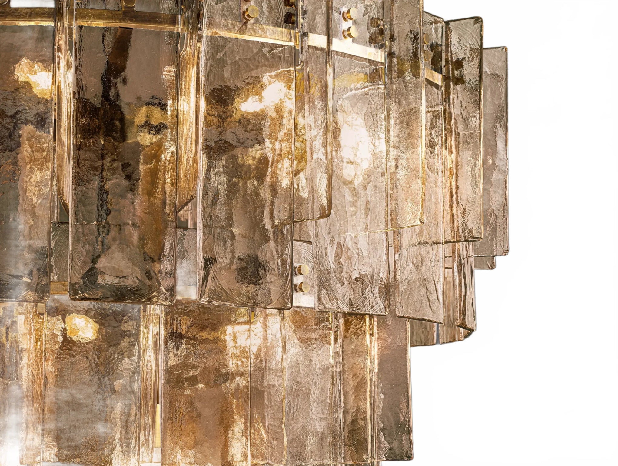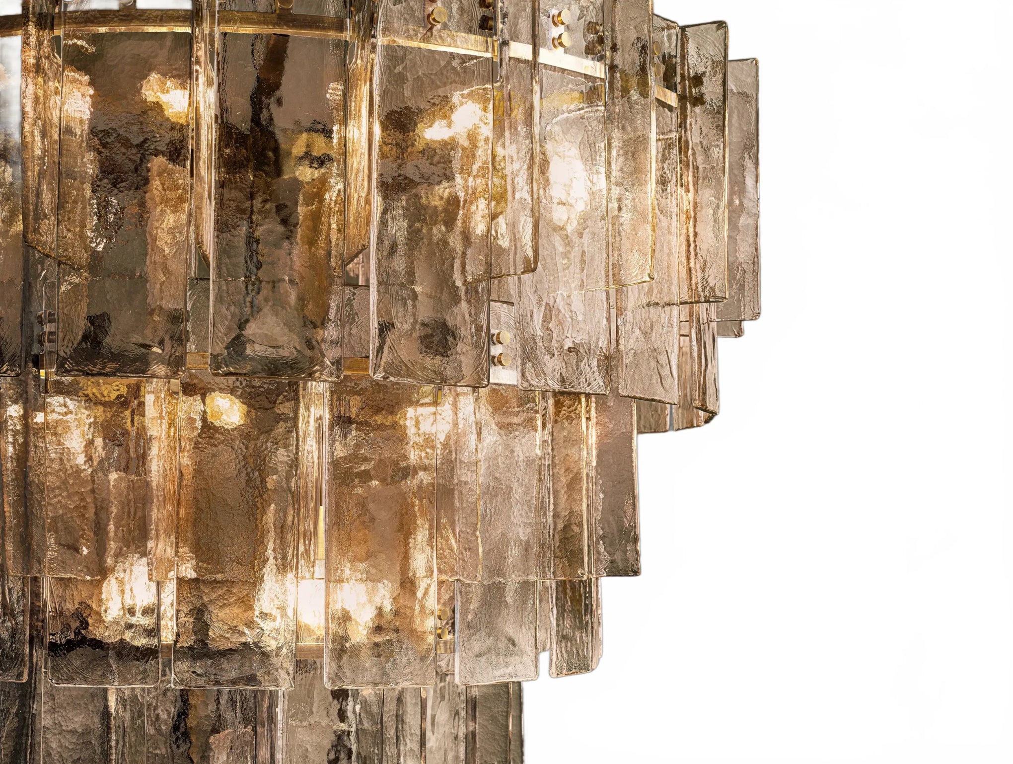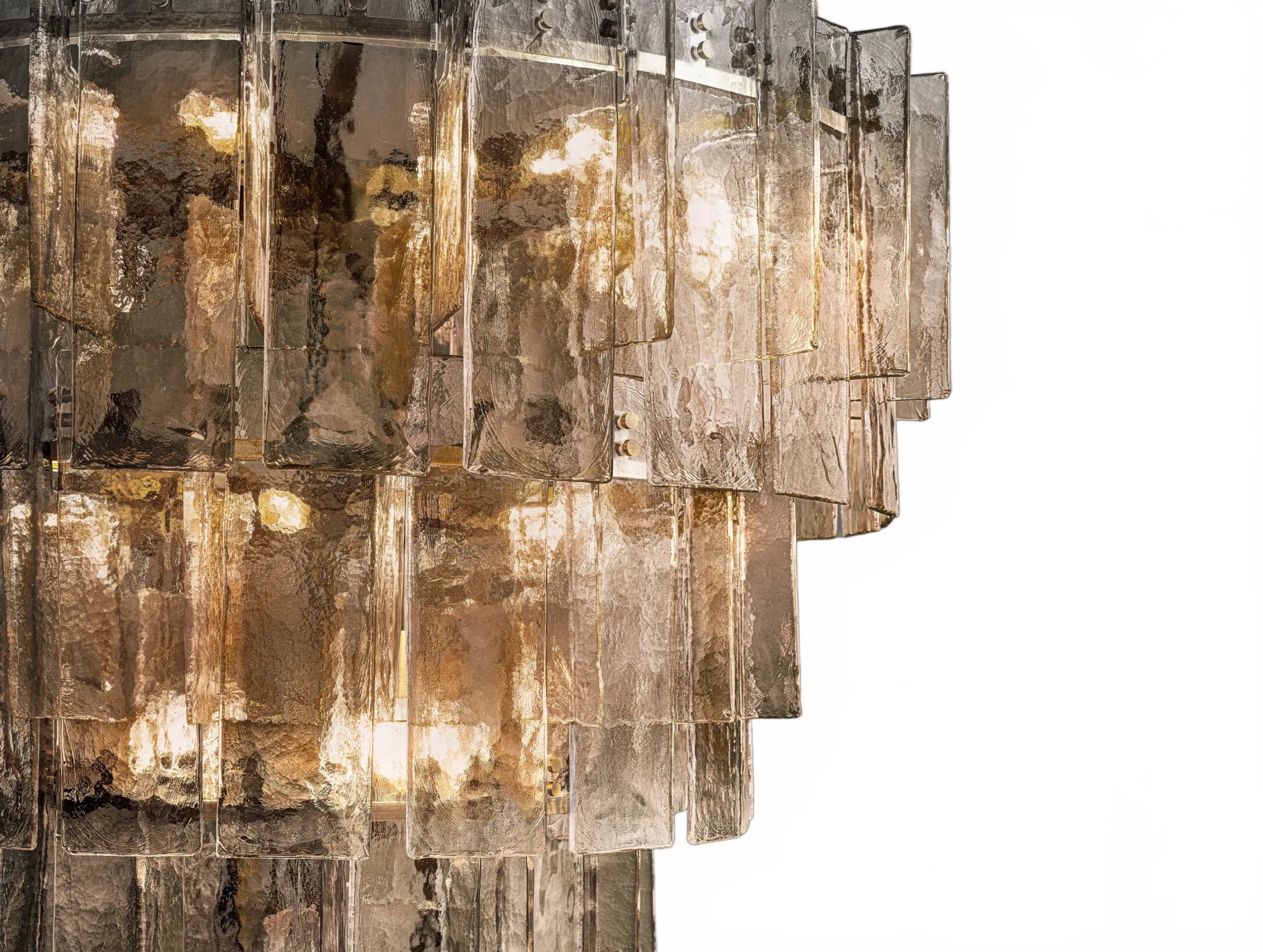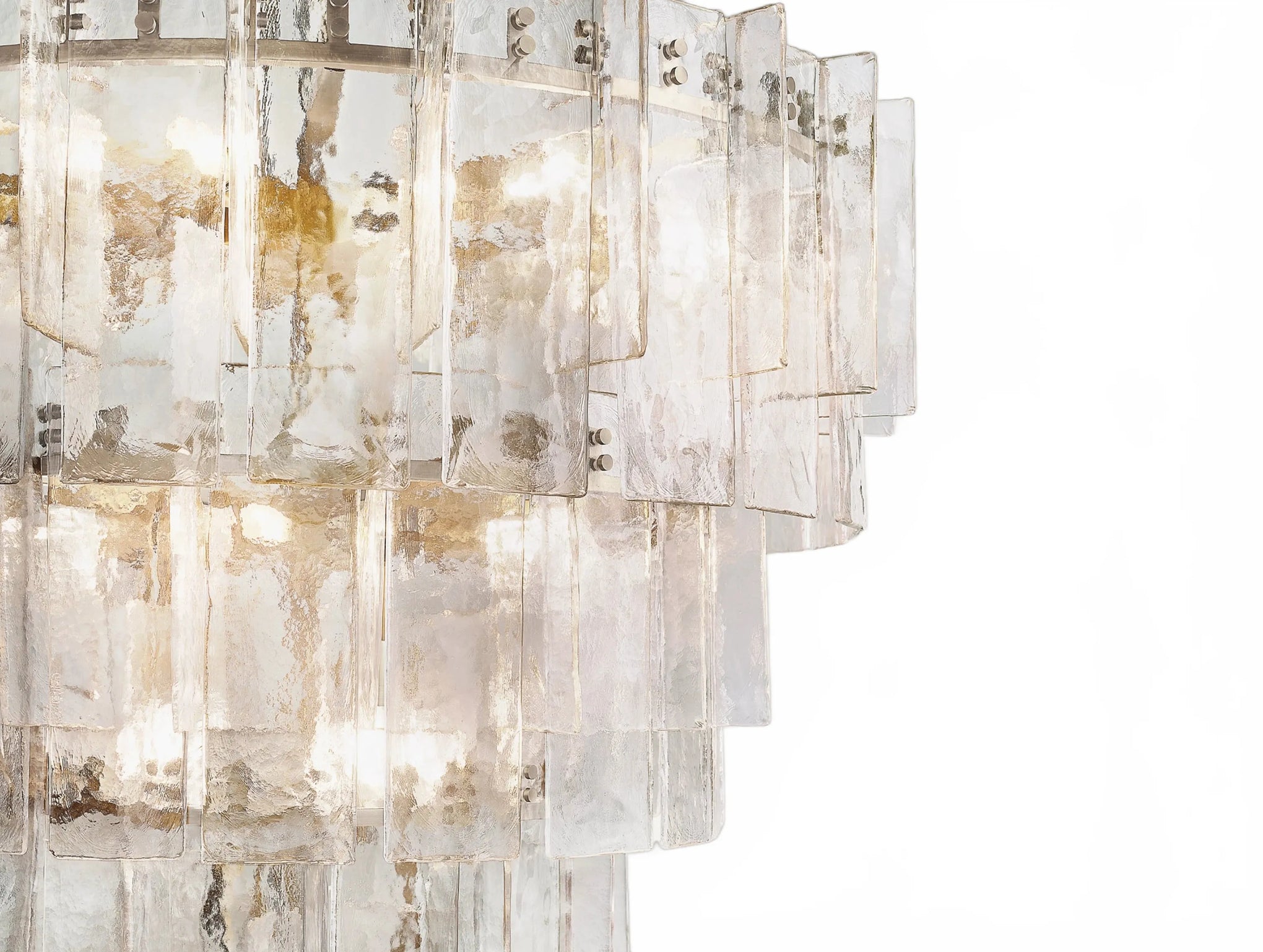 Airy and sculptural, the Dryice chandelier pairs cast glass with steel in a rhythmic, multi-layered silhouette influenced by midcentury geometry. Each ripple-textured glass panel is shaped in a custom mold, producing soft contours and radiant depth. Offered in two sizes to complement diverse interiors, both styles feature integrated dimmer compatibility and adjustable-length rods. Whether showcased as a focal point in a lofty foyer or above a modern dining table, Dryice imparts architectural elegance and luminous warmth.