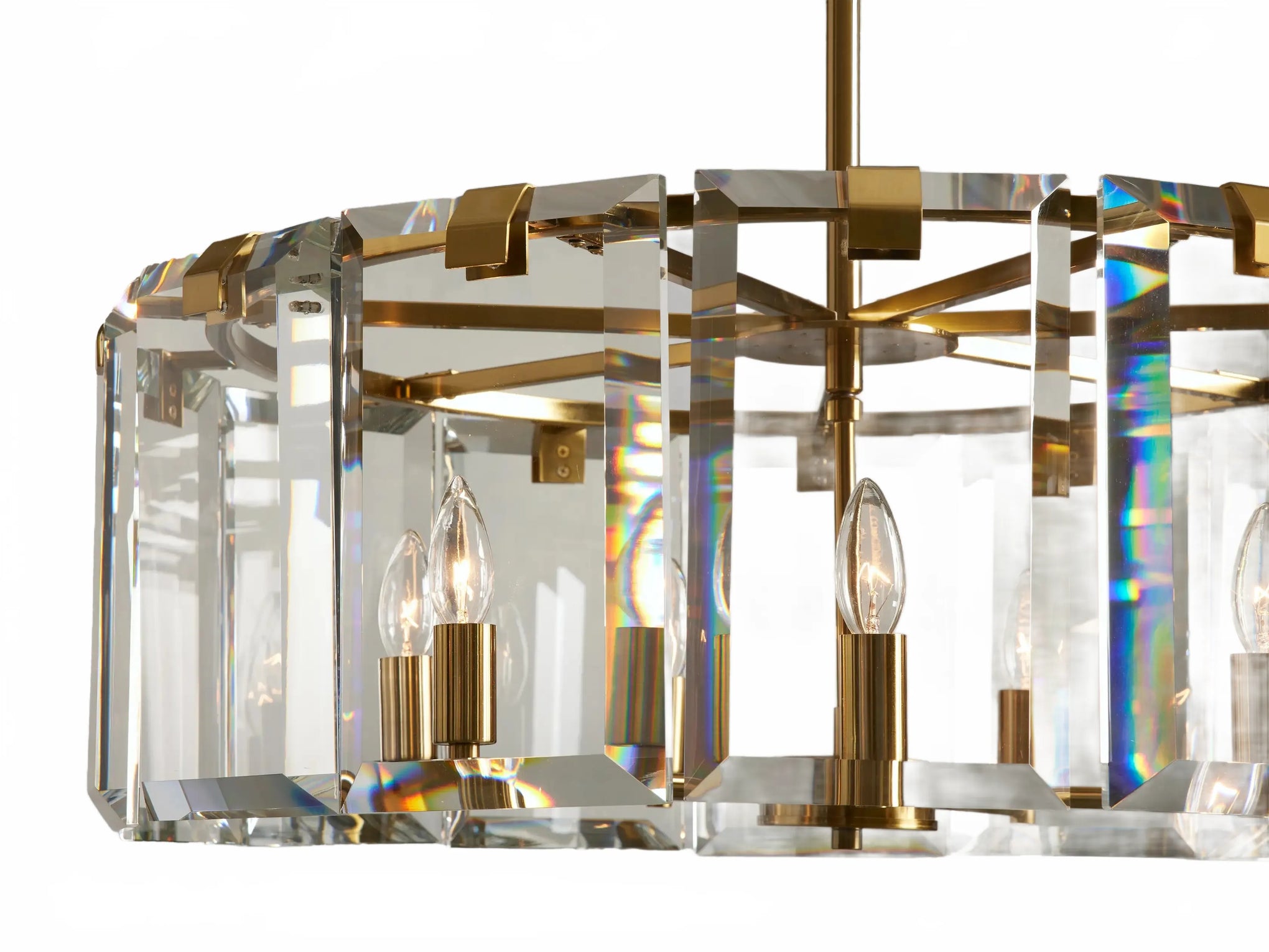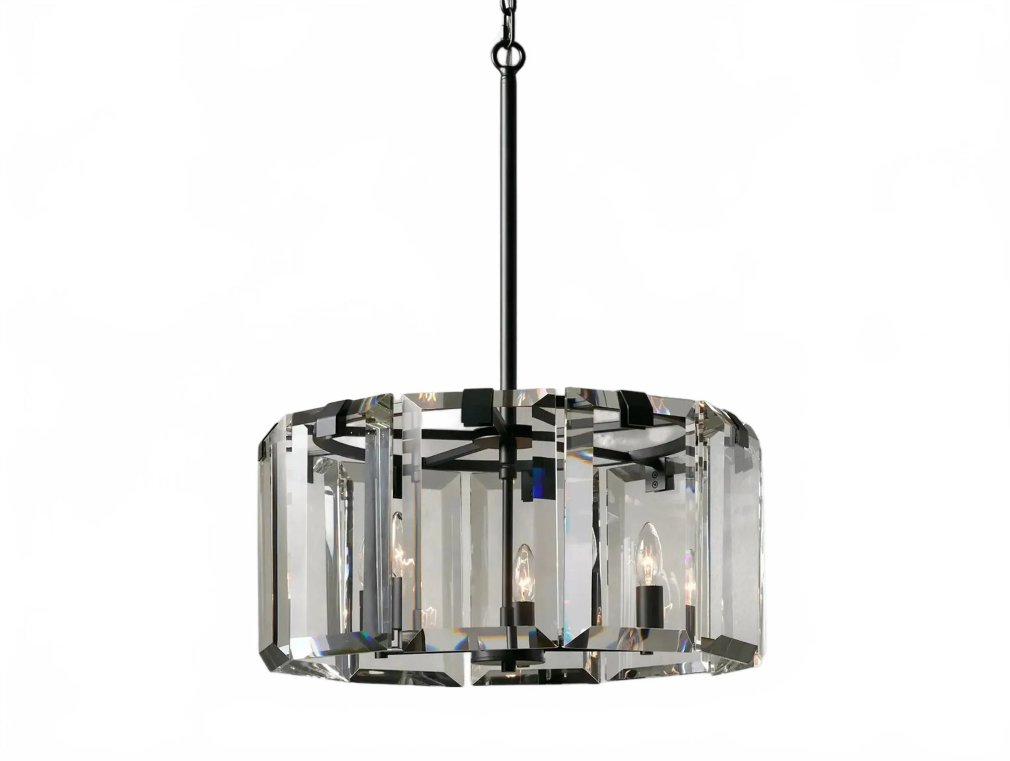 Part of our sculptural Amaya Collection, the Kamaya Circular Chandelier contrasts thick, faceted clear crystals with a slender iron frame in either black or brass-plated options. With its open, circular profile and ample drop length, it offers a bold, luxurious radiance to dining spaces, entryways, or living rooms.
