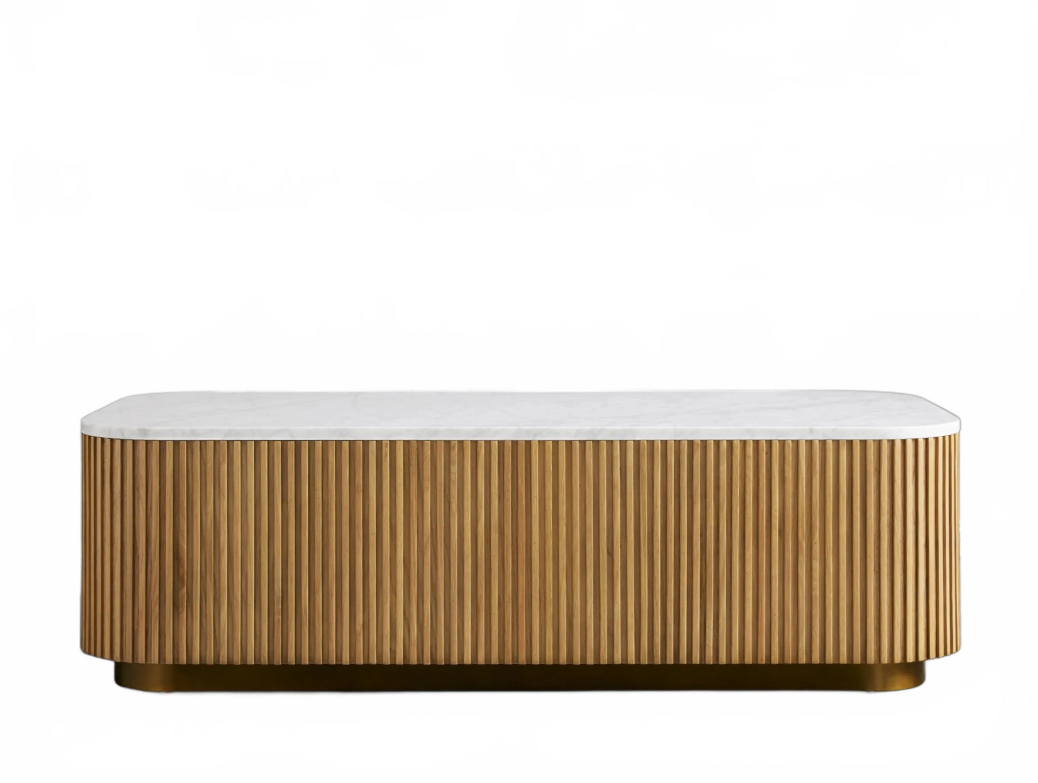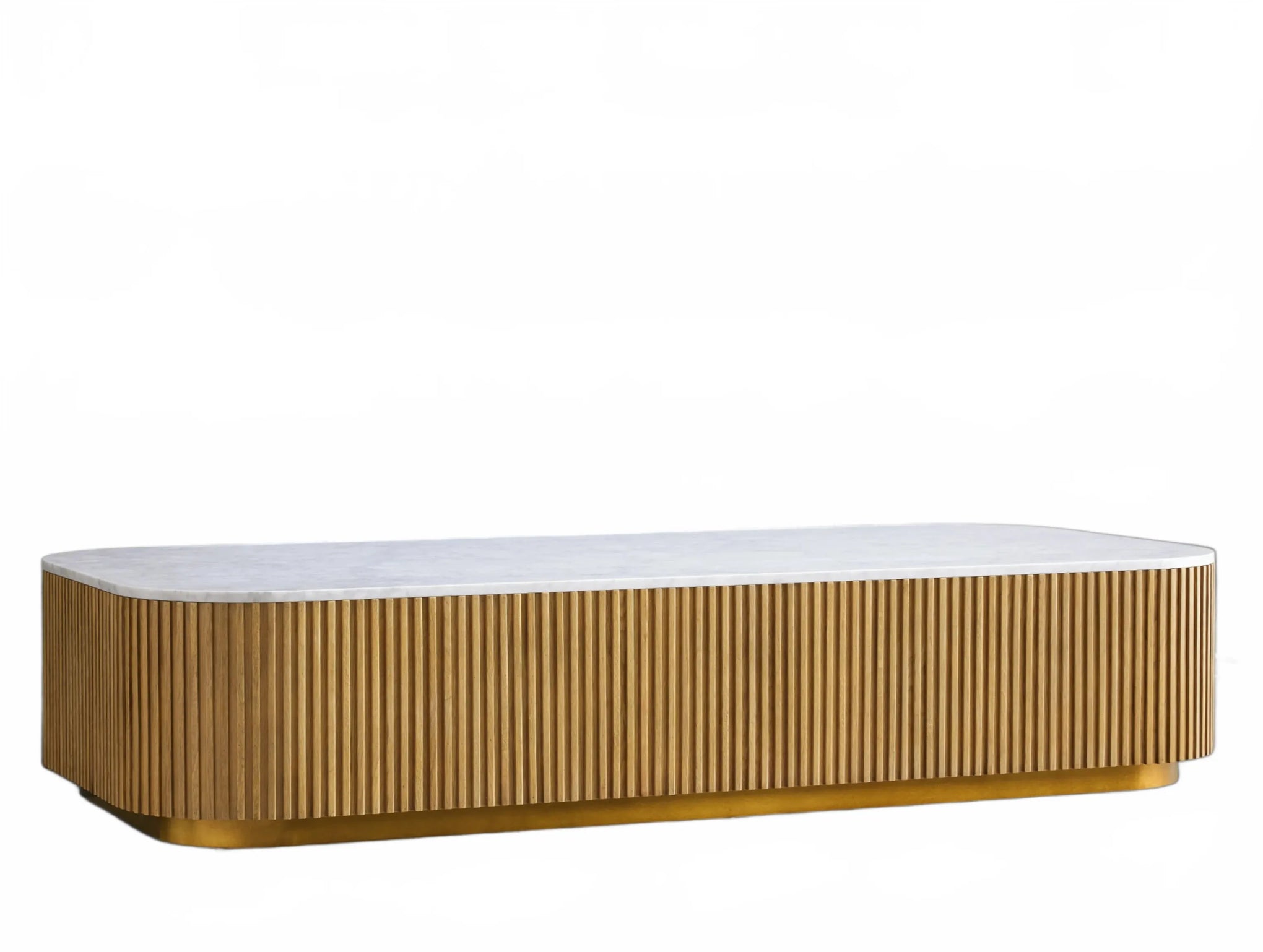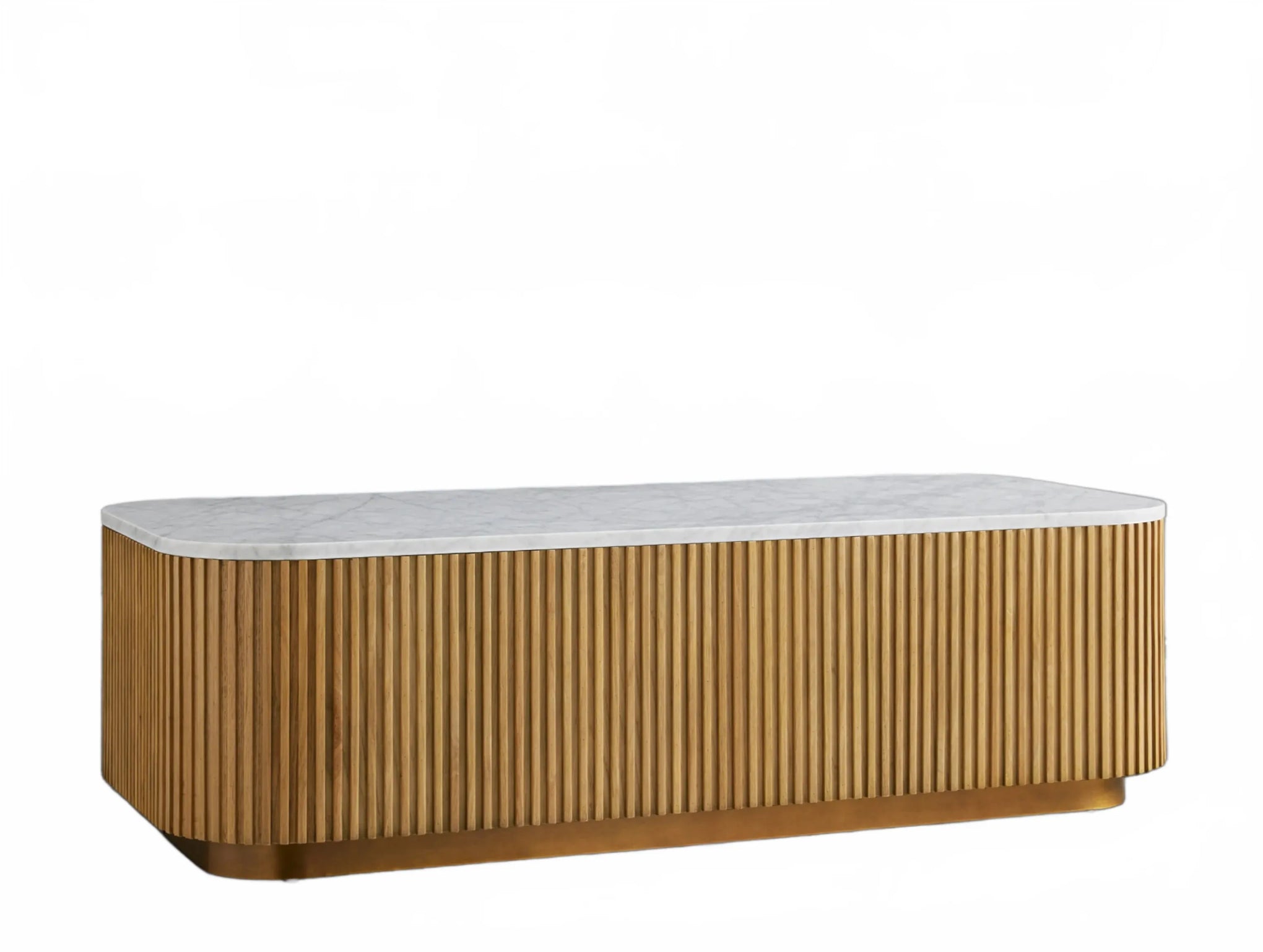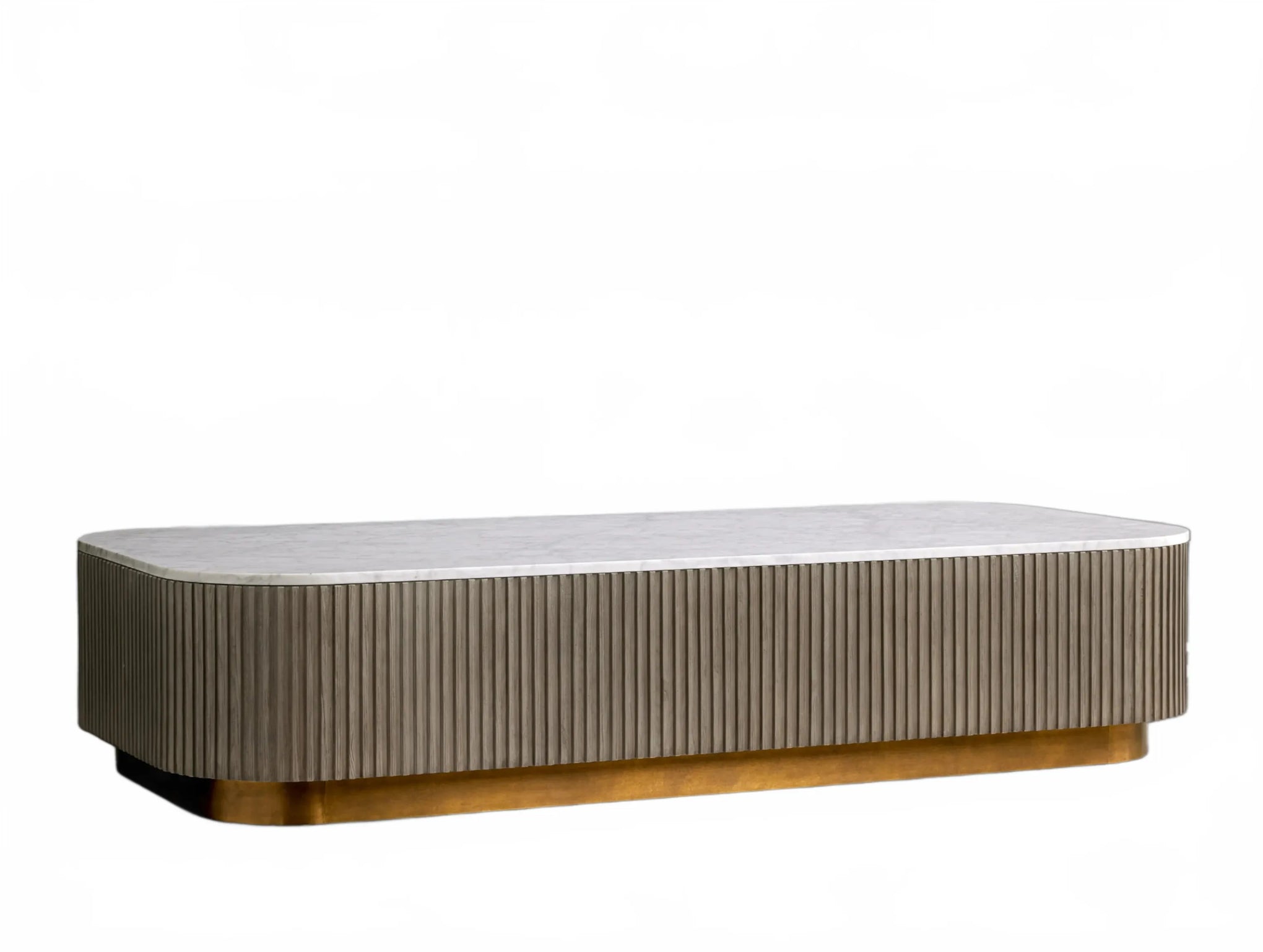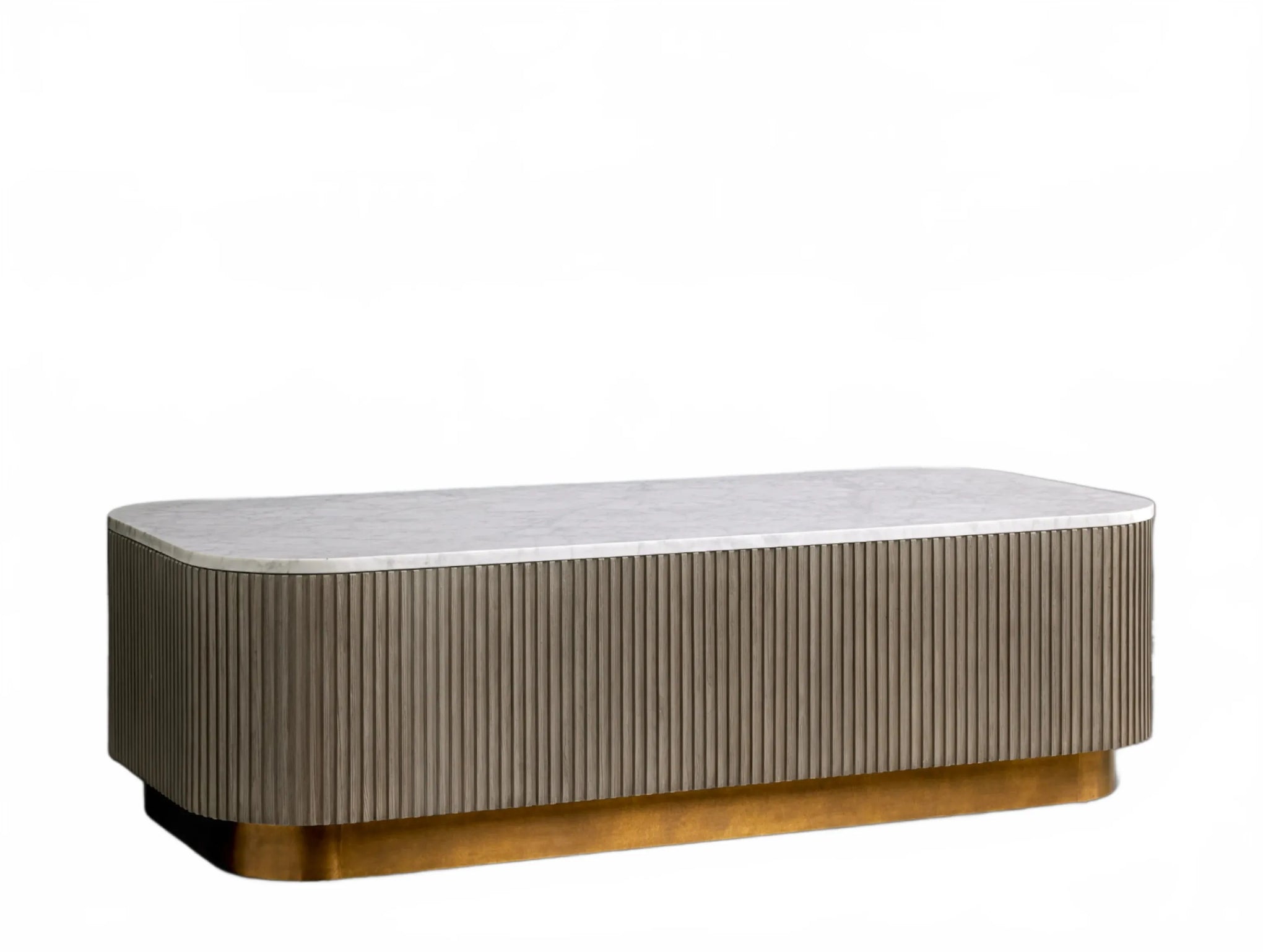 The Rolphin coffee table presents a sophisticated mixed-material composition that marries natural wood with elegant stone. Hand-finished Finnish pine or premium white oak is paired with reeded oak detailing and crowned with stone in white marble or bluestone. A brass-finished plinth base finalizes the aesthetic, delivering refined style and lasting durability—an attention-grabbing centerpiece for every living space.