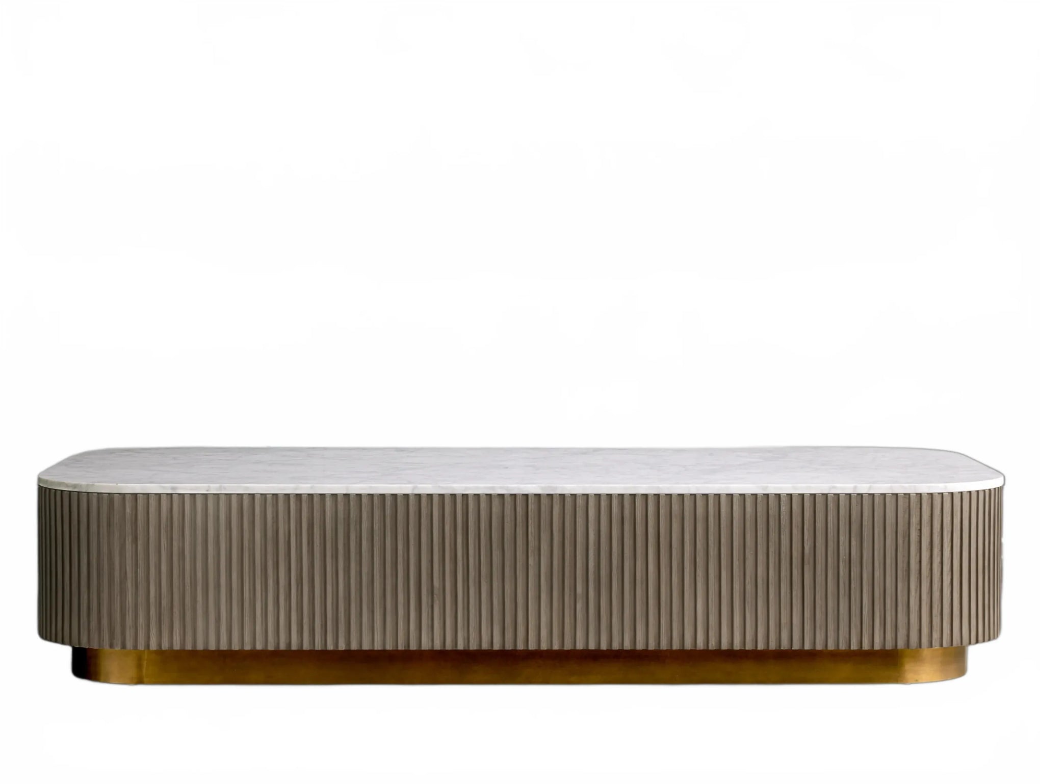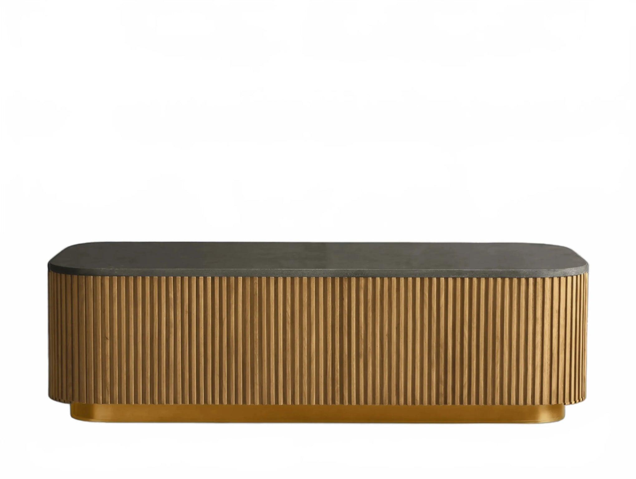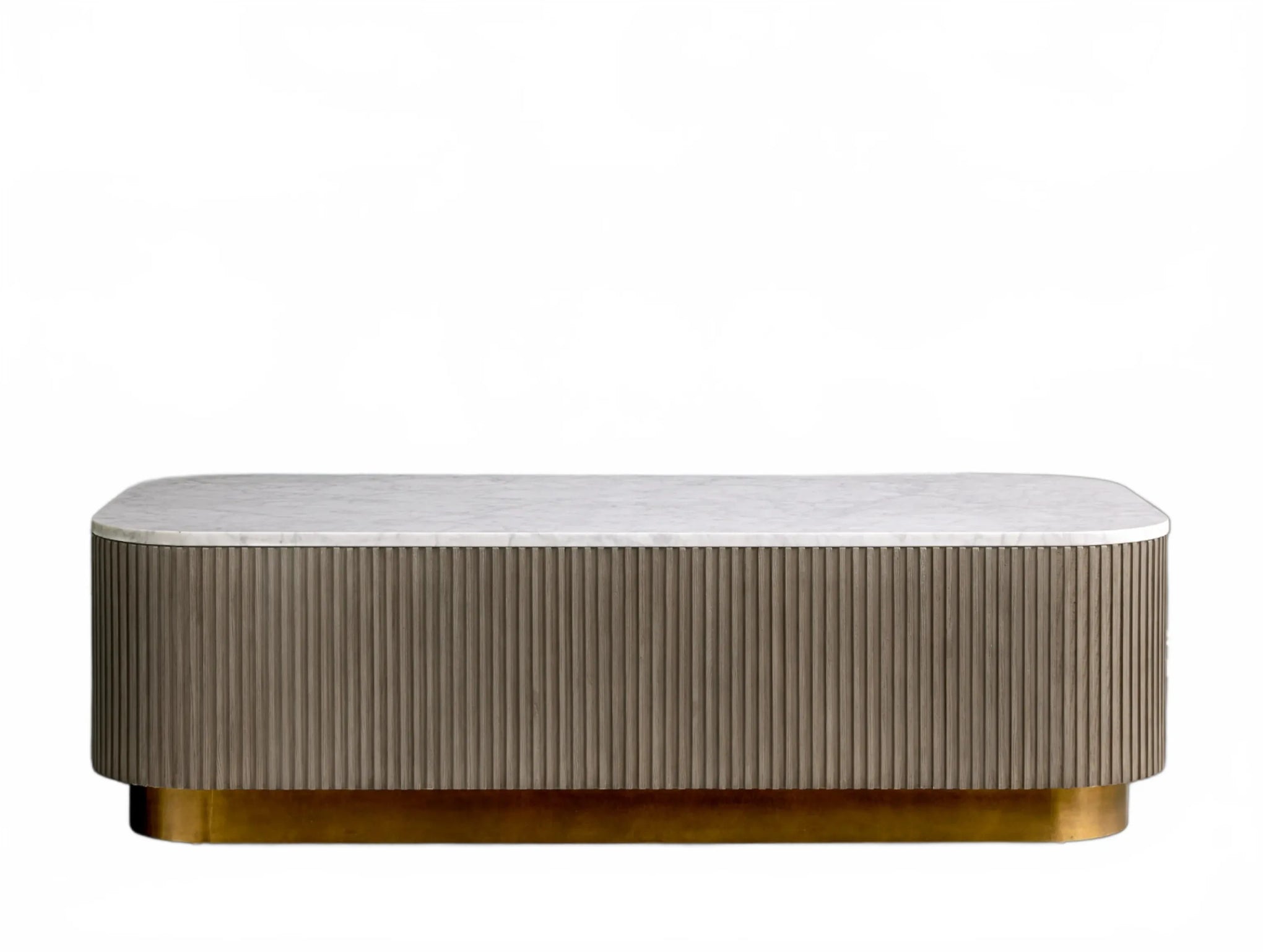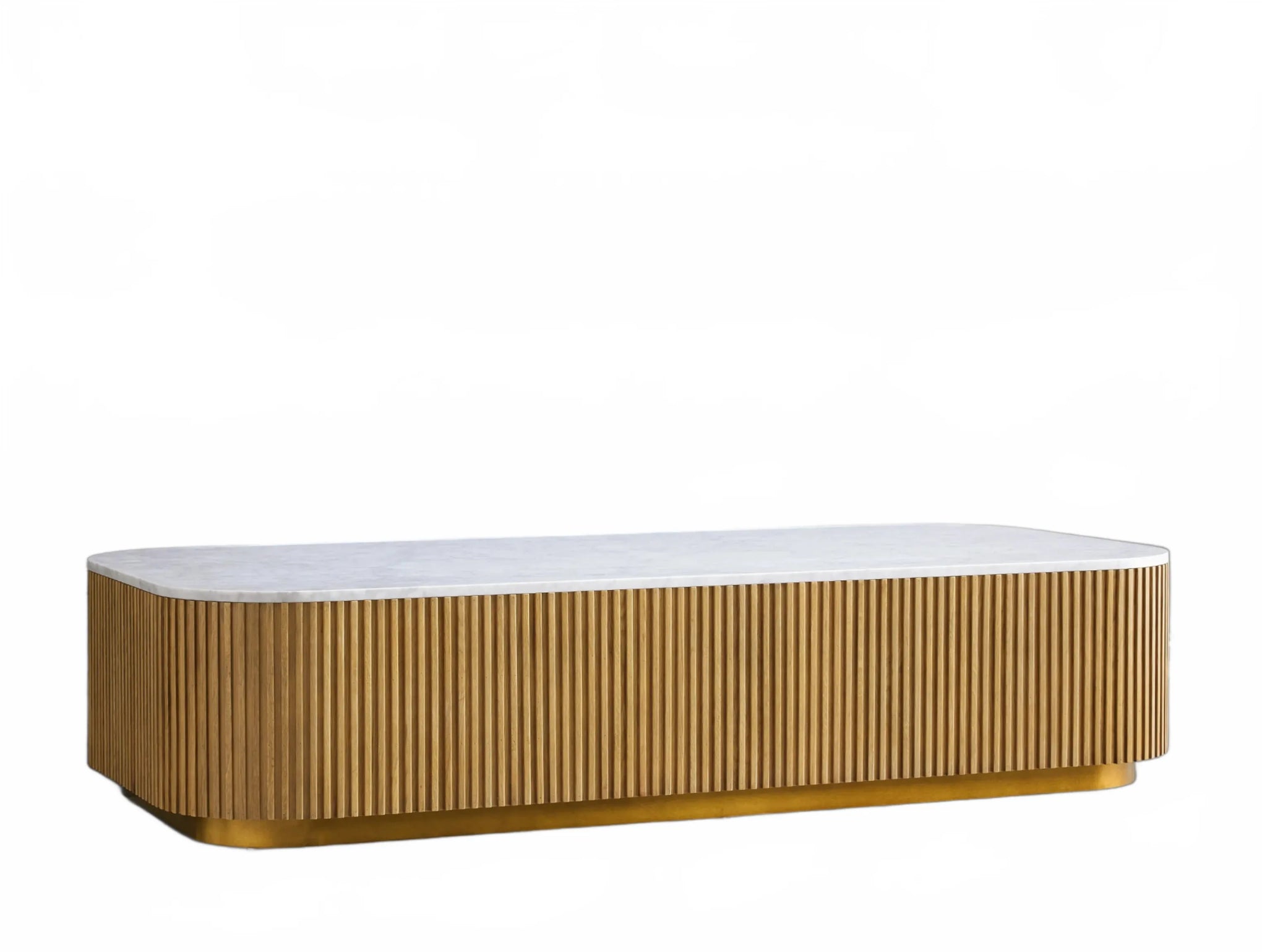 The Rolphin coffee table presents a sophisticated mixed-material composition that marries natural wood with elegant stone. Hand-finished Finnish pine or premium white oak is paired with reeded oak detailing and crowned with stone in white marble or bluestone. A brass-finished plinth base finalizes the aesthetic, delivering refined style and lasting durability—an attention-grabbing centerpiece for every living space.