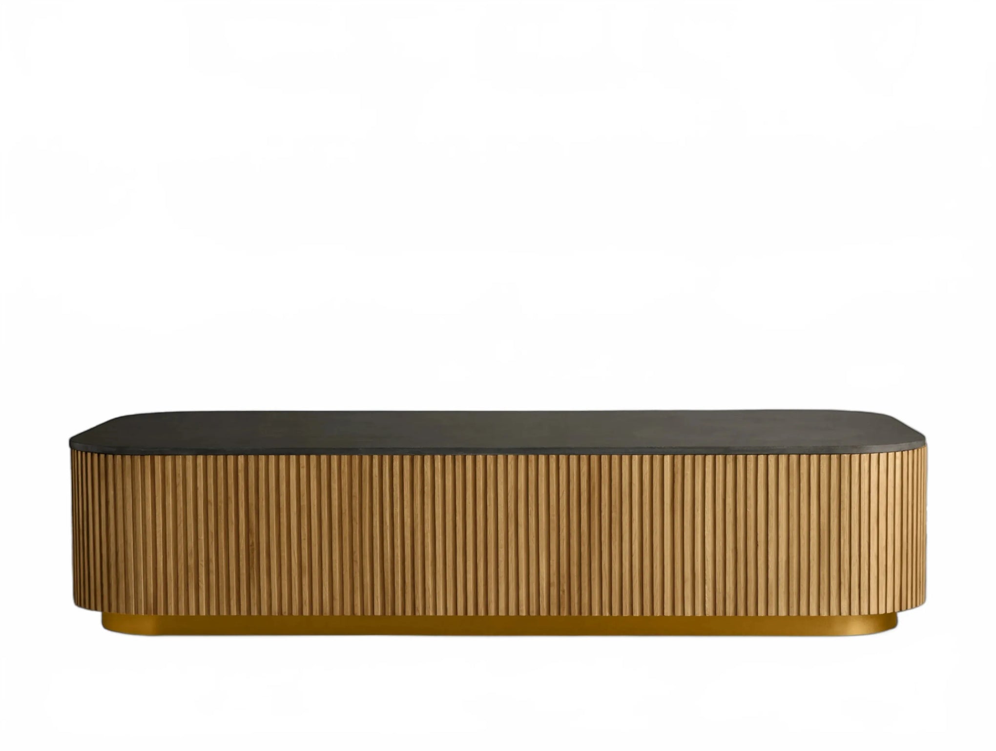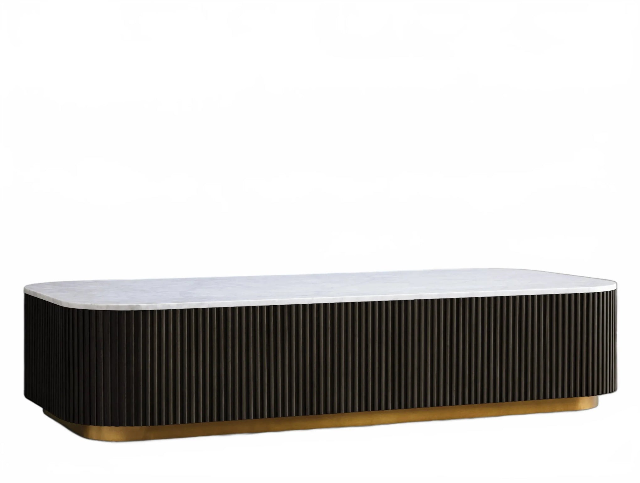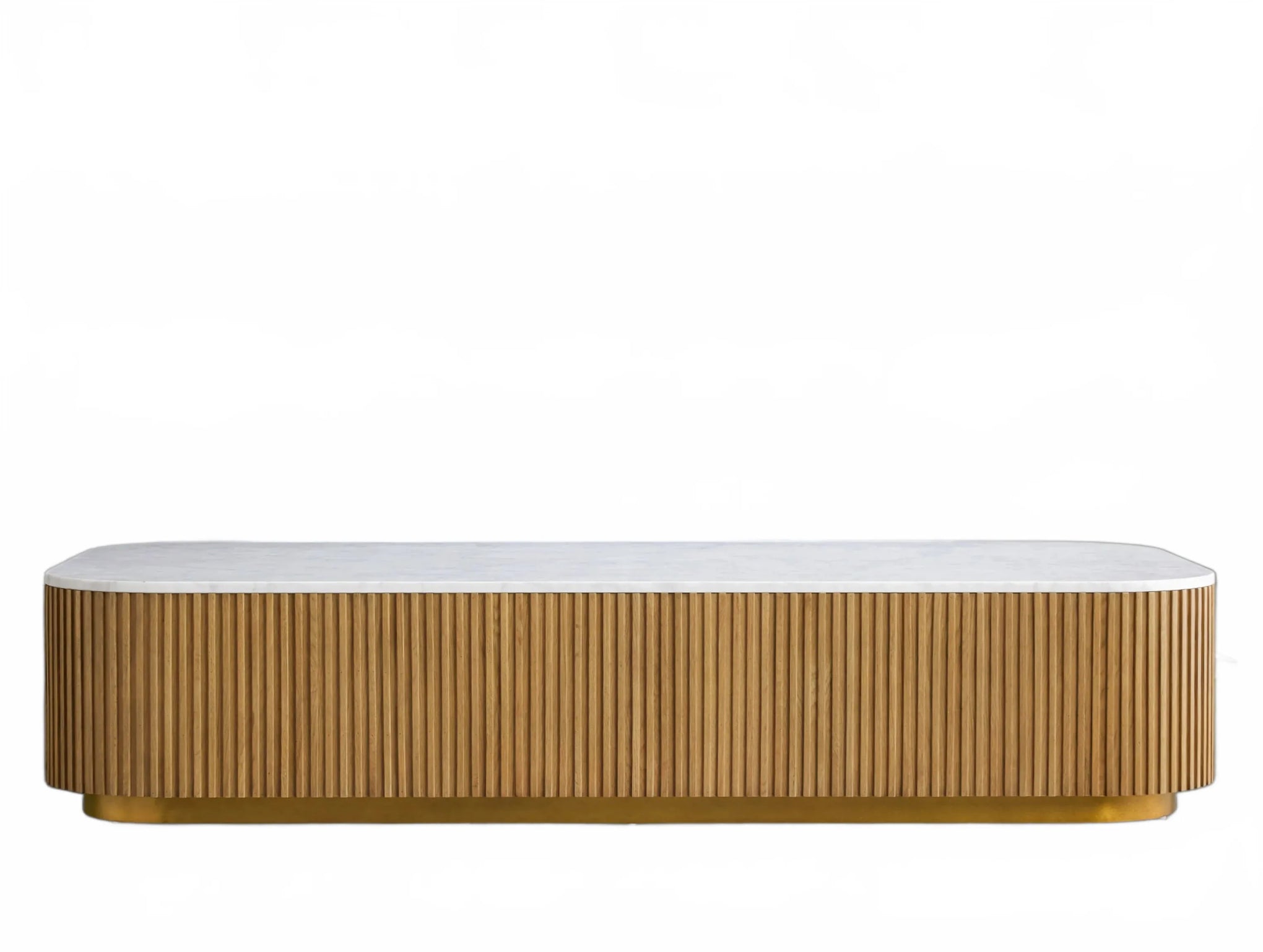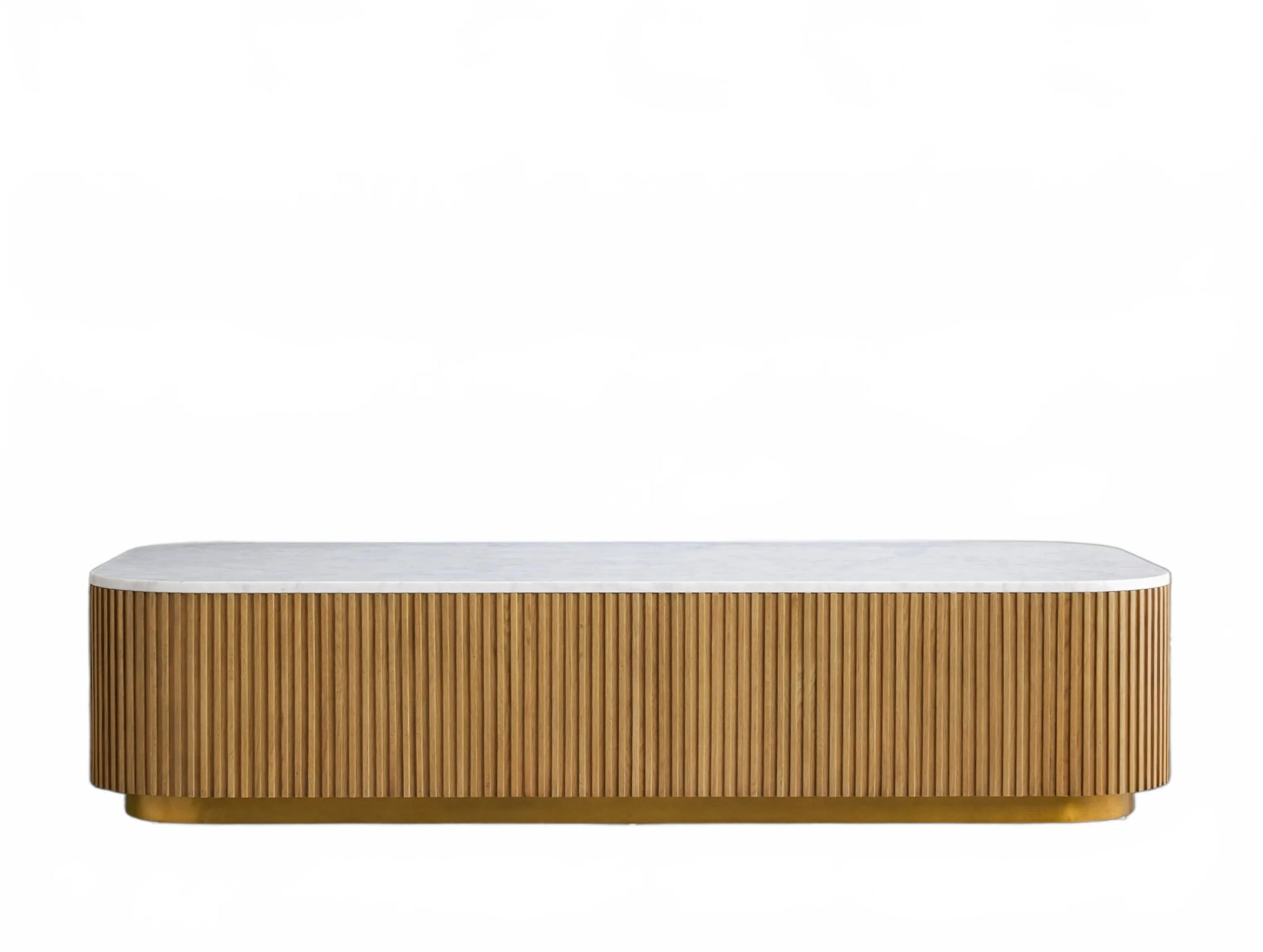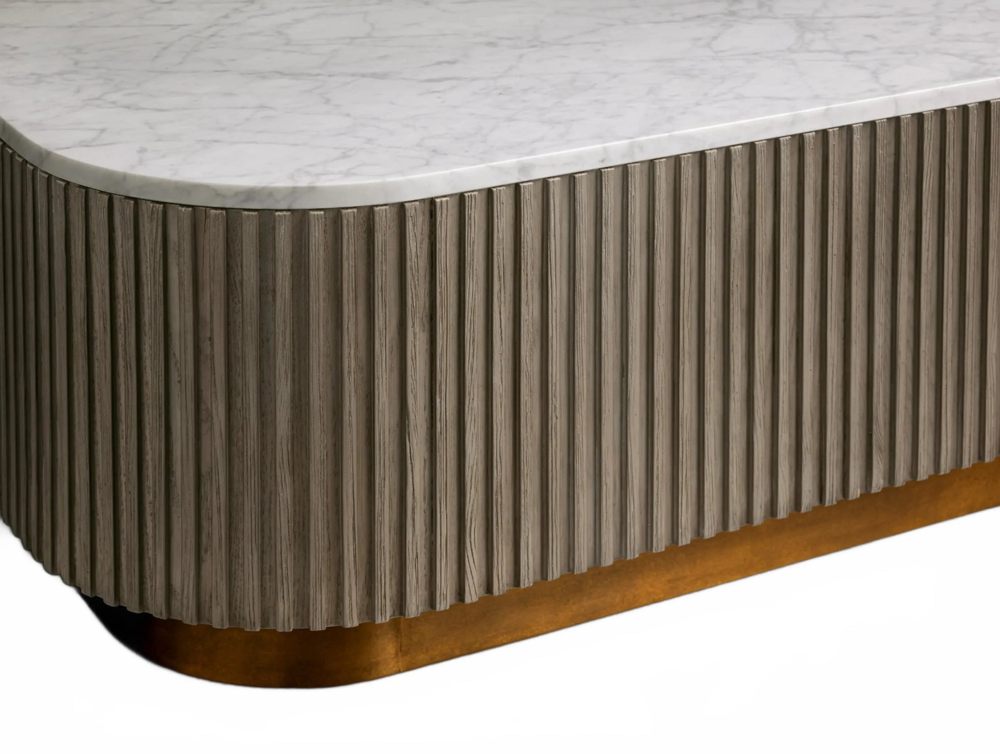 The Rolphin coffee table presents a sophisticated mixed-material composition that marries natural wood with elegant stone. Hand-finished Finnish pine or premium white oak is paired with reeded oak detailing and crowned with stone in white marble or bluestone. A brass-finished plinth base finalizes the aesthetic, delivering refined style and lasting durability—an attention-grabbing centerpiece for every living space.