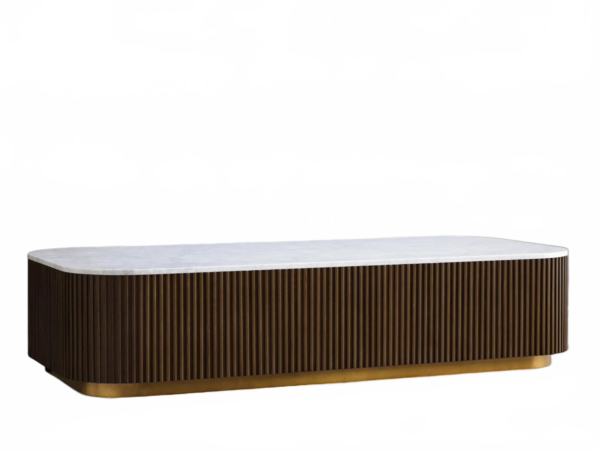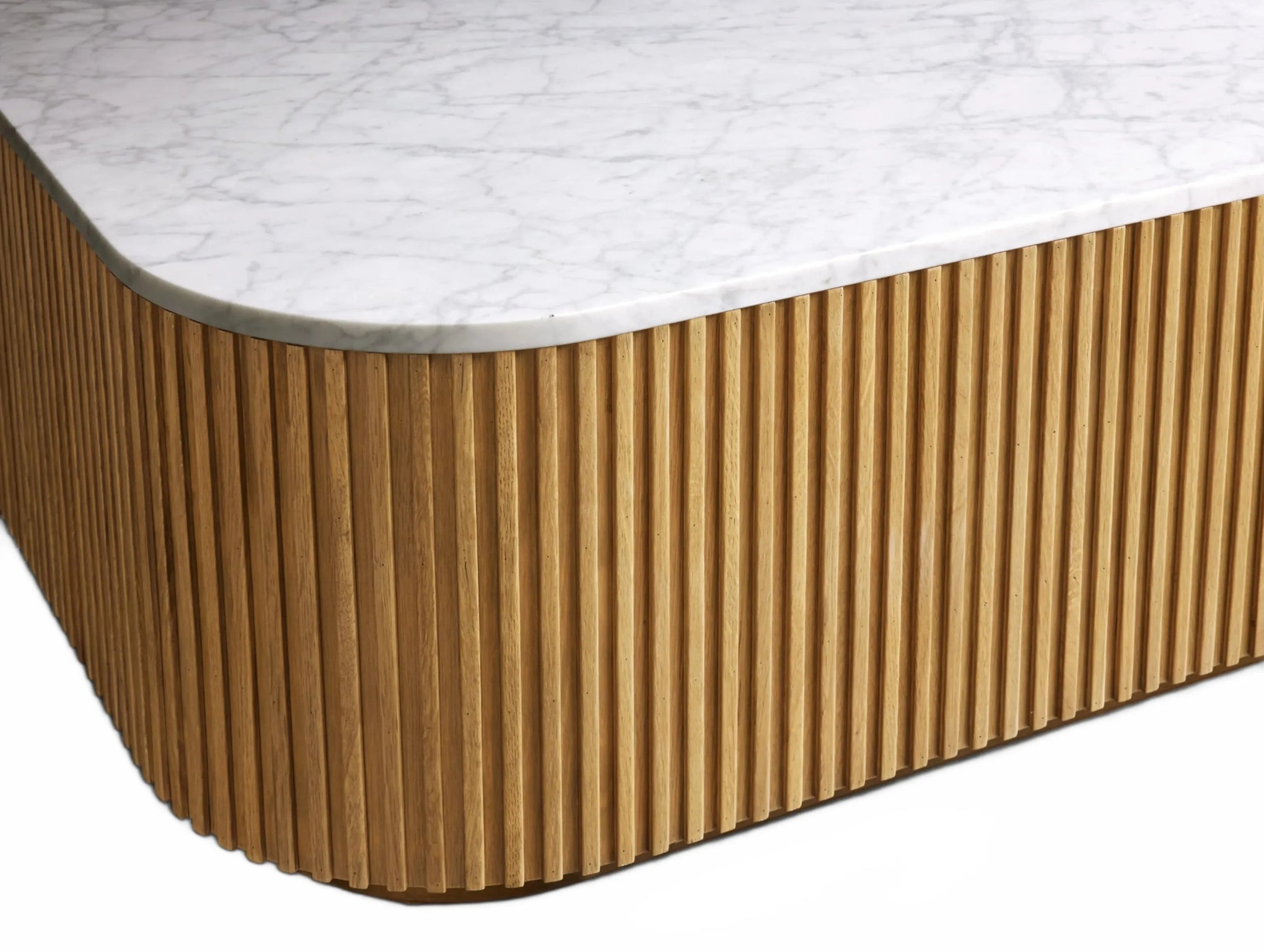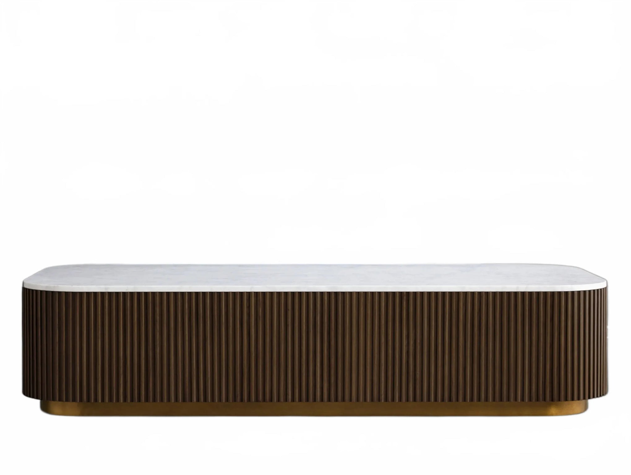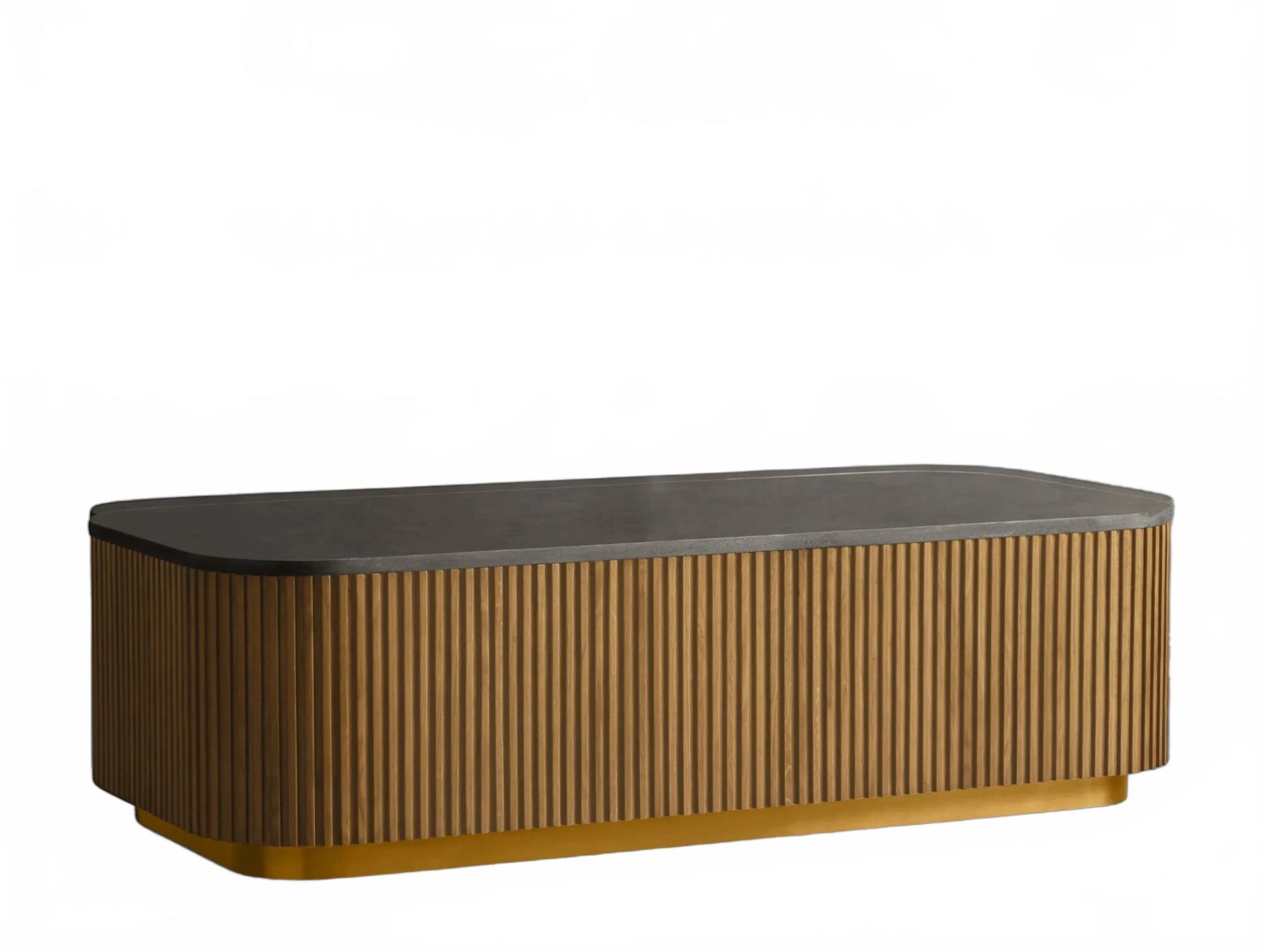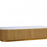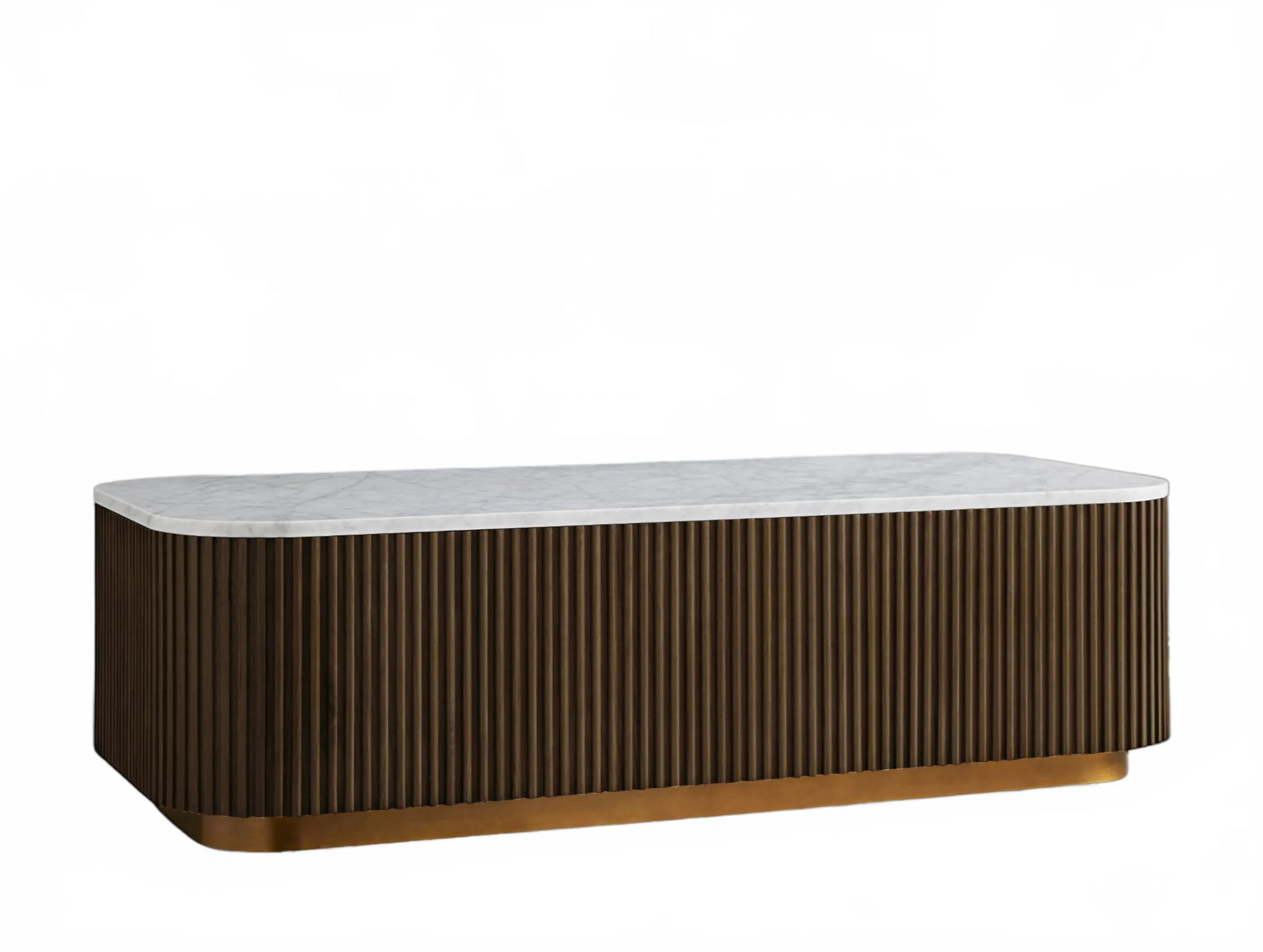 The Rolphin coffee table presents a sophisticated mixed-material composition that marries natural wood with elegant stone. Hand-finished Finnish pine or premium white oak is paired with reeded oak detailing and crowned with stone in white marble or bluestone. A brass-finished plinth base finalizes the aesthetic, delivering refined style and lasting durability—an attention-grabbing centerpiece for every living space.