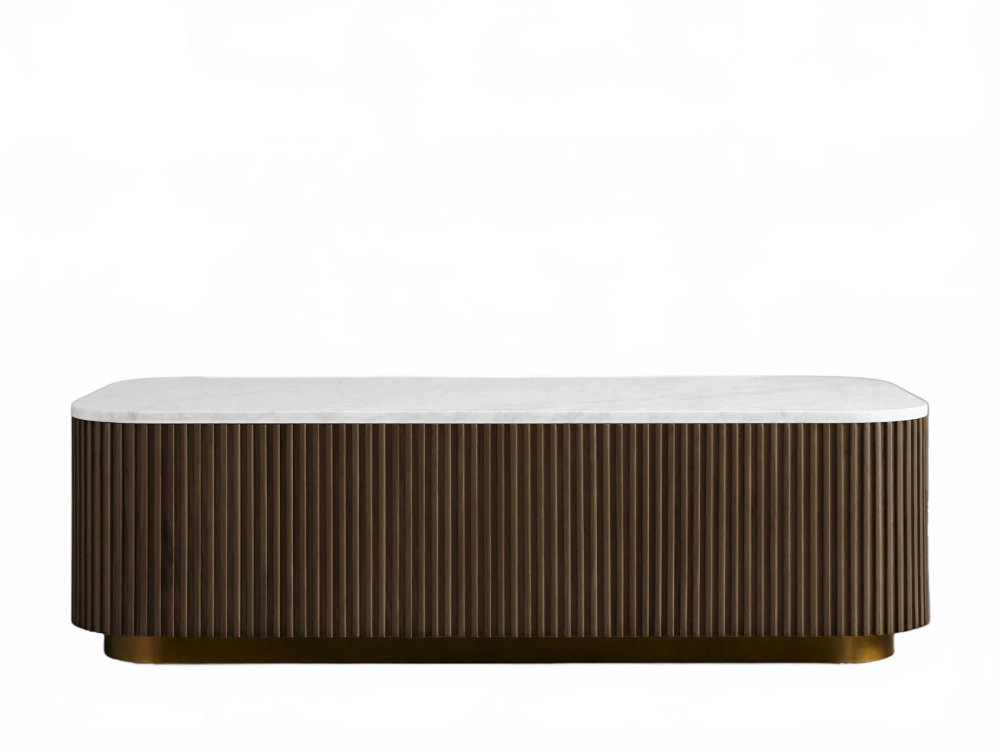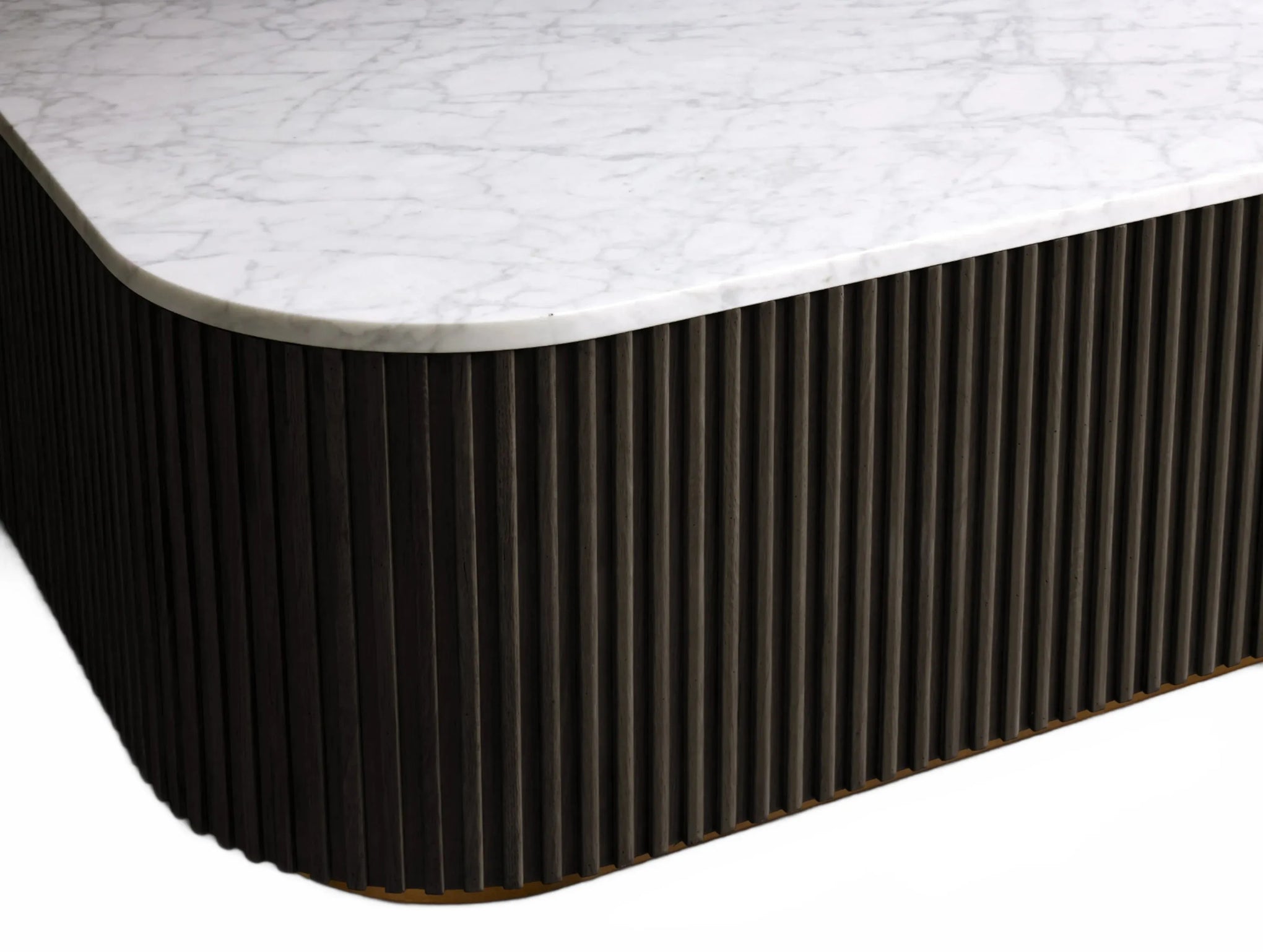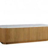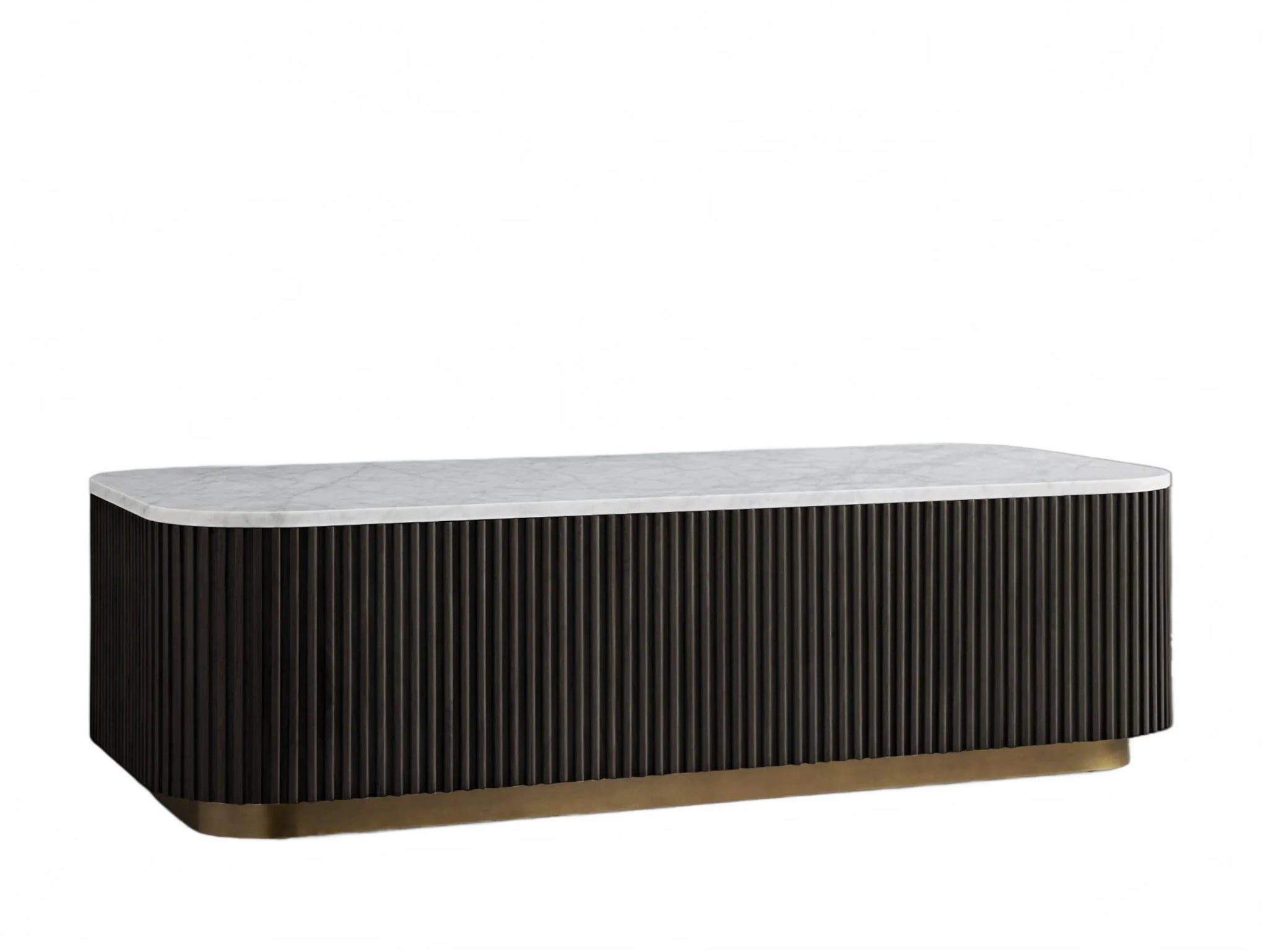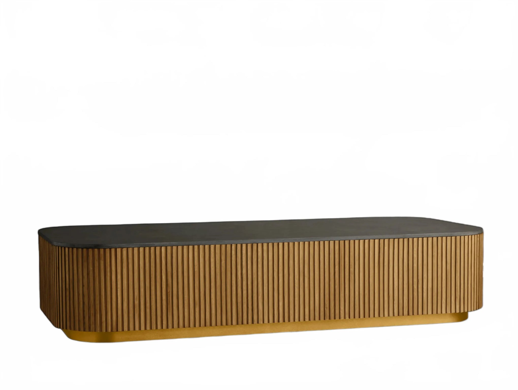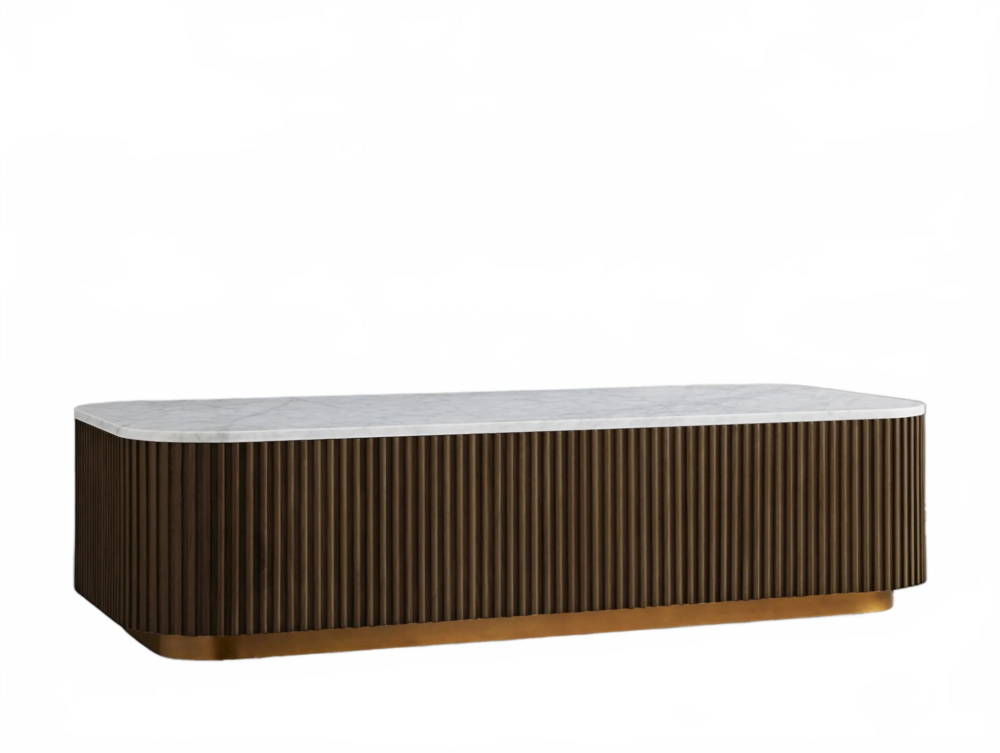 The Rolphin coffee table presents a sophisticated mixed-material composition that marries natural wood with elegant stone. Hand-finished Finnish pine or premium white oak is paired with reeded oak detailing and crowned with stone in white marble or bluestone. A brass-finished plinth base finalizes the aesthetic, delivering refined style and lasting durability—an attention-grabbing centerpiece for every living space.