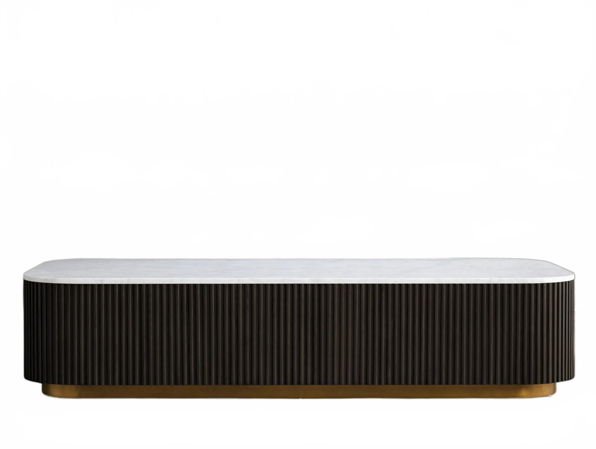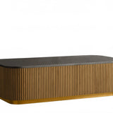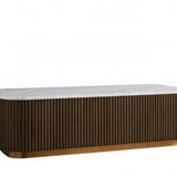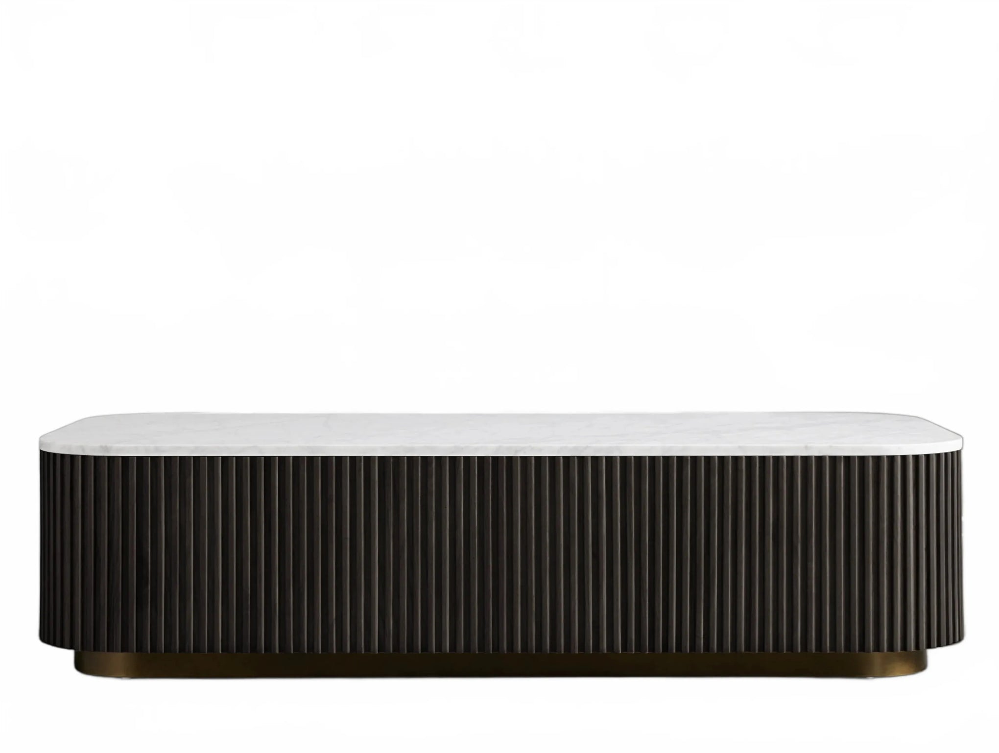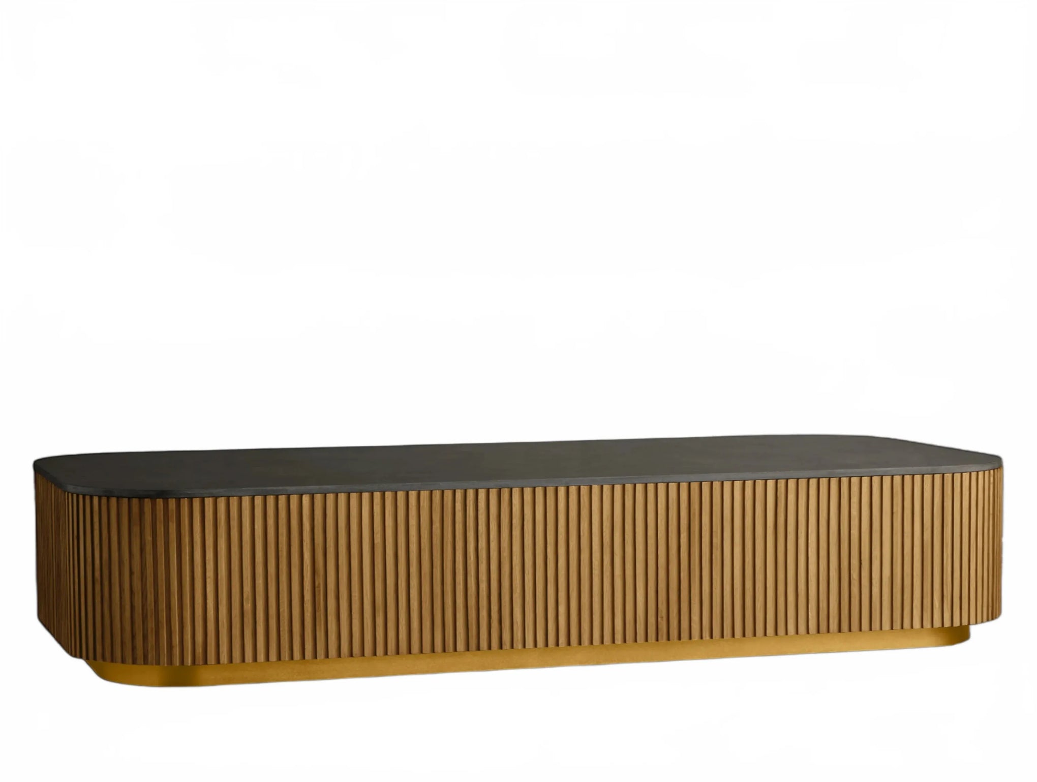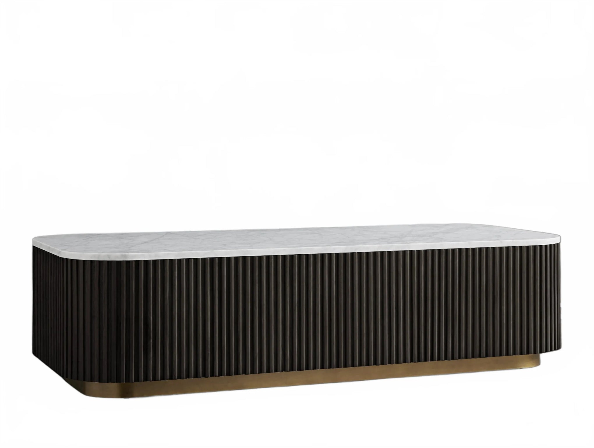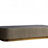 The Rolphin coffee table presents a sophisticated mixed-material composition that marries natural wood with elegant stone. Hand-finished Finnish pine or premium white oak is paired with reeded oak detailing and crowned with stone in white marble or bluestone. A brass-finished plinth base finalizes the aesthetic, delivering refined style and lasting durability—an attention-grabbing centerpiece for every living space.