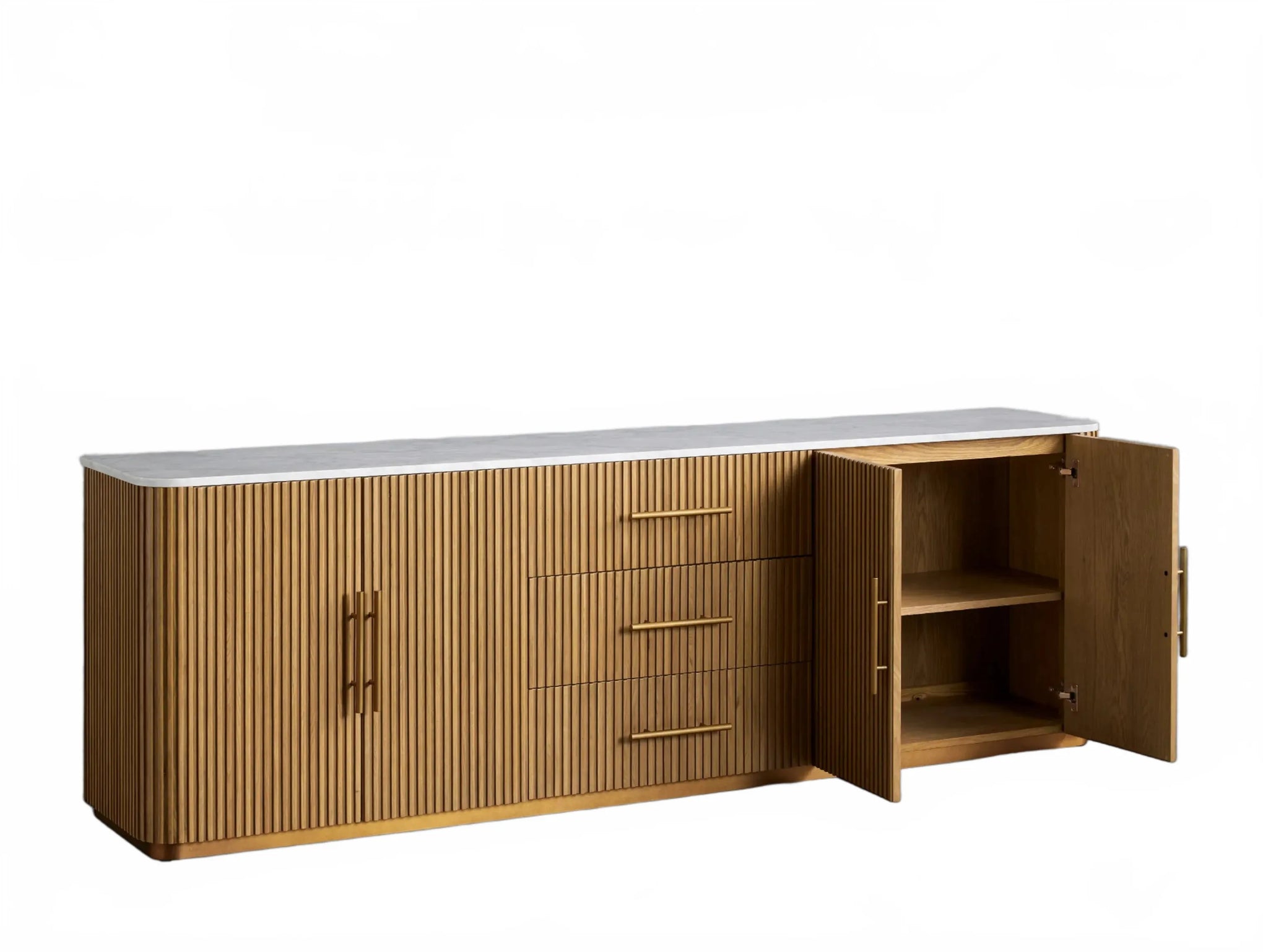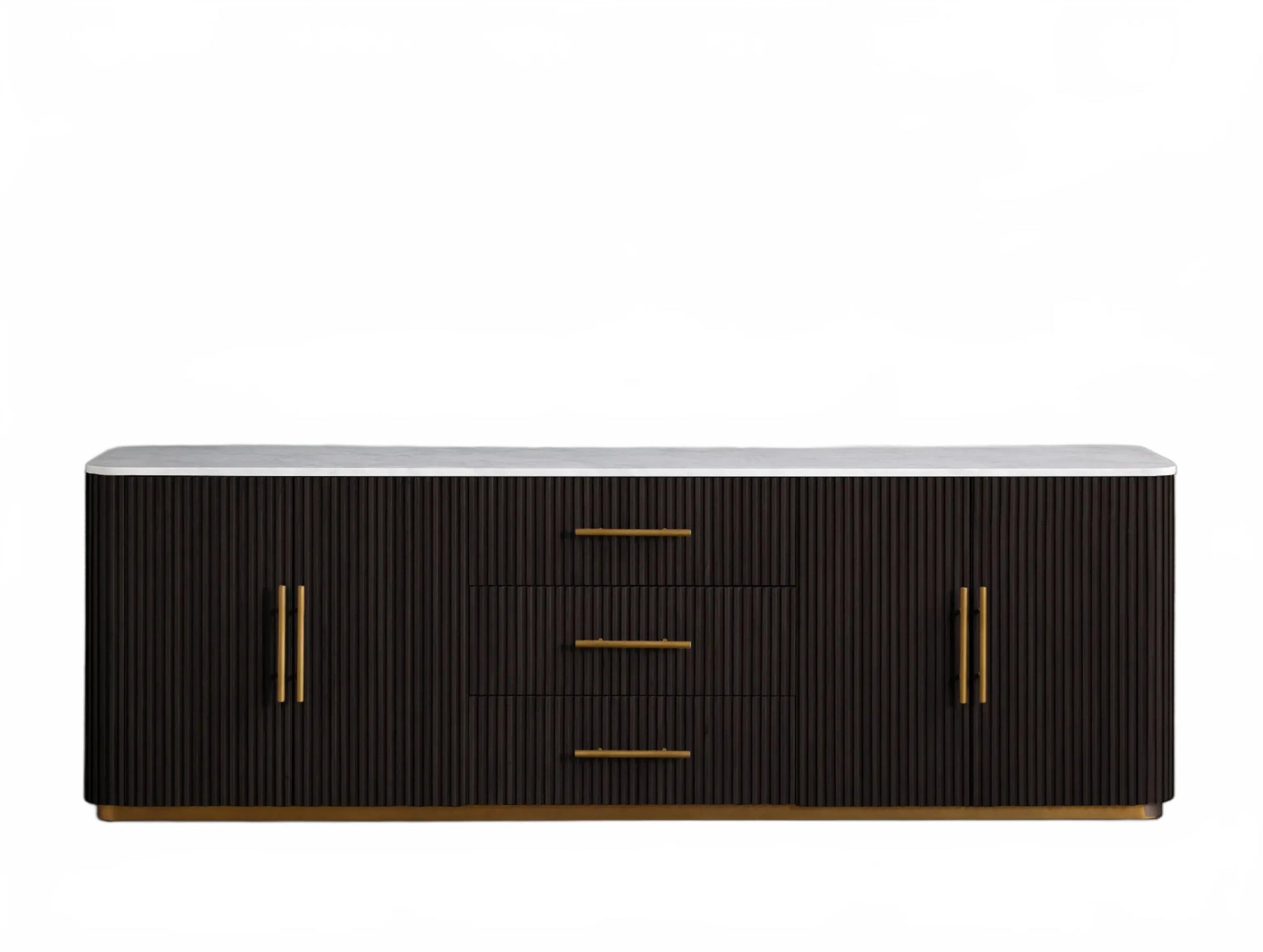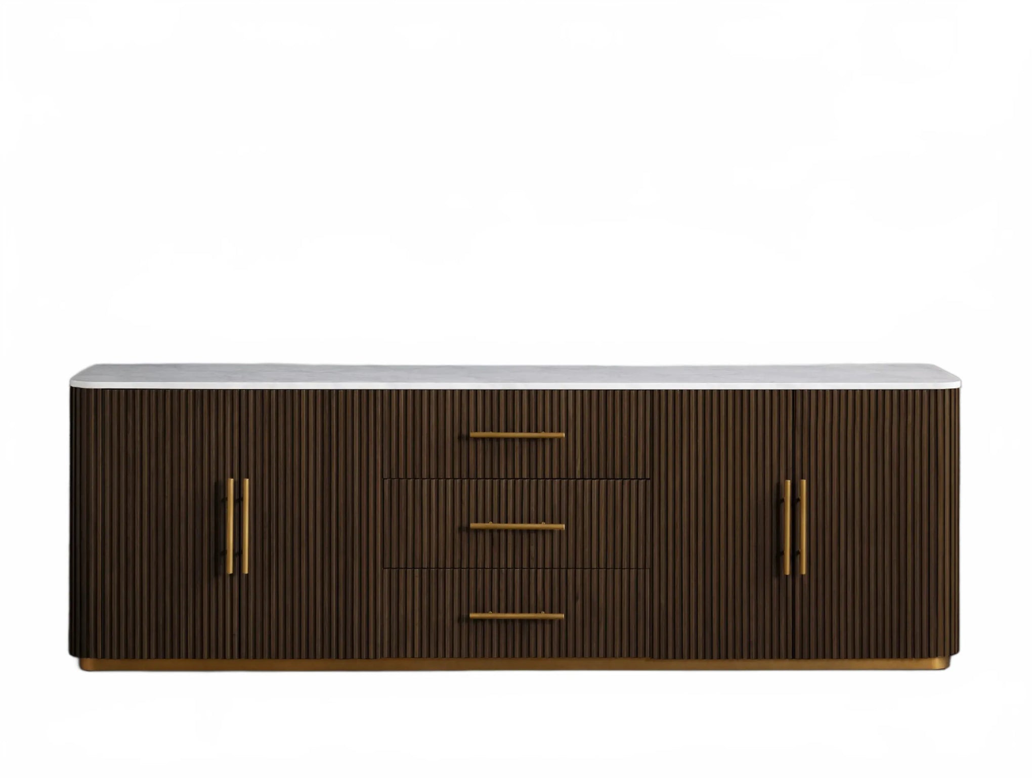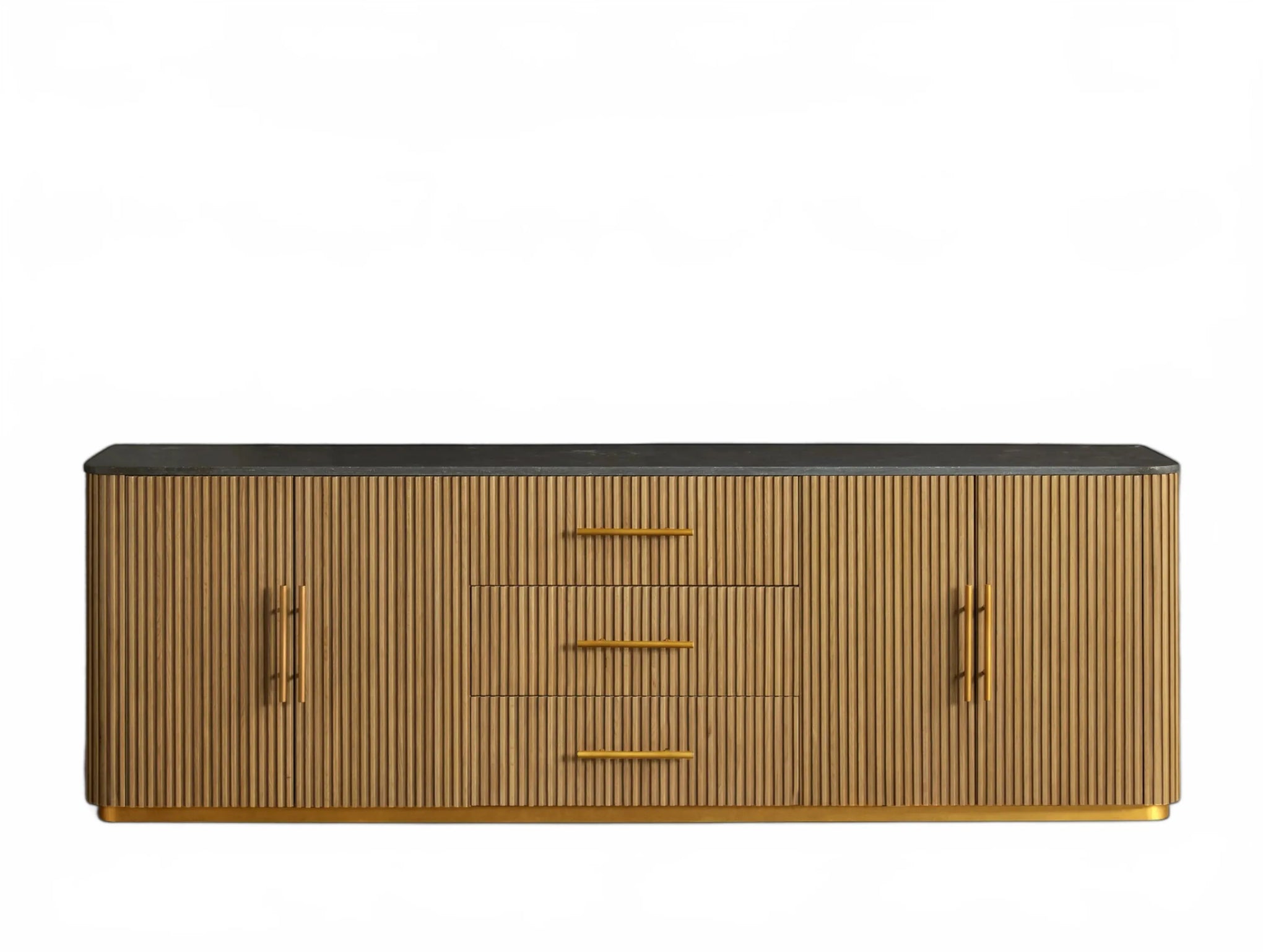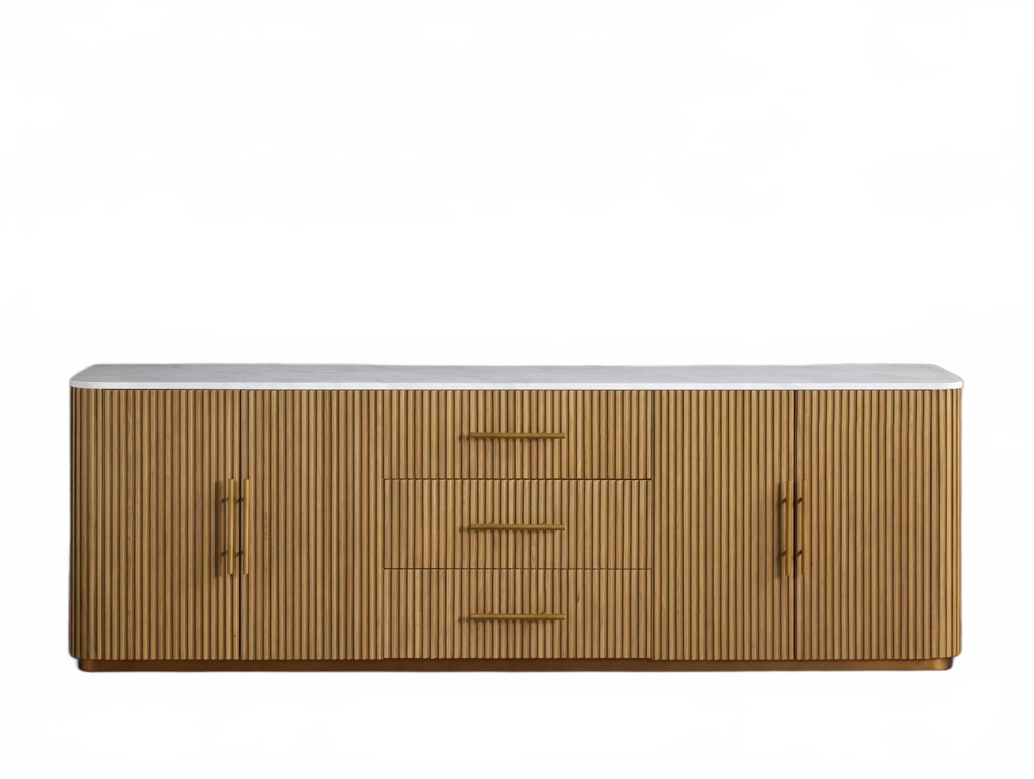 The Rolphin plinth sideboard with drawers embodies enduring sophistication and contemporary practicality in a bold mixed-material composition. Fashioned from hand-finished Finnish pine or premium white oak, it’s accented with reeded oak embellishment, brass fittings, and a brass-finished plinth platform. Capped with white marble or bluestone, this cabinet presents two flanking compartments, three central drawers, and integrated cord organization—providing adaptable storage for dining and lounge environments together.