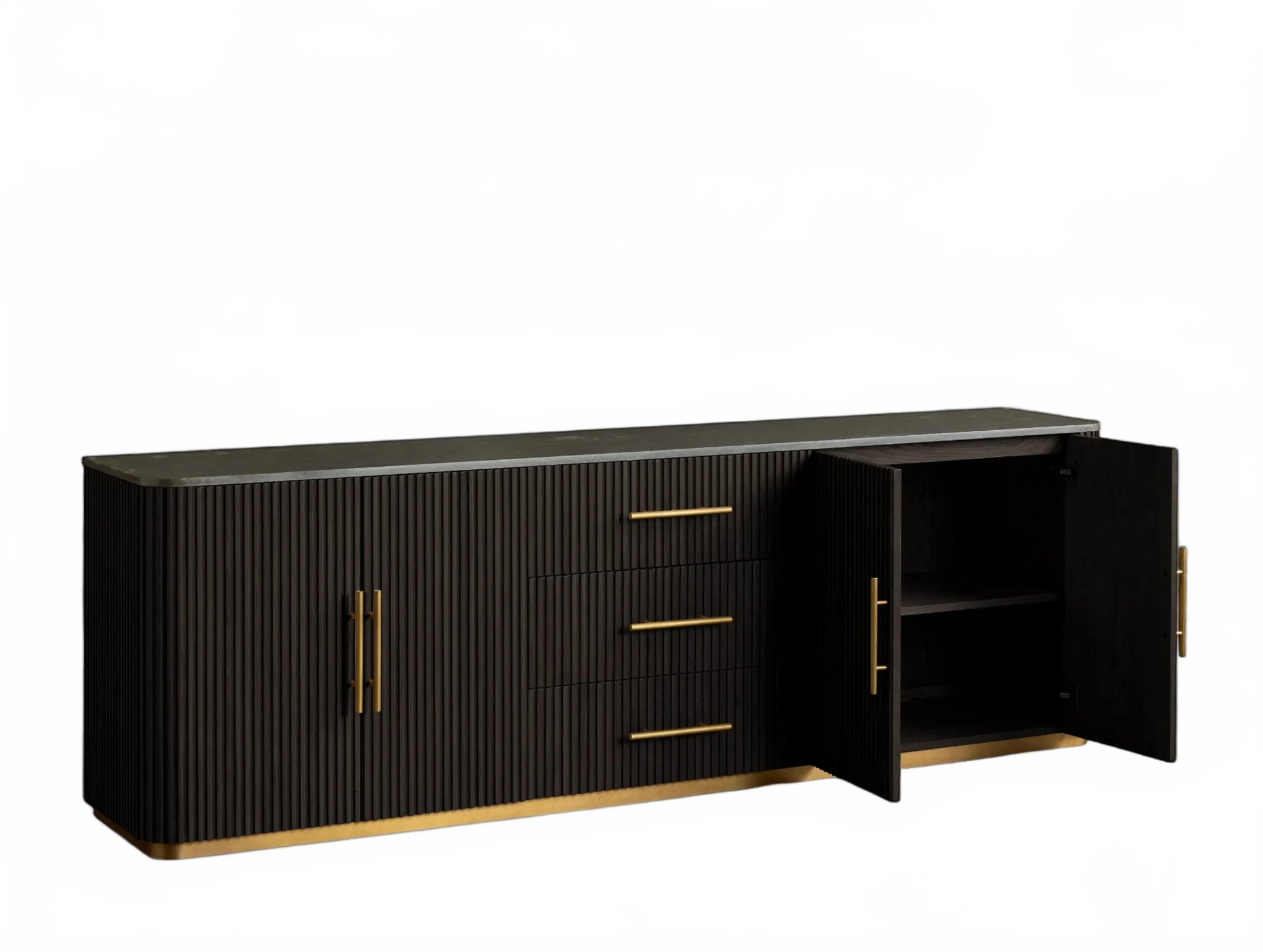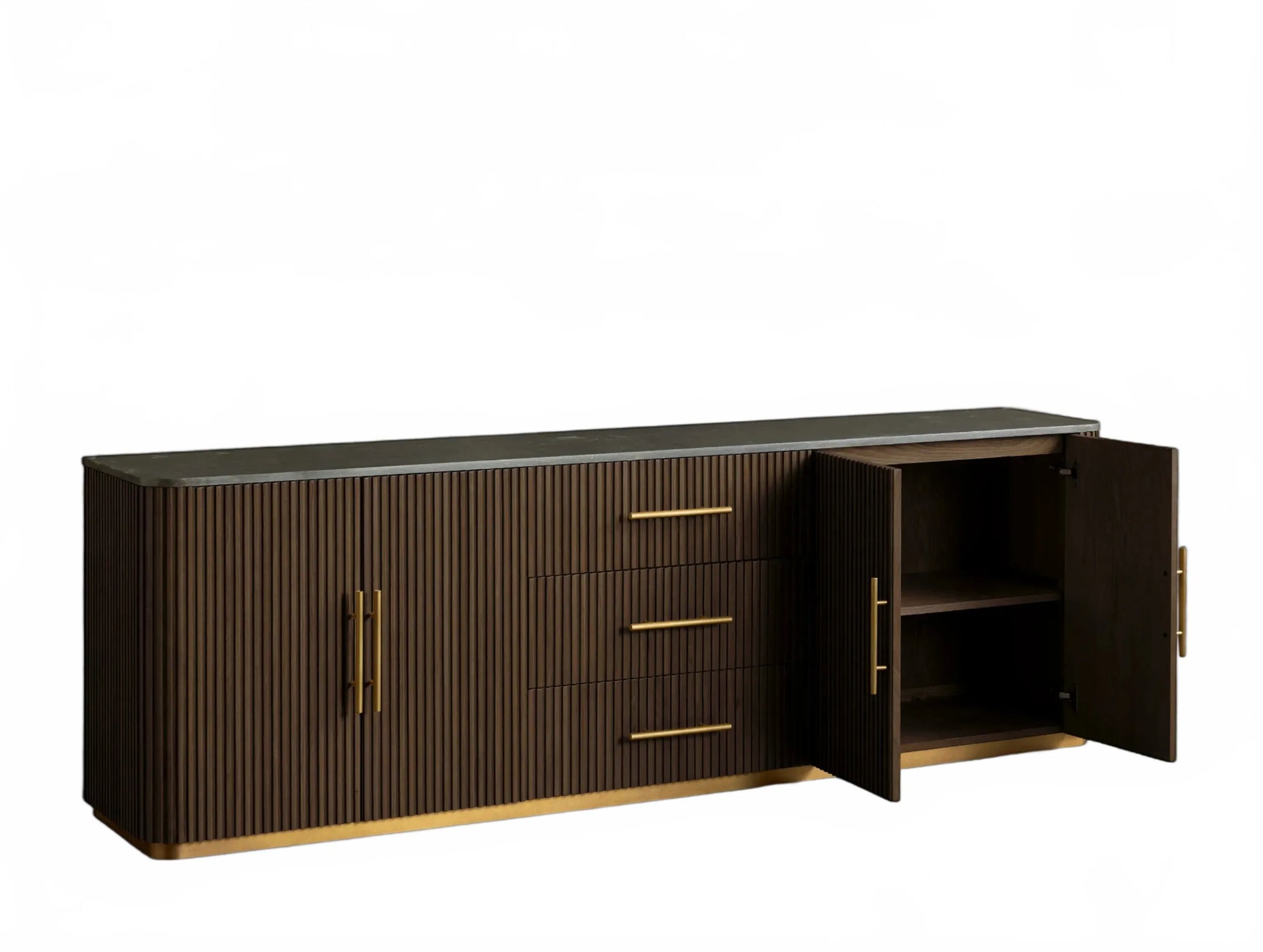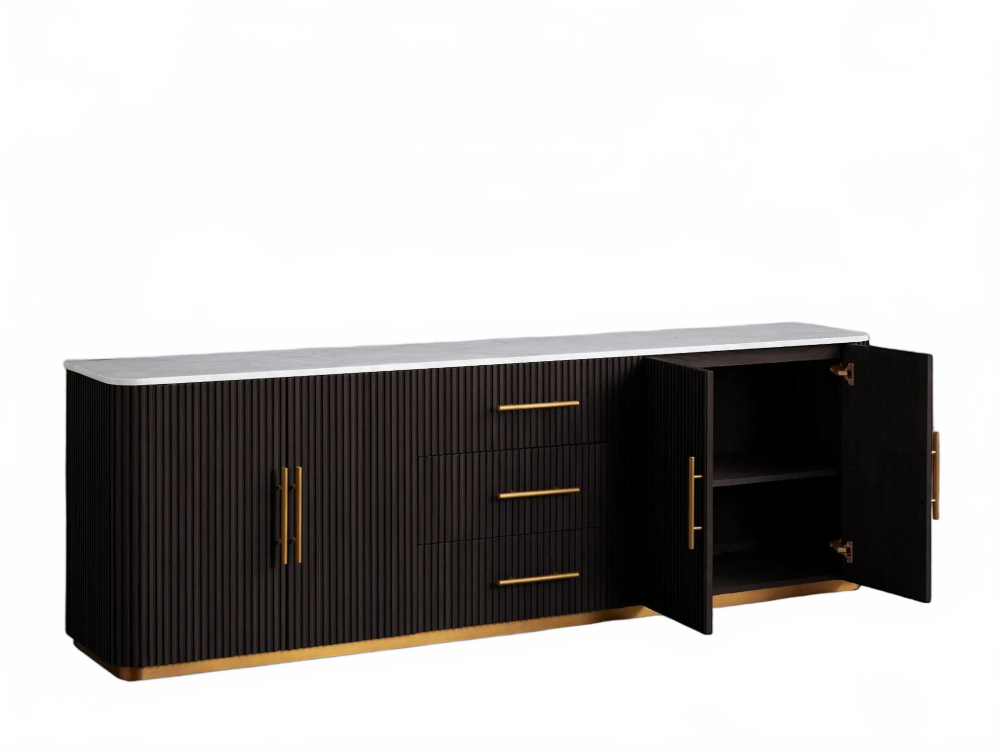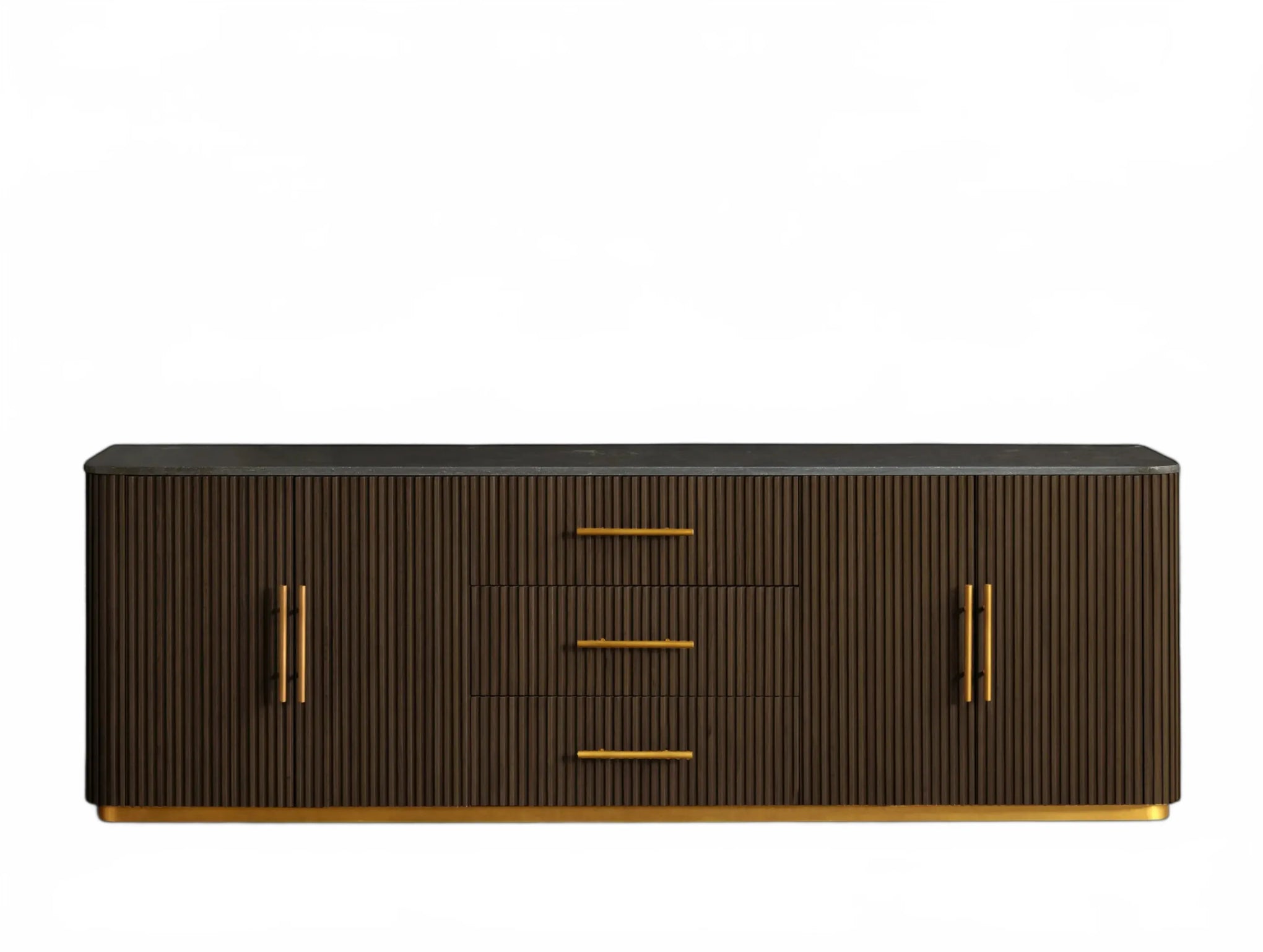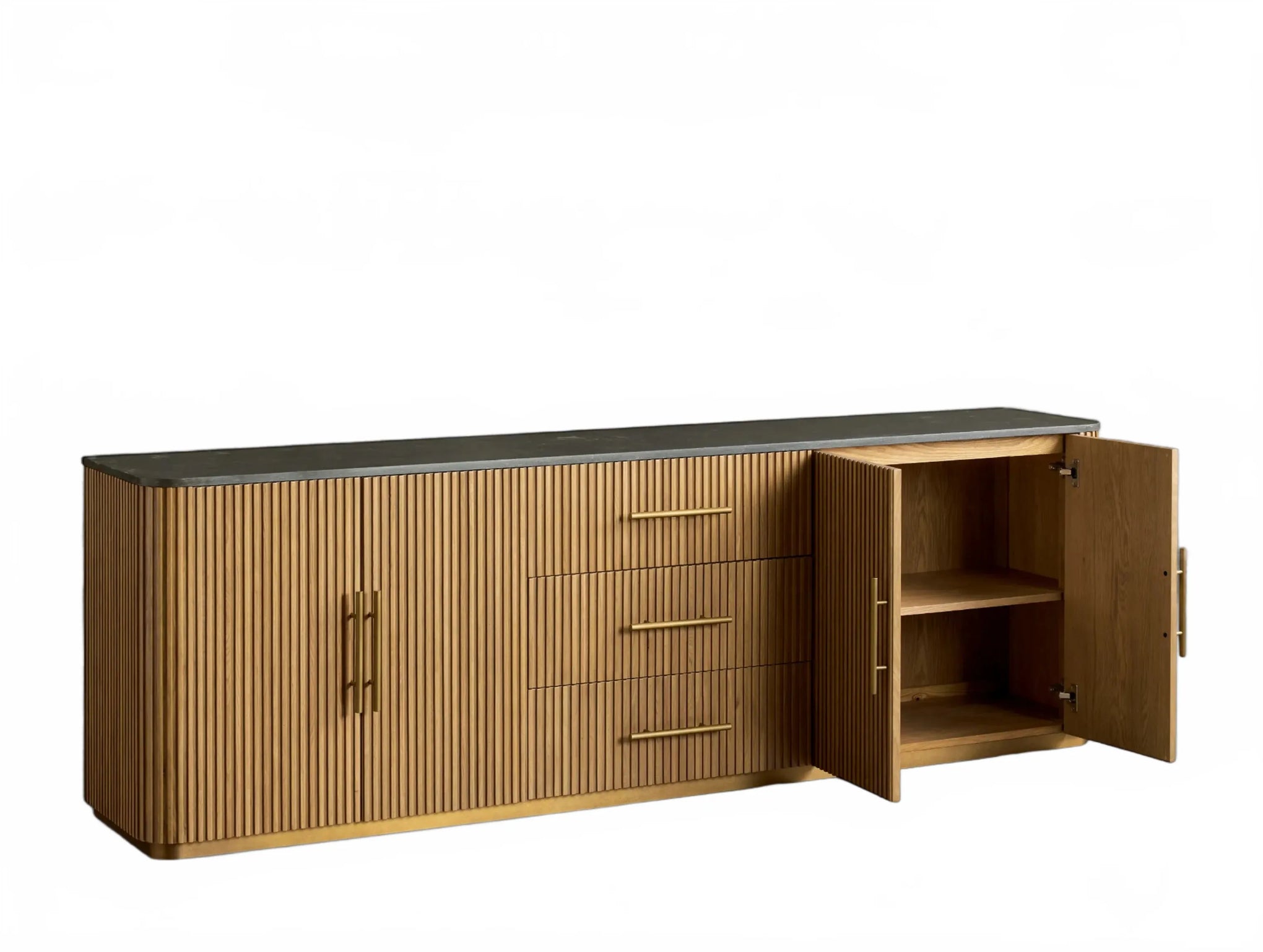 The Rolphin plinth sideboard with drawers embodies enduring sophistication and contemporary practicality in a bold mixed-material composition. Fashioned from hand-finished Finnish pine or premium white oak, it’s accented with reeded oak embellishment, brass fittings, and a brass-finished plinth platform. Capped with white marble or bluestone, this cabinet presents two flanking compartments, three central drawers, and integrated cord organization—providing adaptable storage for dining and lounge environments together.