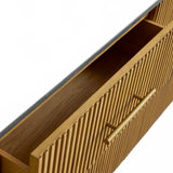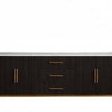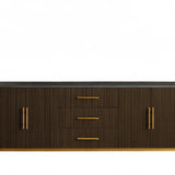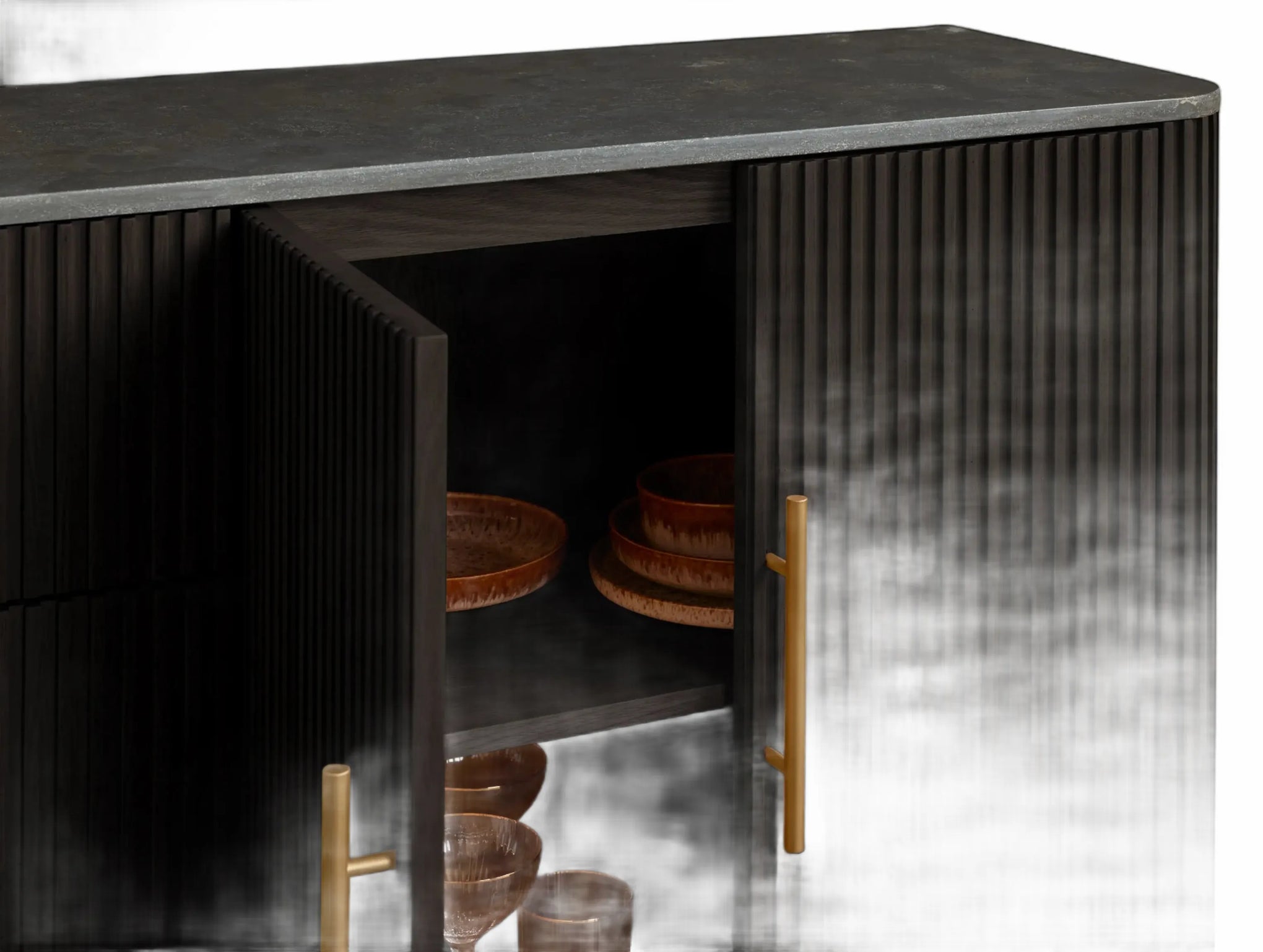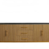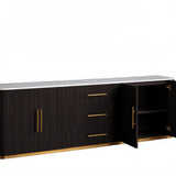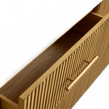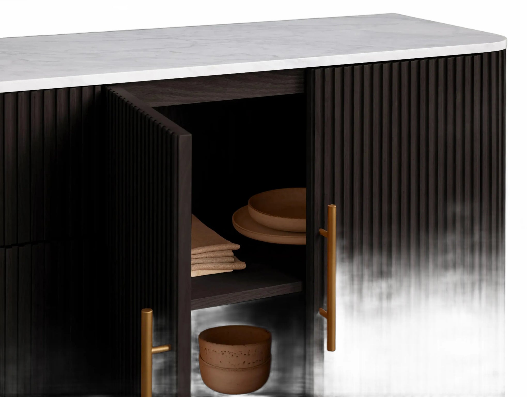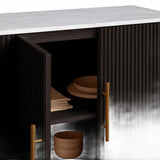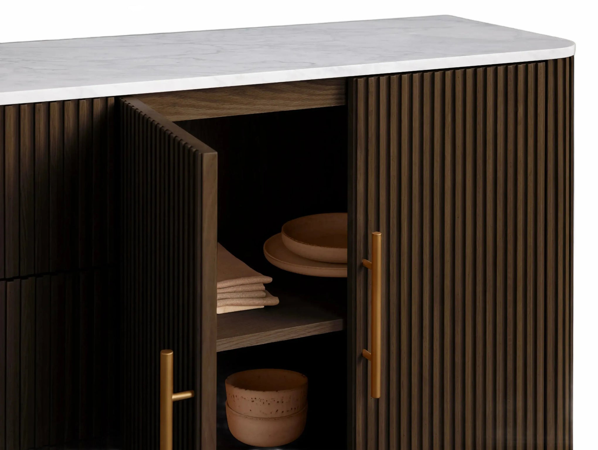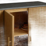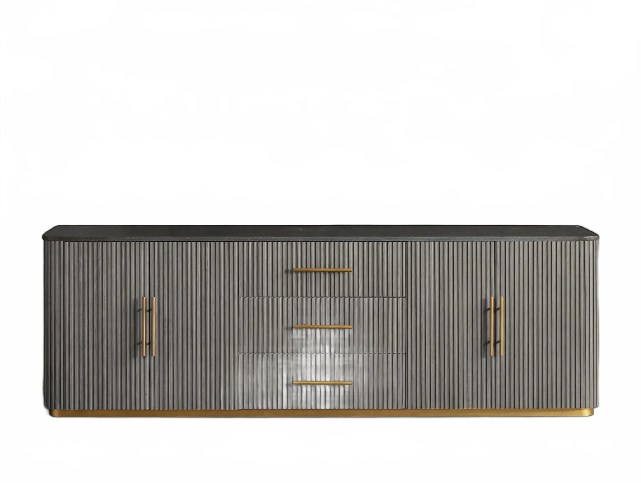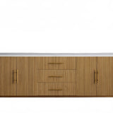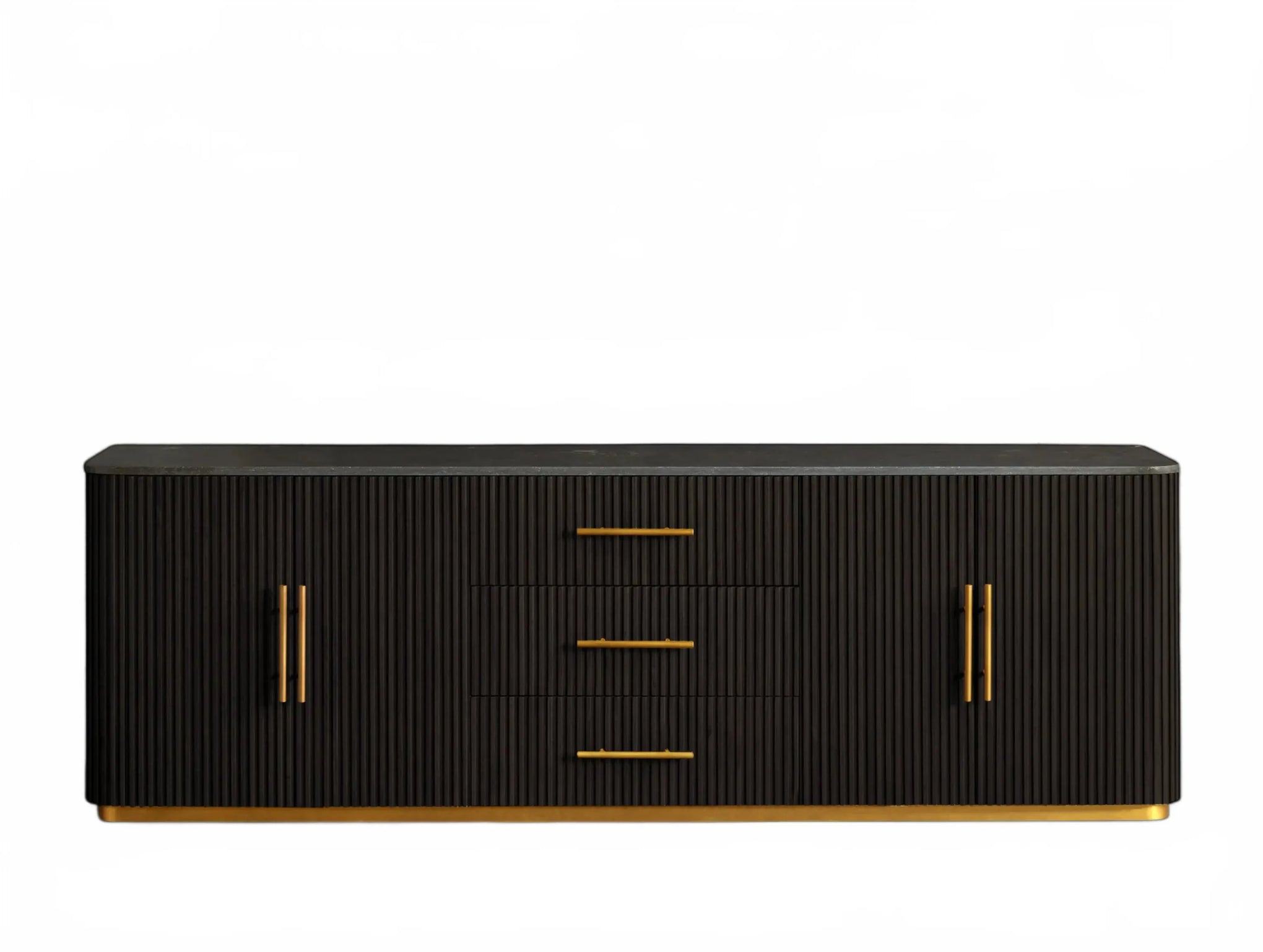 The Rolphin plinth sideboard with drawers embodies enduring sophistication and contemporary practicality in a bold mixed-material composition. Fashioned from hand-finished Finnish pine or premium white oak, it’s accented with reeded oak embellishment, brass fittings, and a brass-finished plinth platform. Capped with white marble or bluestone, this cabinet presents two flanking compartments, three central drawers, and integrated cord organization—providing adaptable storage for dining and lounge environments together.