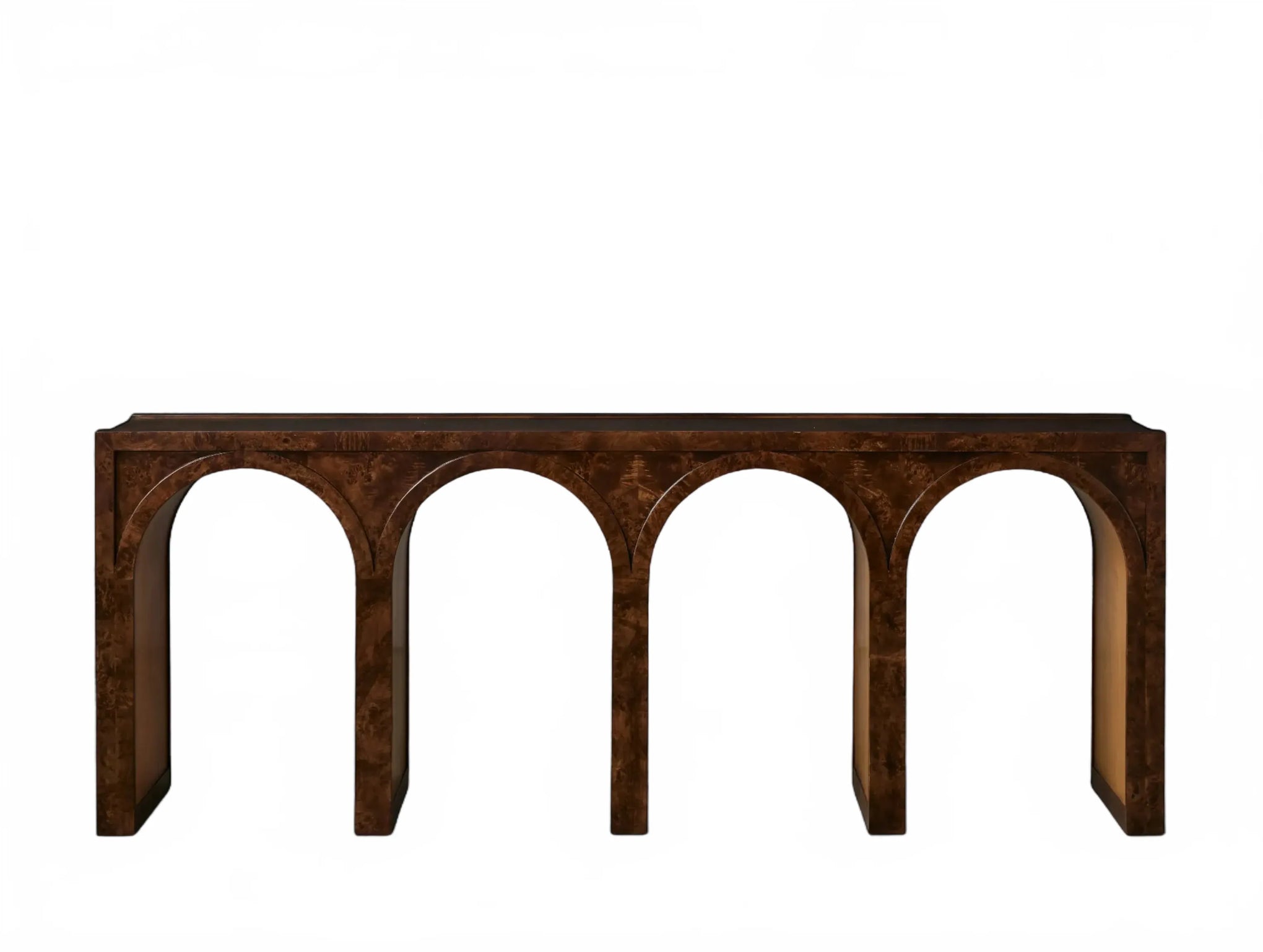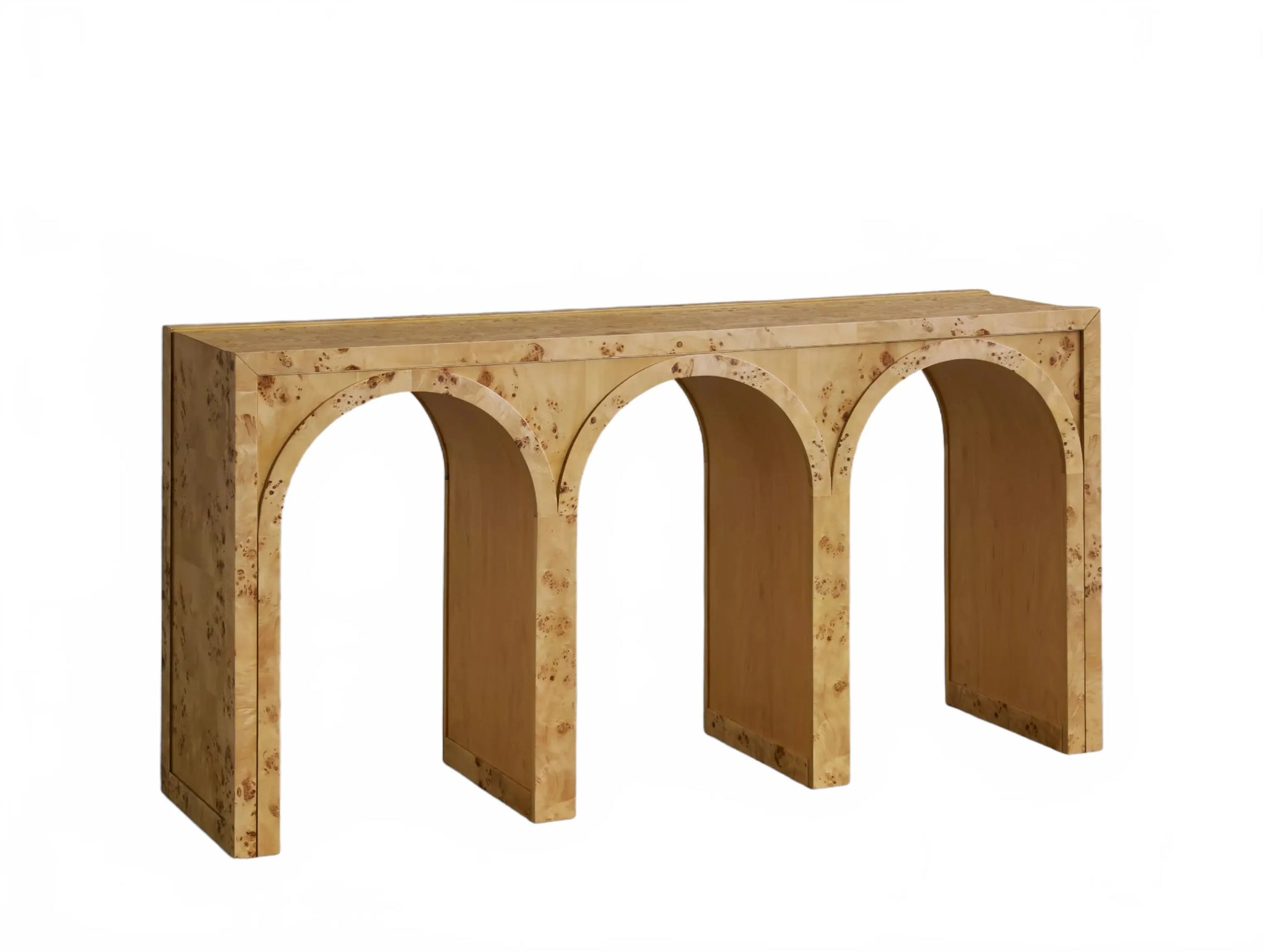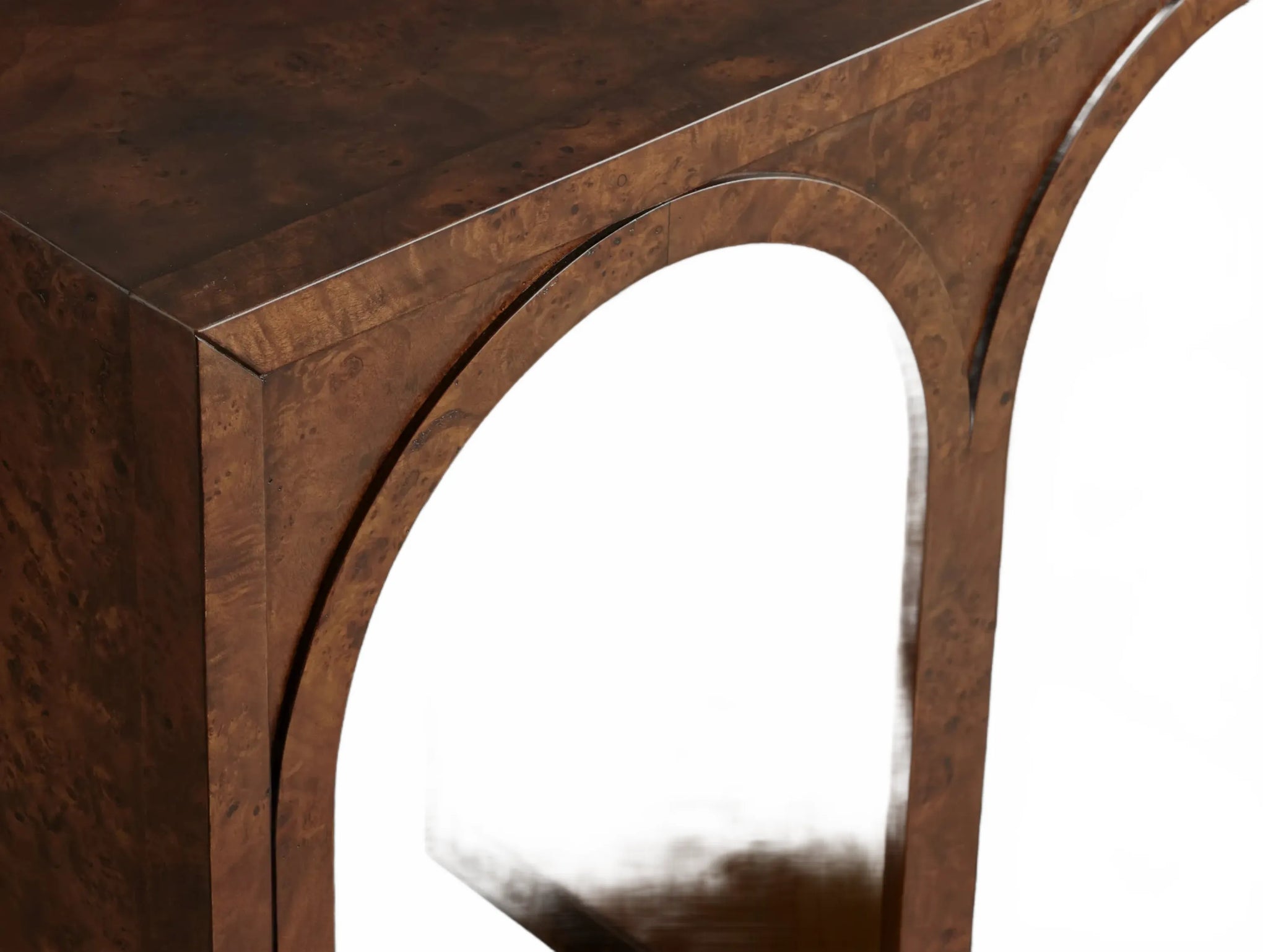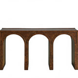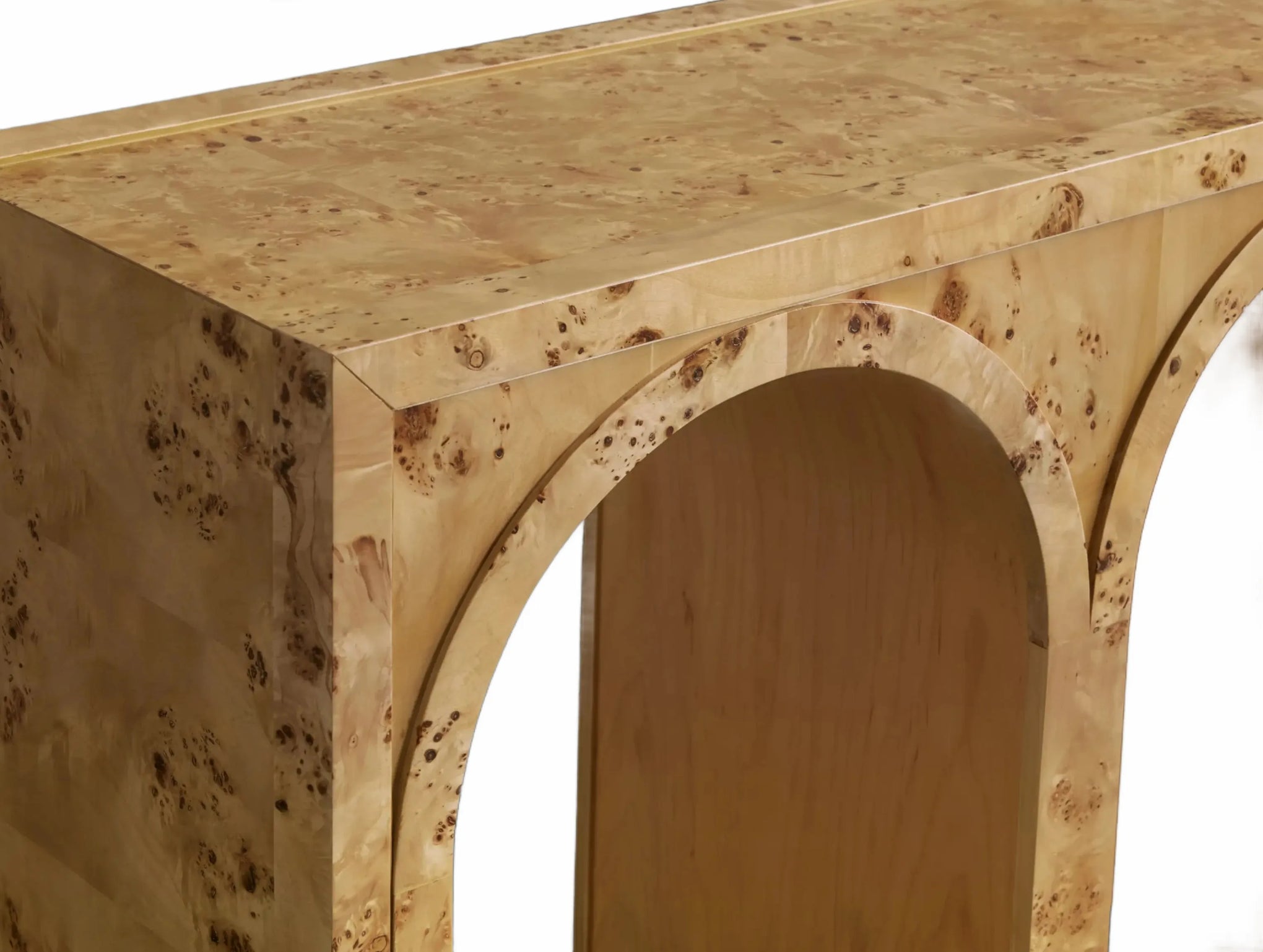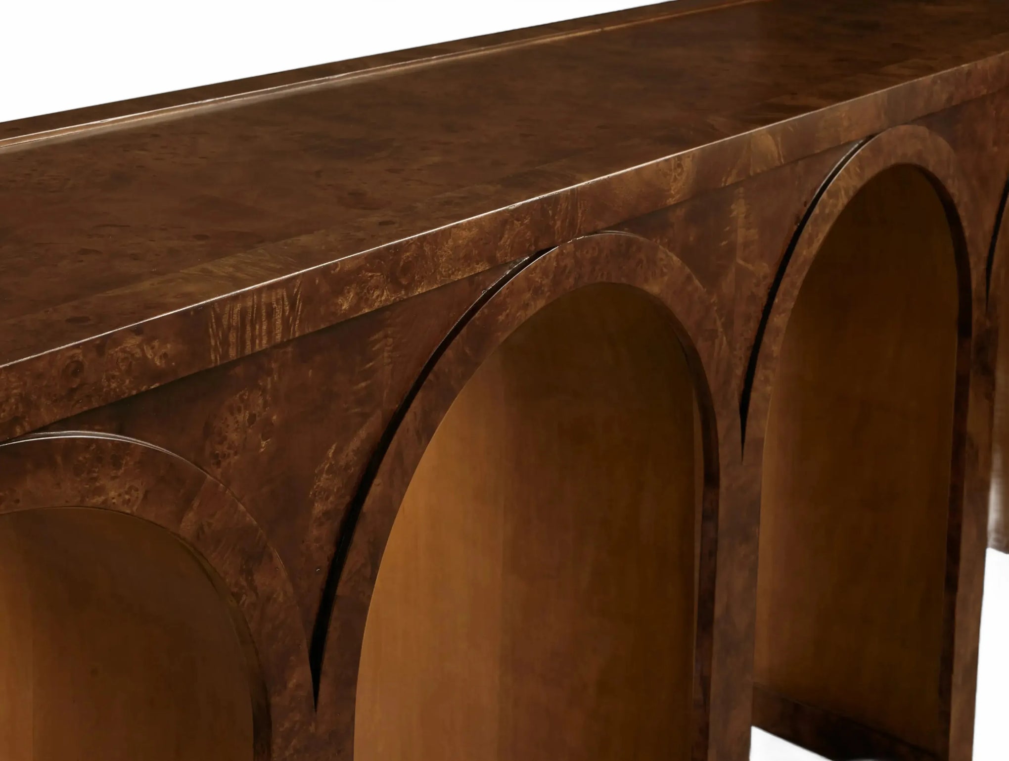 A refined interplay of curves and grain, this artisan-designed console table brings warmth and architectural character to your home. Showcasing graceful arches and radiant burl veneer, it celebrates the natural brilliance of the wood from every angle. A contrasting interior finish introduces depth and polished detail.