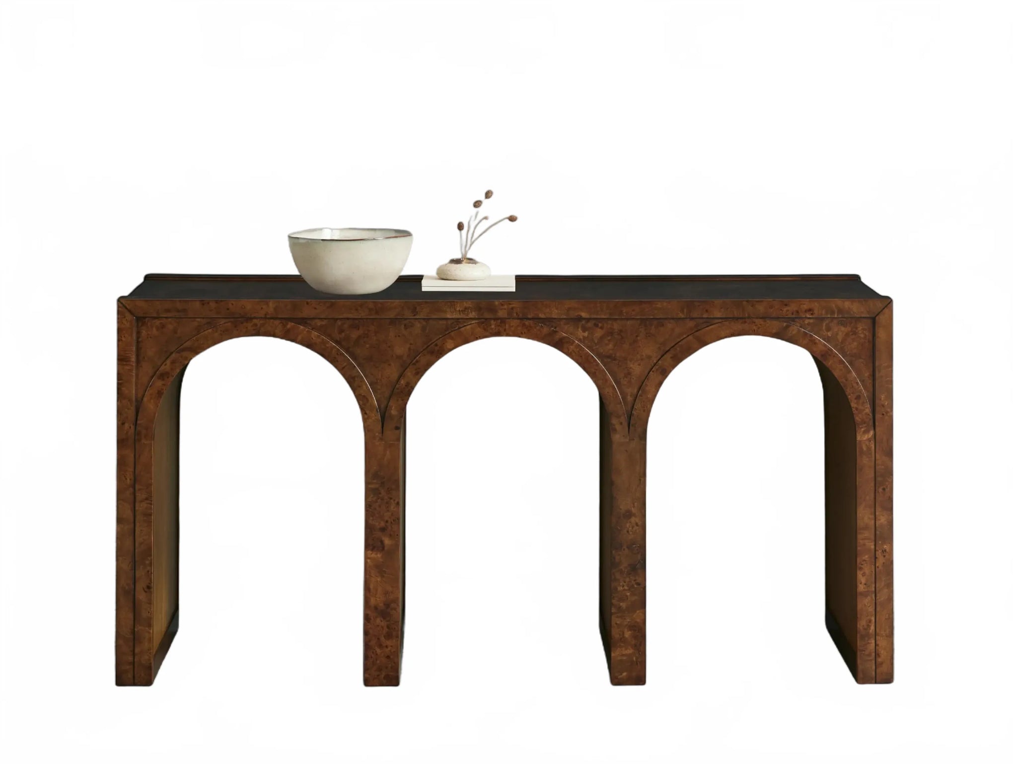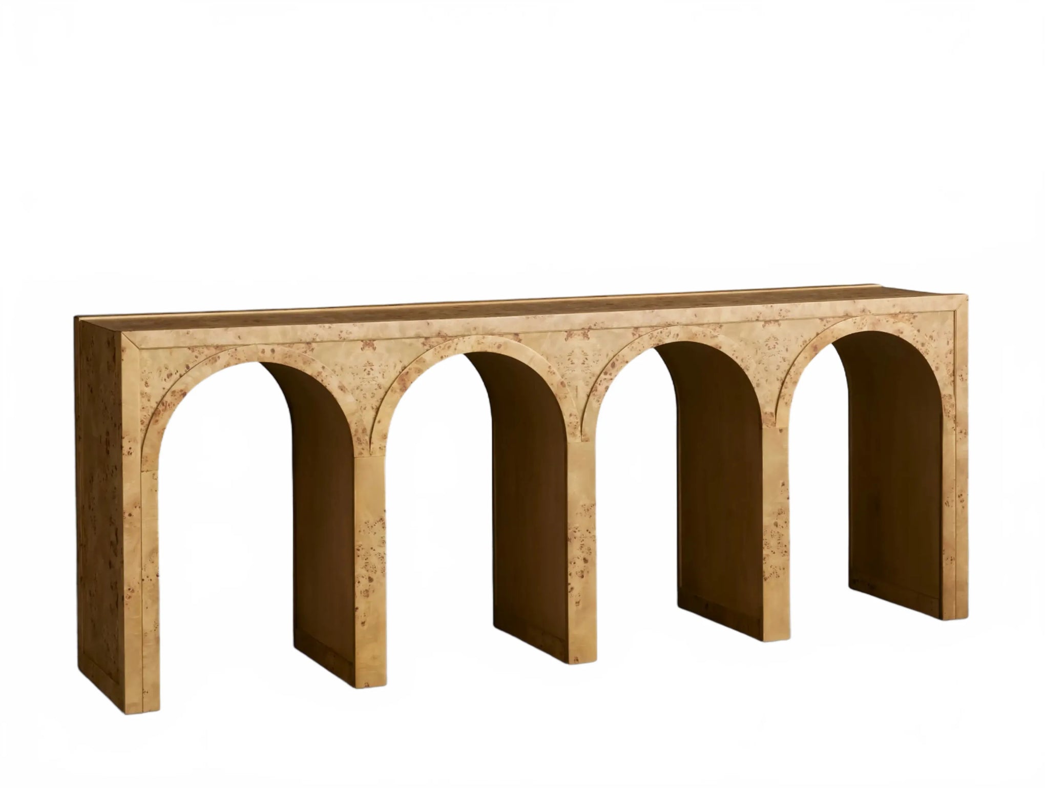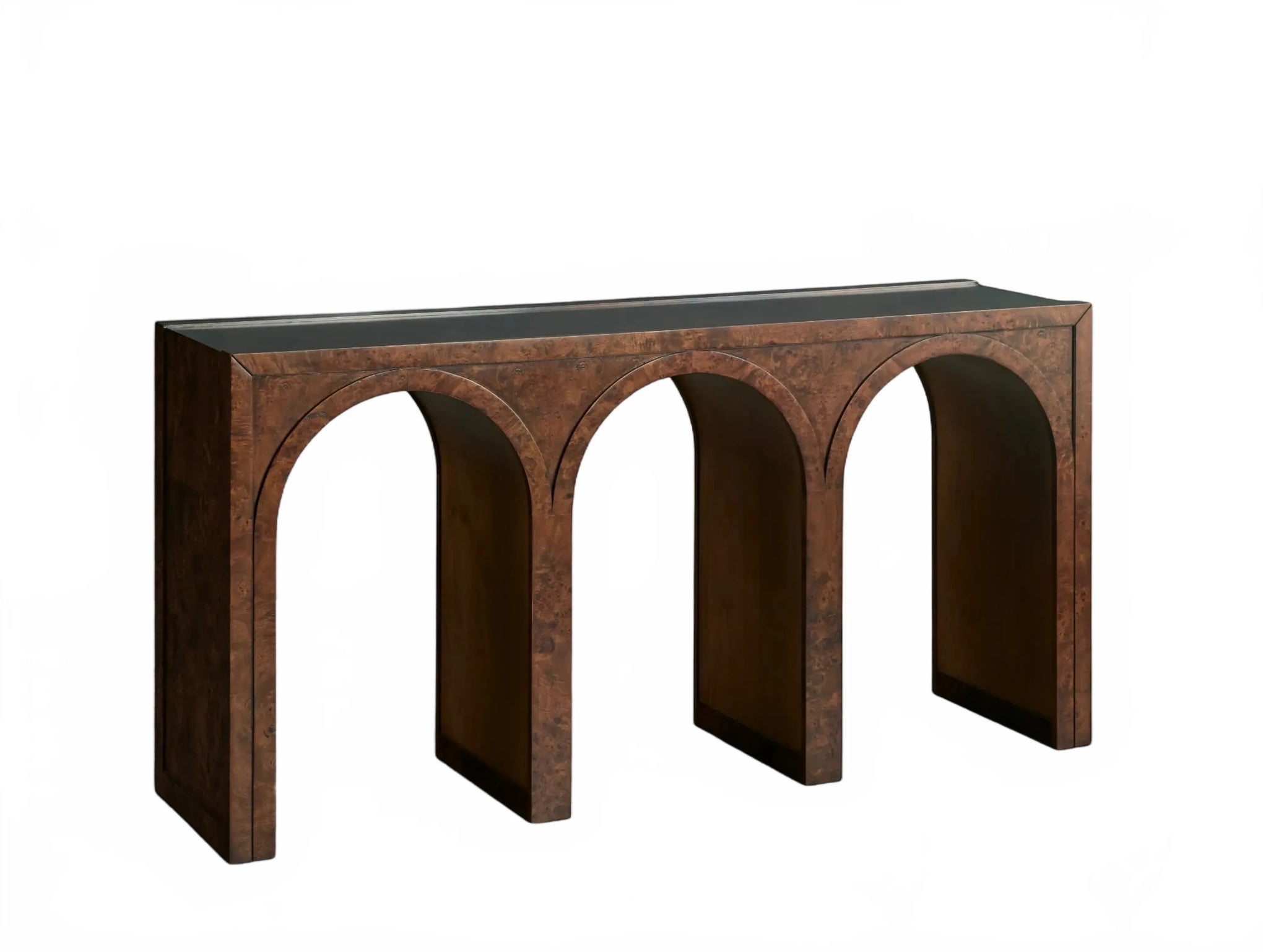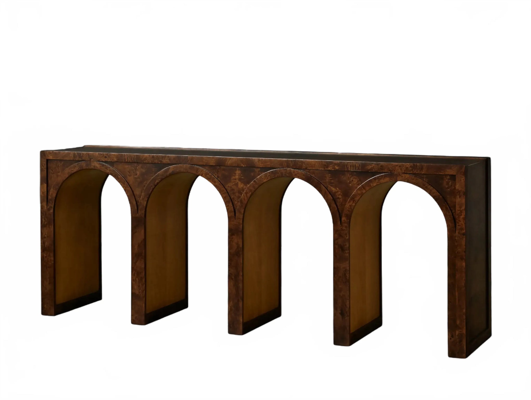 A refined interplay of curves and grain, this artisan-designed console table brings warmth and architectural character to your home. Showcasing graceful arches and radiant burl veneer, it celebrates the natural brilliance of the wood from every angle. A contrasting interior finish introduces depth and polished detail.