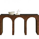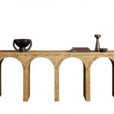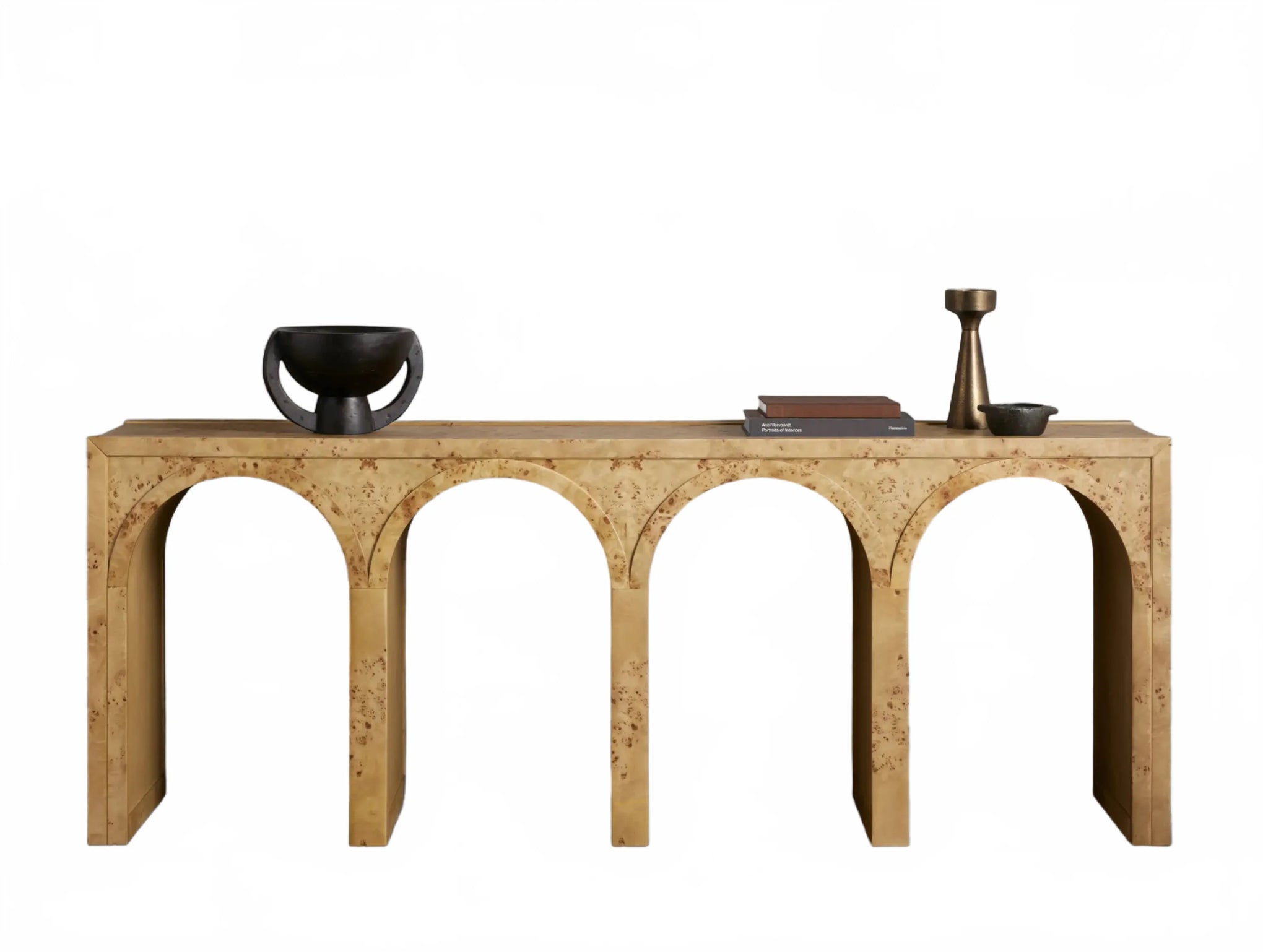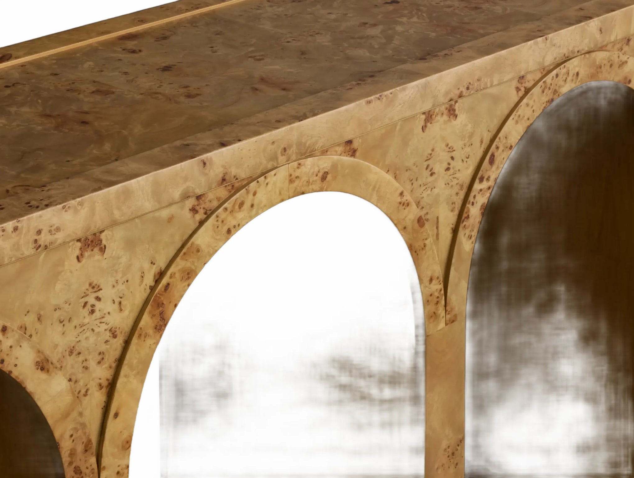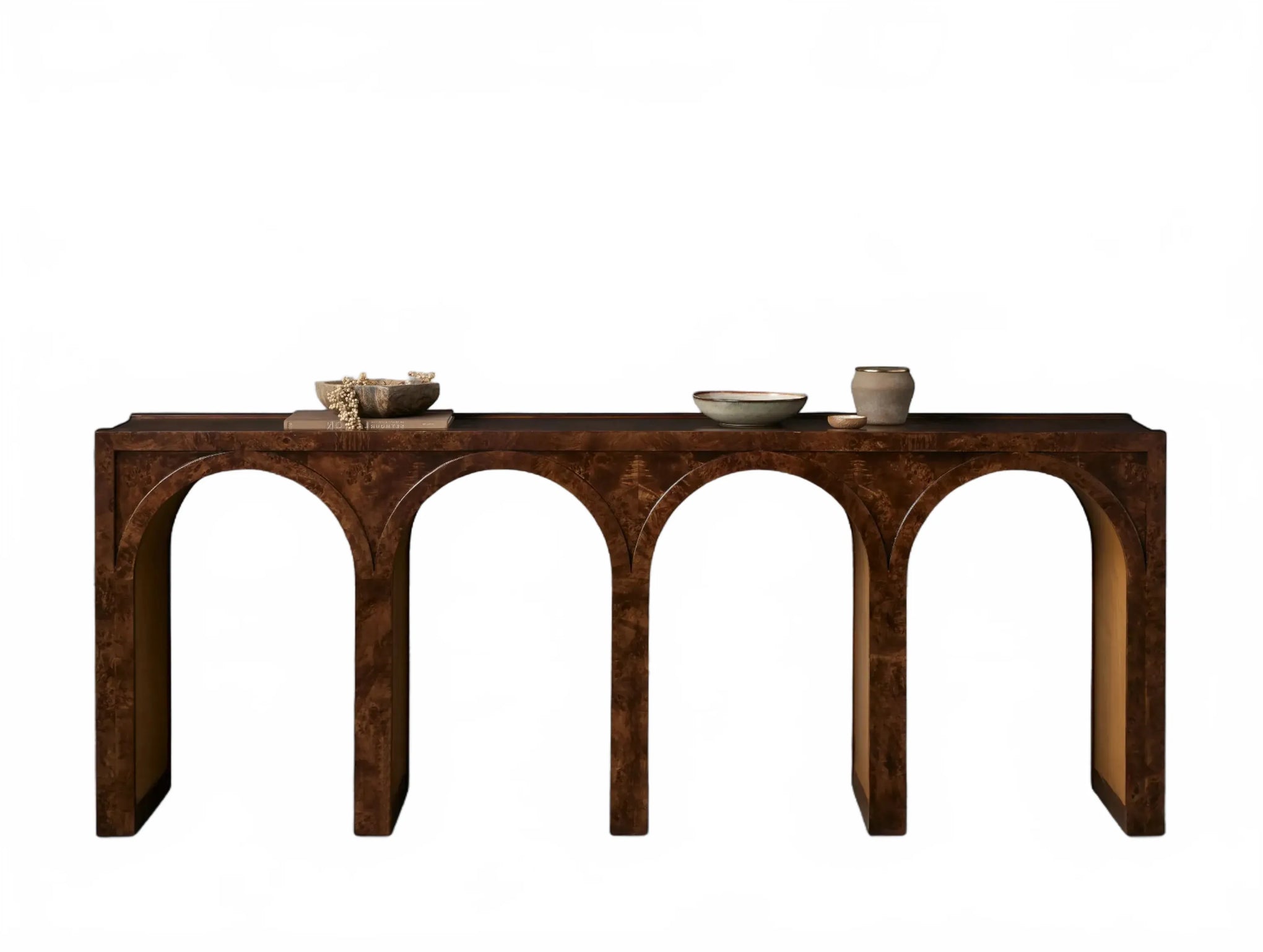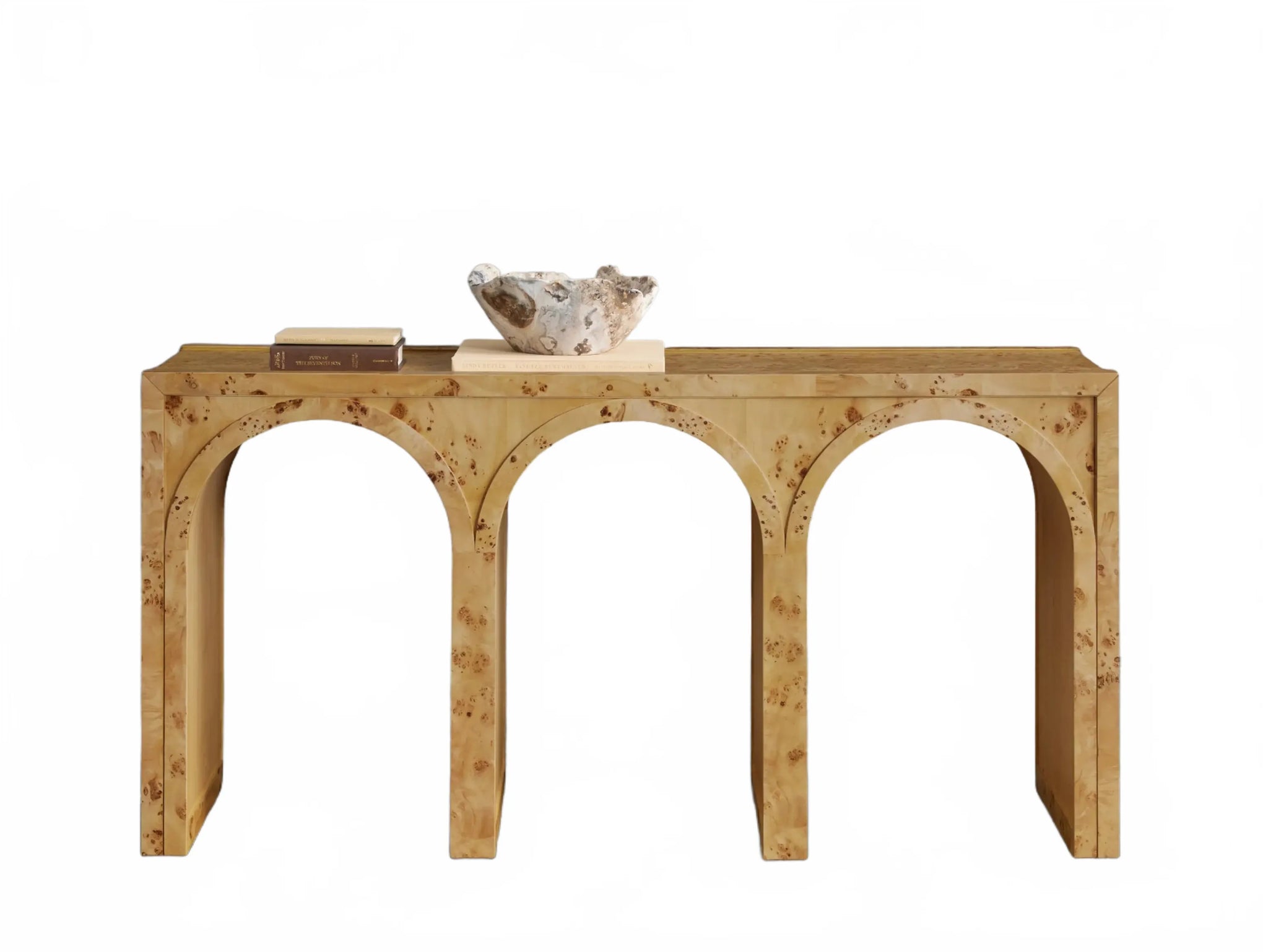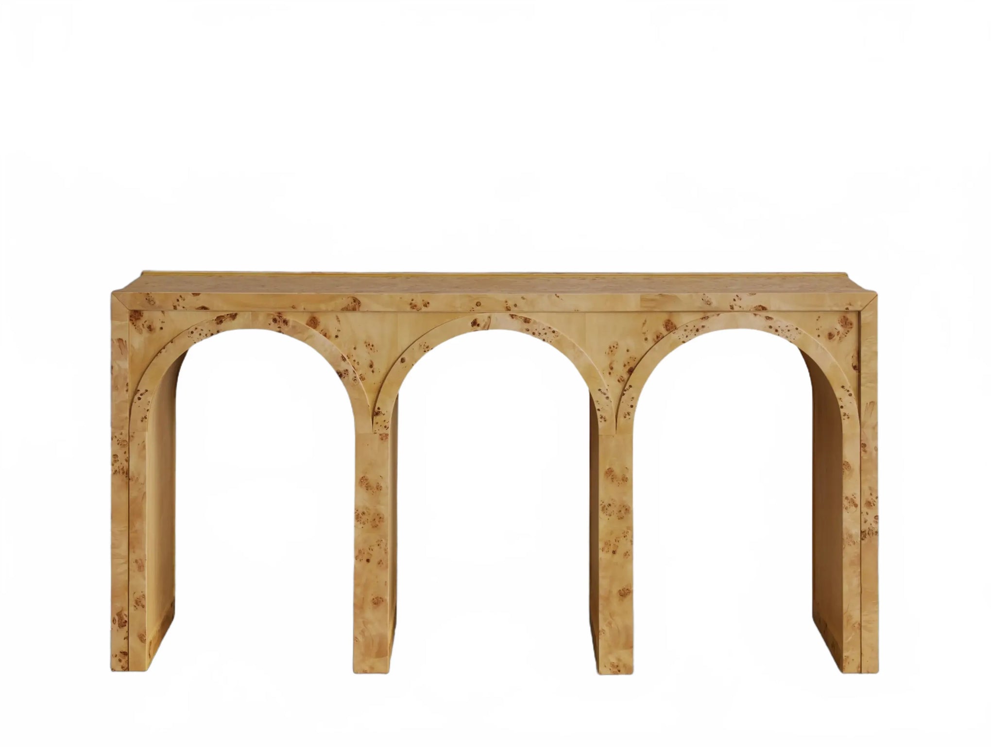 A refined interplay of curves and grain, this artisan-designed console table brings warmth and architectural character to your home. Showcasing graceful arches and radiant burl veneer, it celebrates the natural brilliance of the wood from every angle. A contrasting interior finish introduces depth and polished detail.