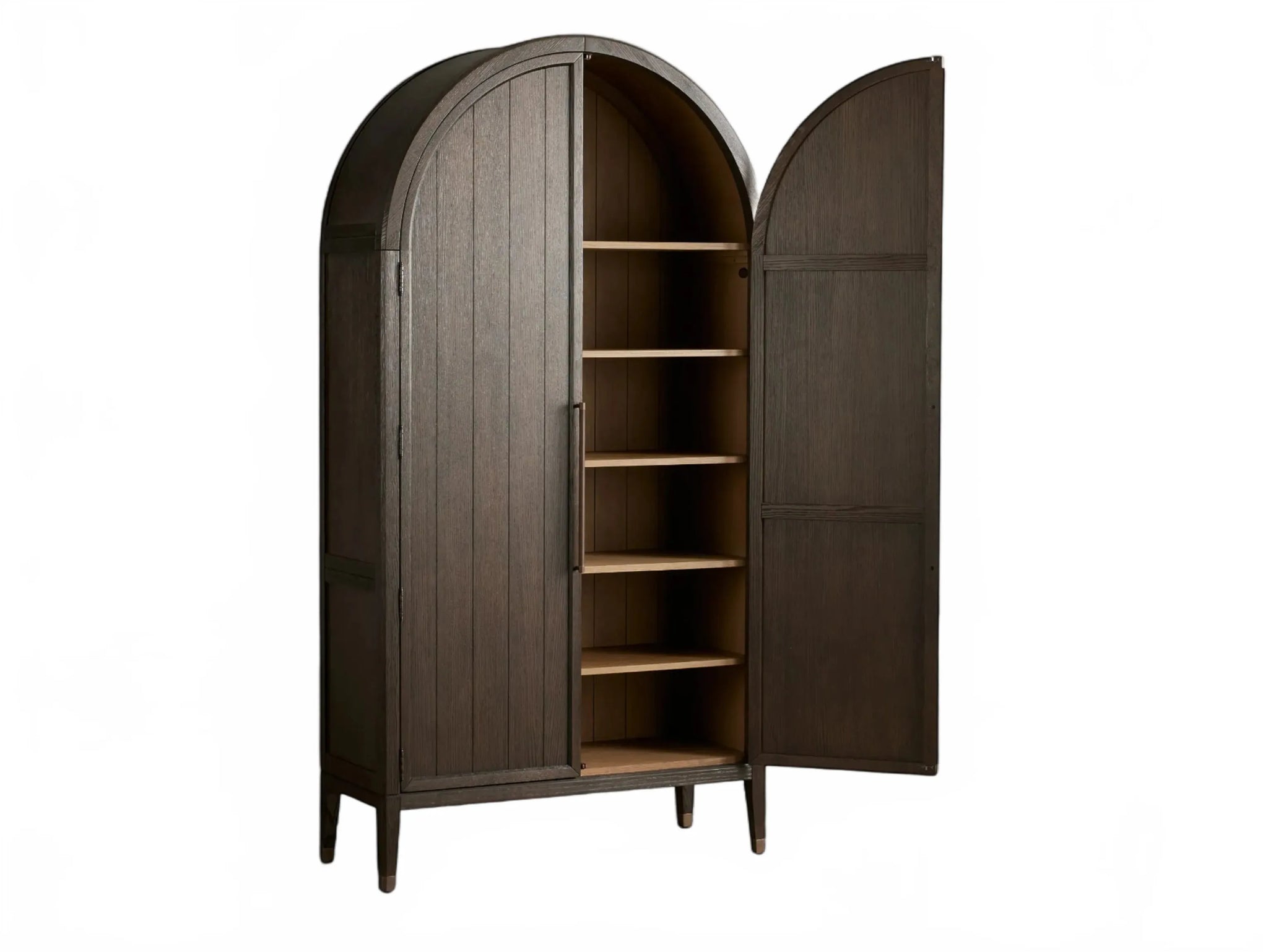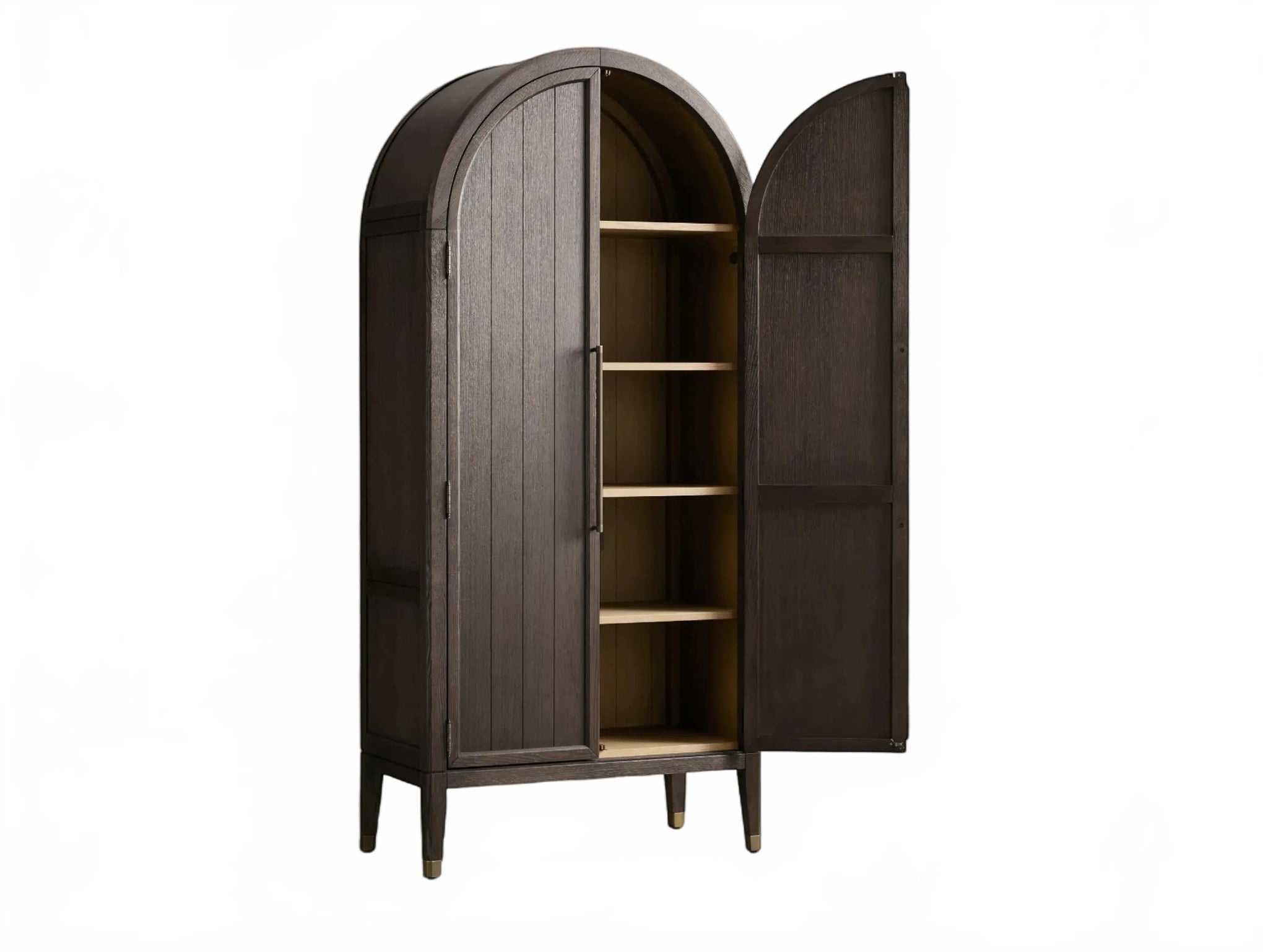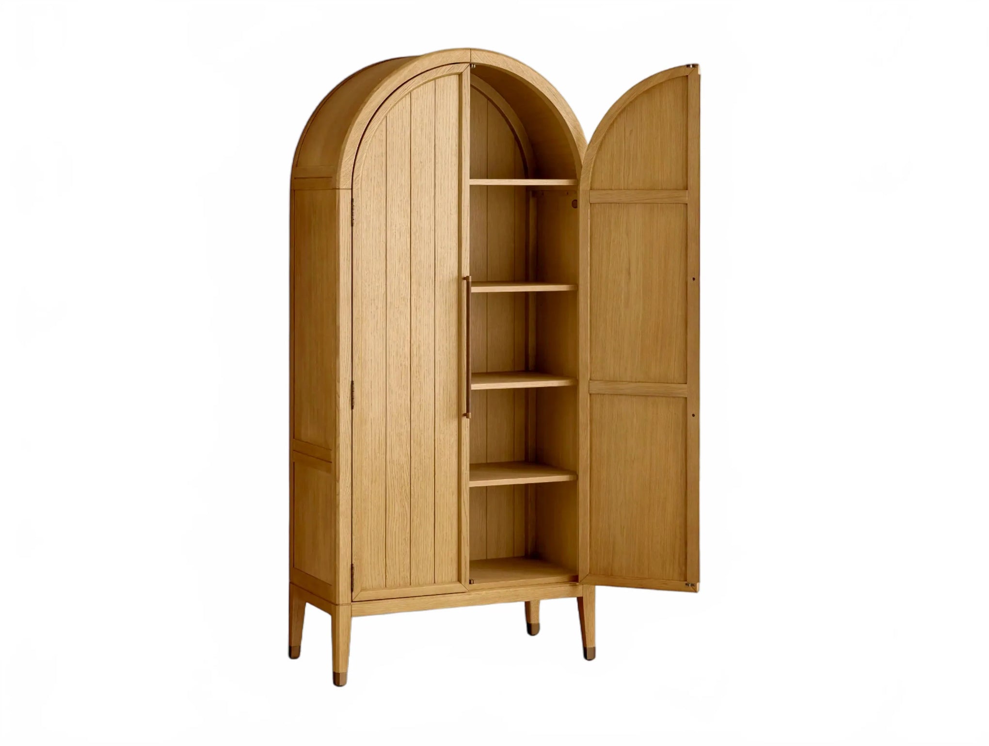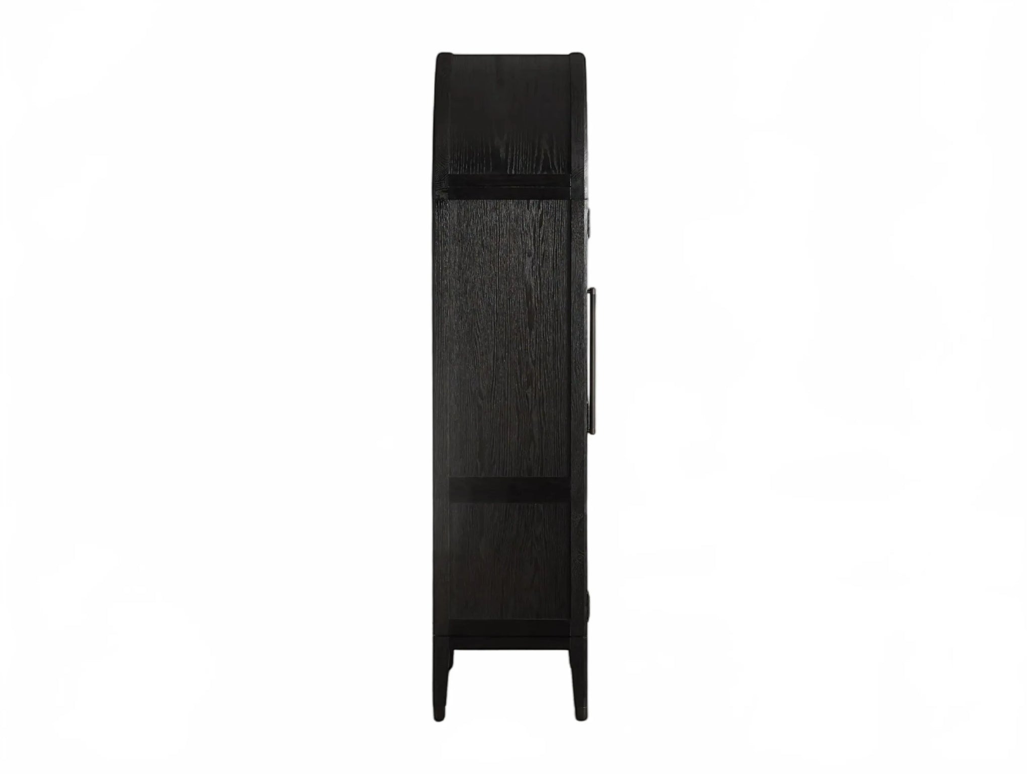 The Hottiy Cabinet merges graceful curves with the distinctive grain of oak, providing ample storage for both display and organization. Crafted in China from solid oak and oak veneers, each piece is hand-finished to emphasize the natural beauty of the wood. Shiplap back panels and contrasting finishes create visual depth, while exposed hinges, reeded hardware in an antiqued finish, and brass-capped feet lend refined character. Five shelves, including three adjustable options, plus cord management openings, ensure this cabinet remains as practical as it is elegant. Solid aluminum alloy knurled pulls complete the design with a sense of craftsmanship.