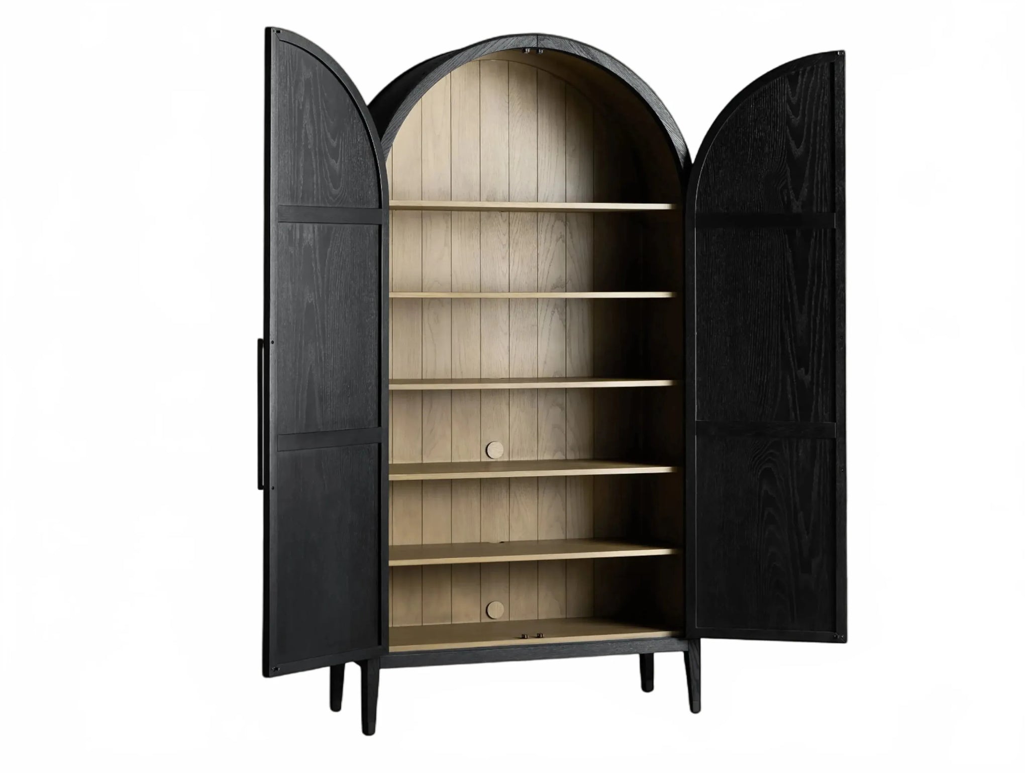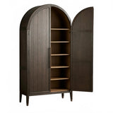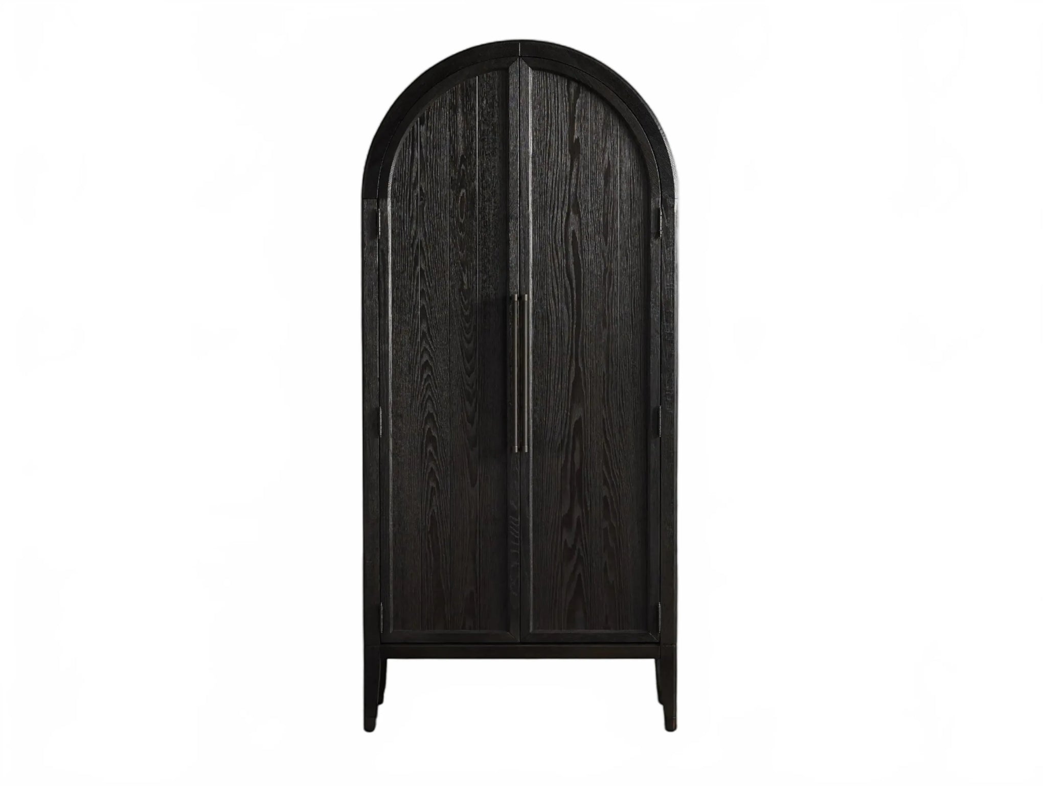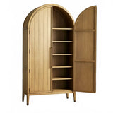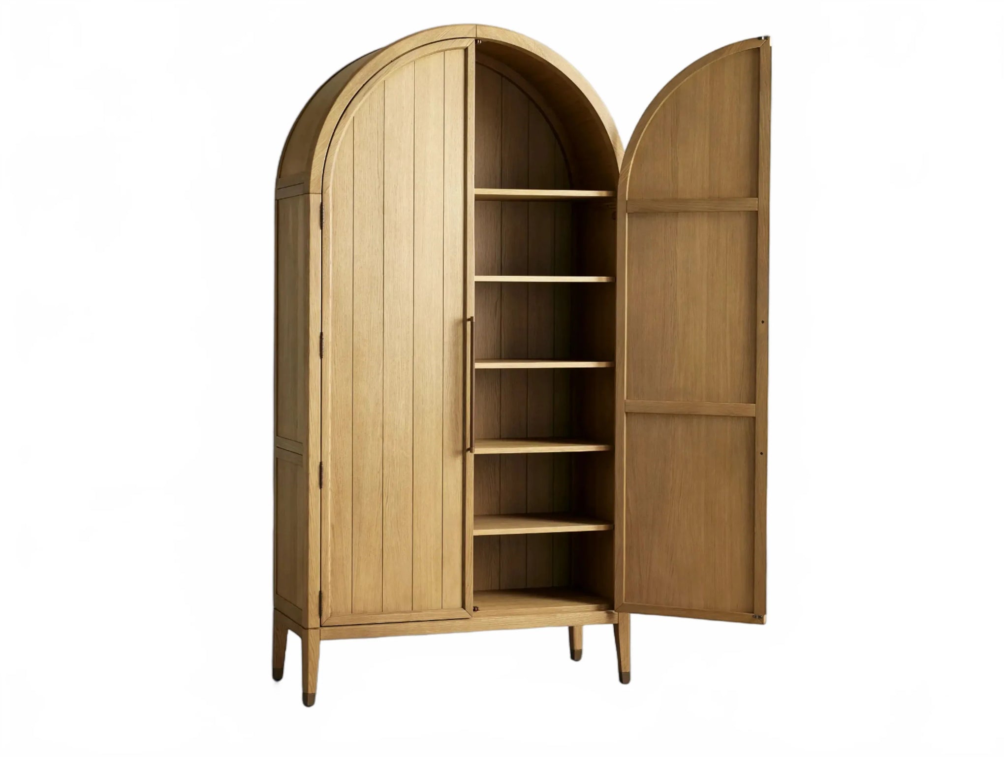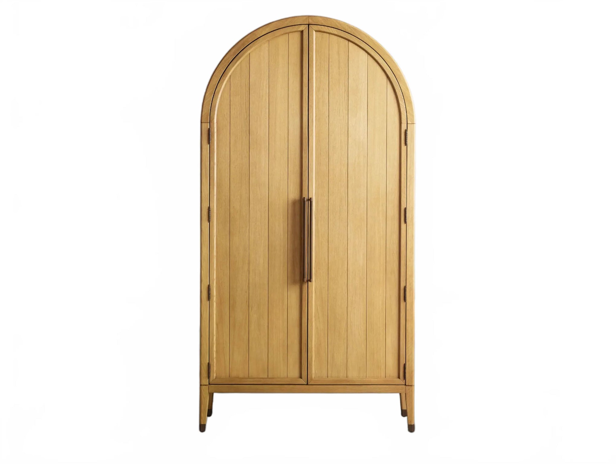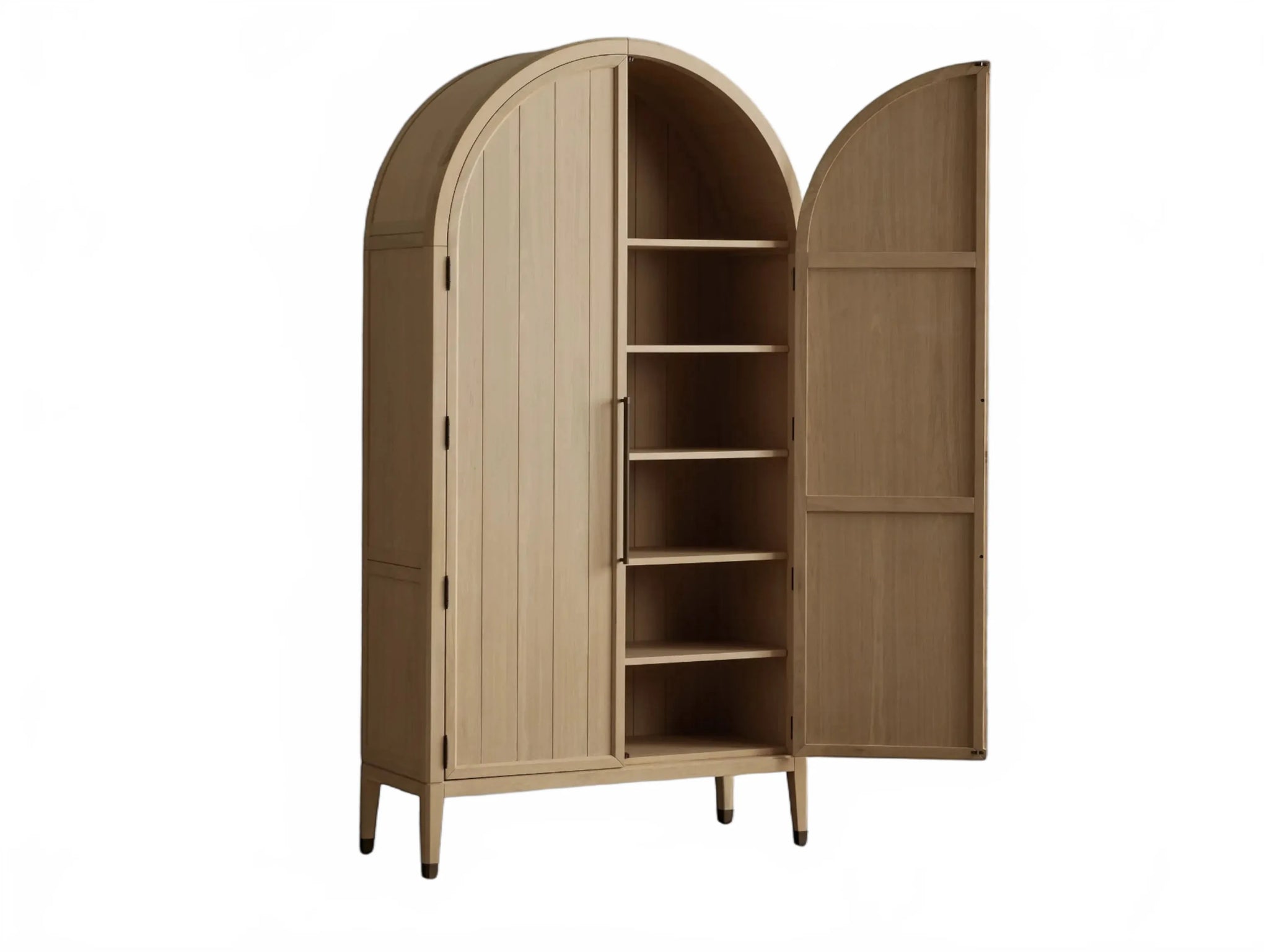The Hottiy Cabinet merges graceful curves with the distinctive grain of oak, providing ample storage for both display and organization. Crafted in China from solid oak and oak veneers, each piece is hand-finished to emphasize the natural beauty of the wood. Shiplap back panels and contrasting finishes create visual depth, while exposed hinges, reeded hardware in an antiqued finish, and brass-capped feet lend refined character. Five shelves, including three adjustable options, plus cord management openings, ensure this cabinet remains as practical as it is elegant. Solid aluminum alloy knurled pulls complete the design with a sense of craftsmanship.