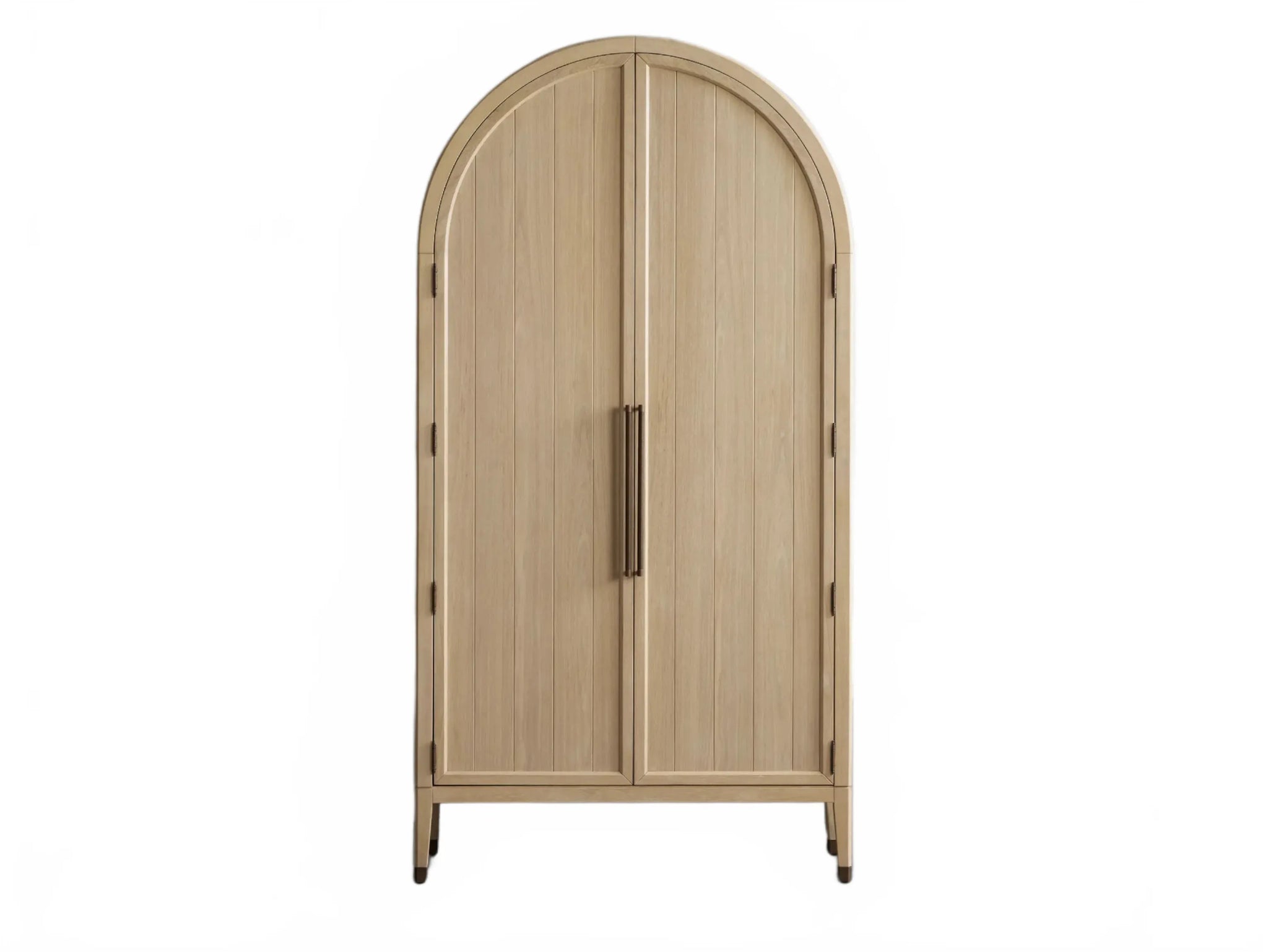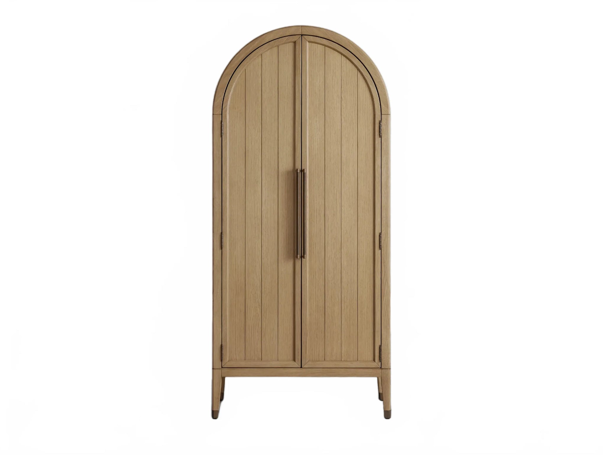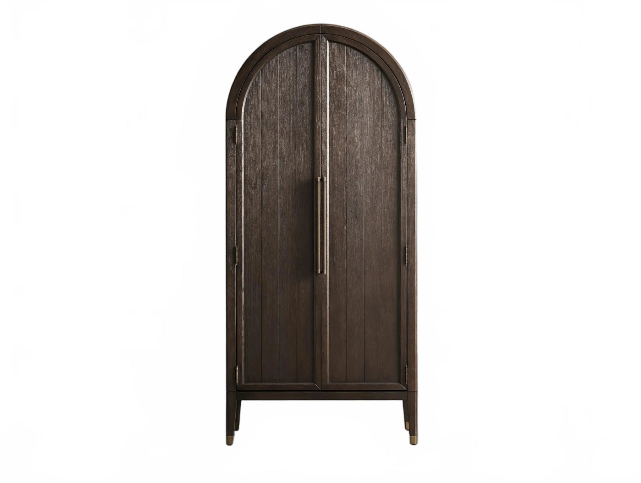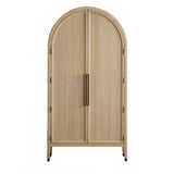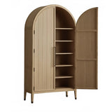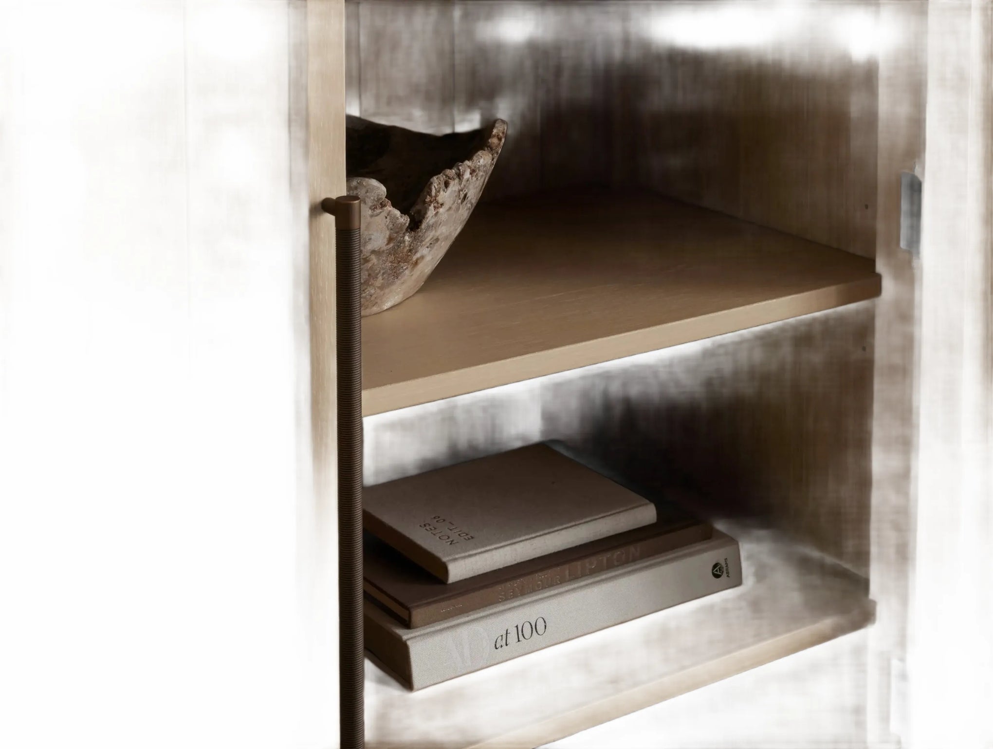 The Hottiy Cabinet merges graceful curves with the distinctive grain of oak, providing ample storage for both display and organization. Crafted in China from solid oak and oak veneers, each piece is hand-finished to emphasize the natural beauty of the wood. Shiplap back panels and contrasting finishes create visual depth, while exposed hinges, reeded hardware in an antiqued finish, and brass-capped feet lend refined character. Five shelves, including three adjustable options, plus cord management openings, ensure this cabinet remains as practical as it is elegant. Solid aluminum alloy knurled pulls complete the design with a sense of craftsmanship.