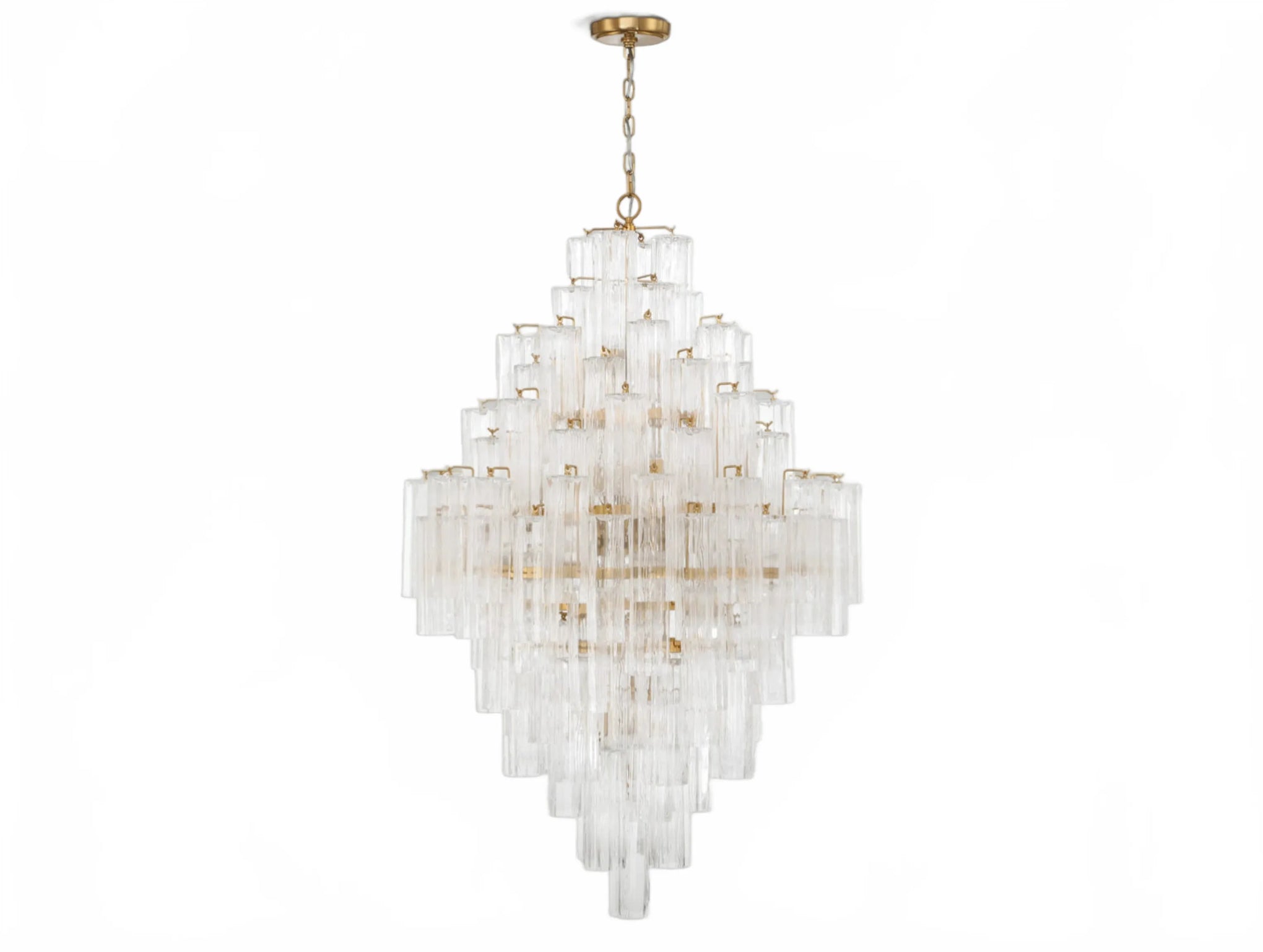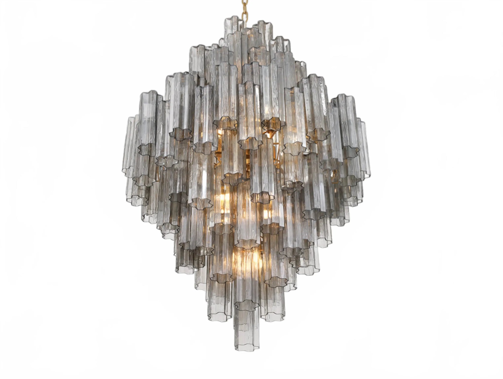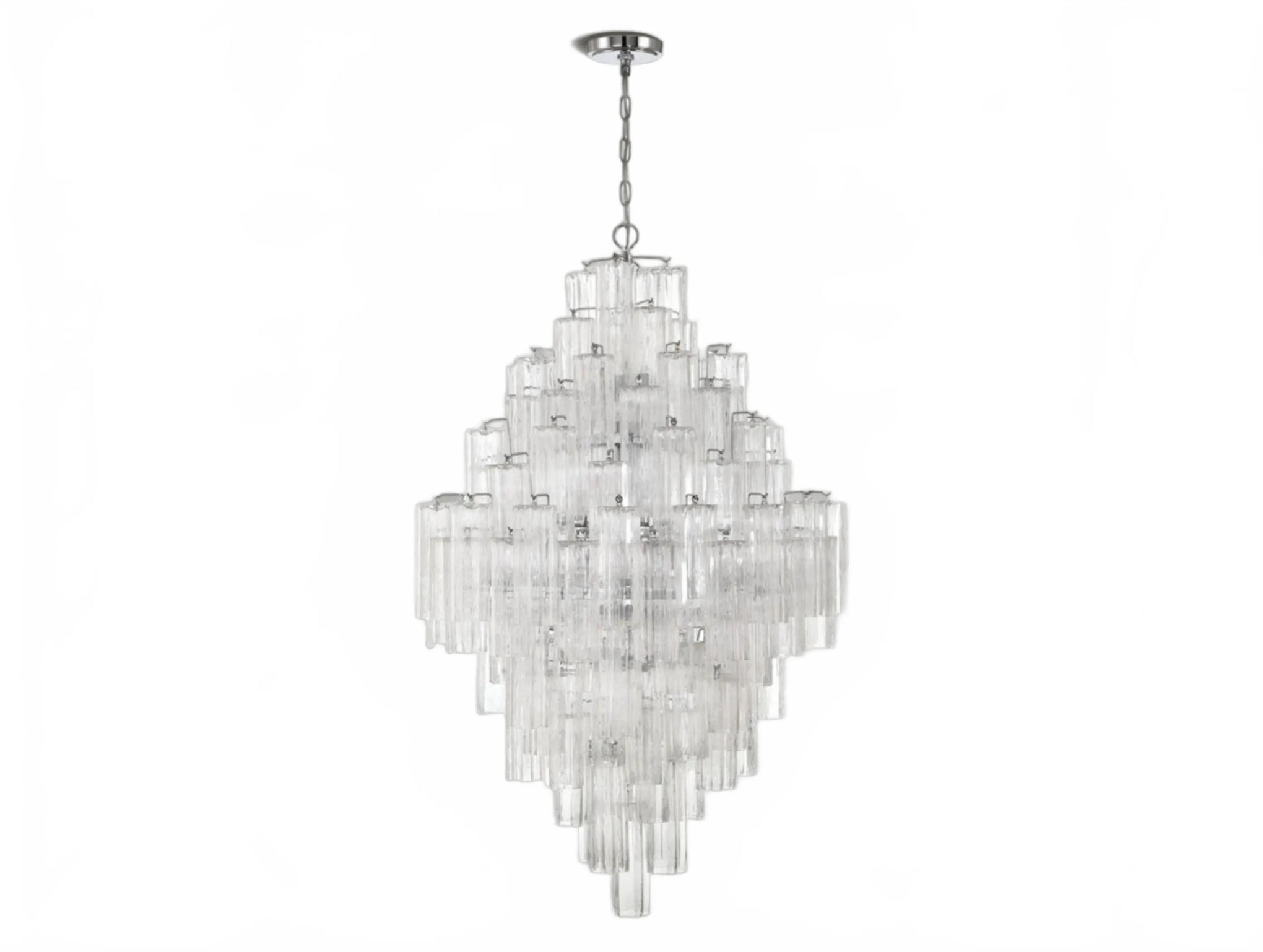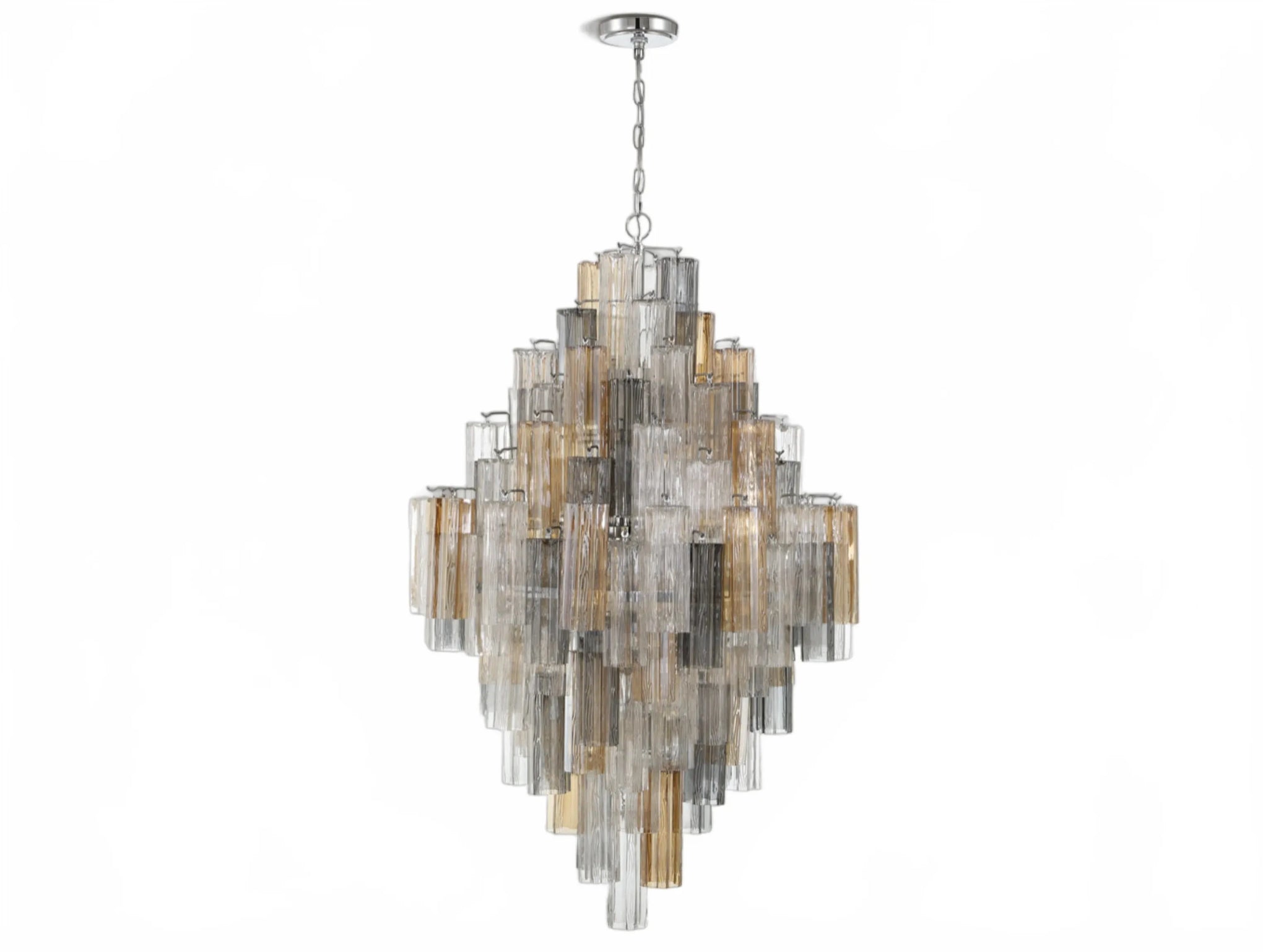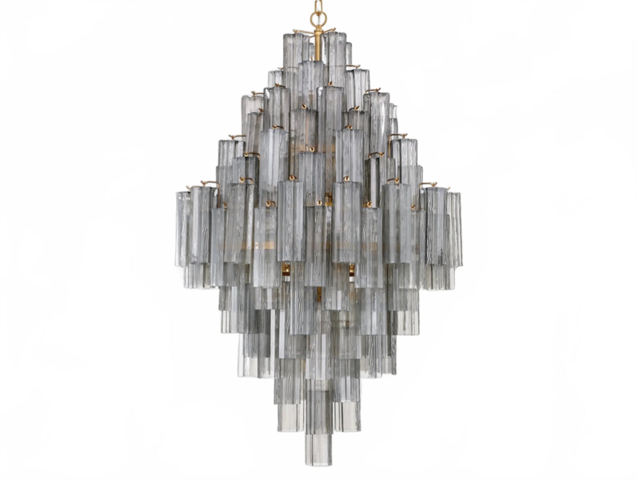 The Adois Foyer Chandelier introduces mid-century artistry into the center of your home. Influenced by the enduring Tronchi style, this chandelier showcases a refined frame in polished chrome or aged brass, paired with transparent rows of textured glass tubes that capture and refract light beautifully.