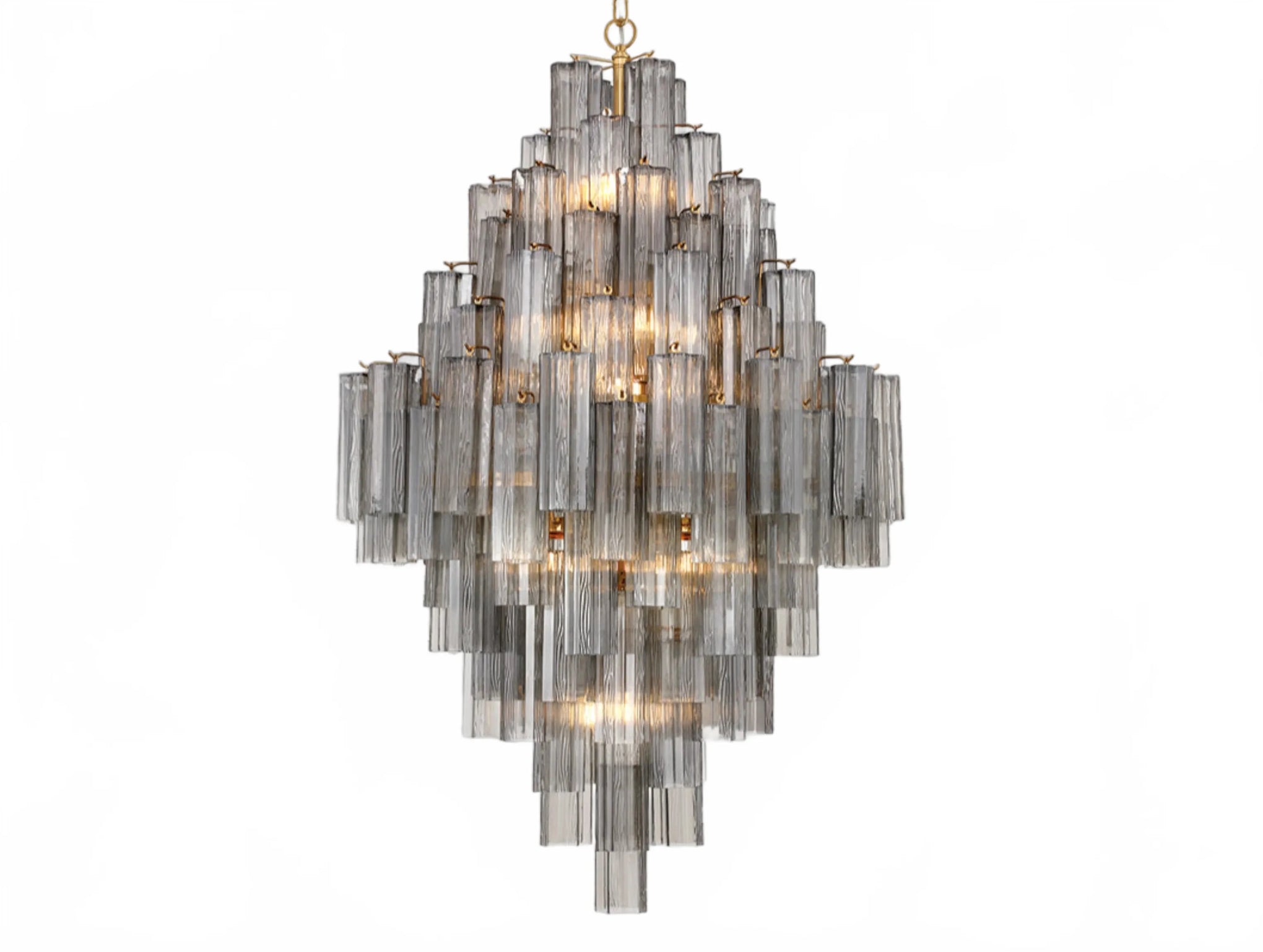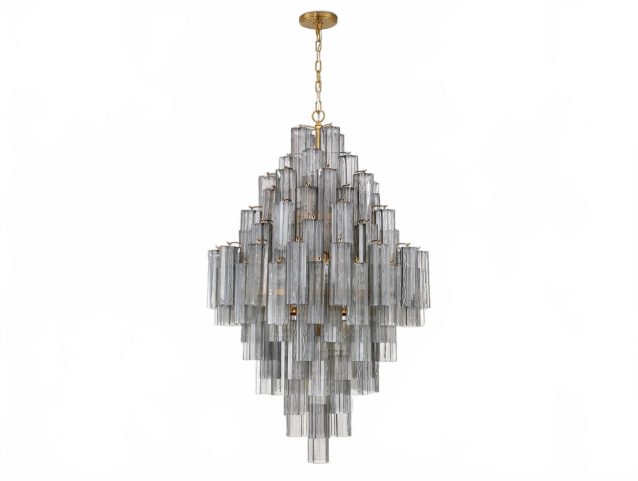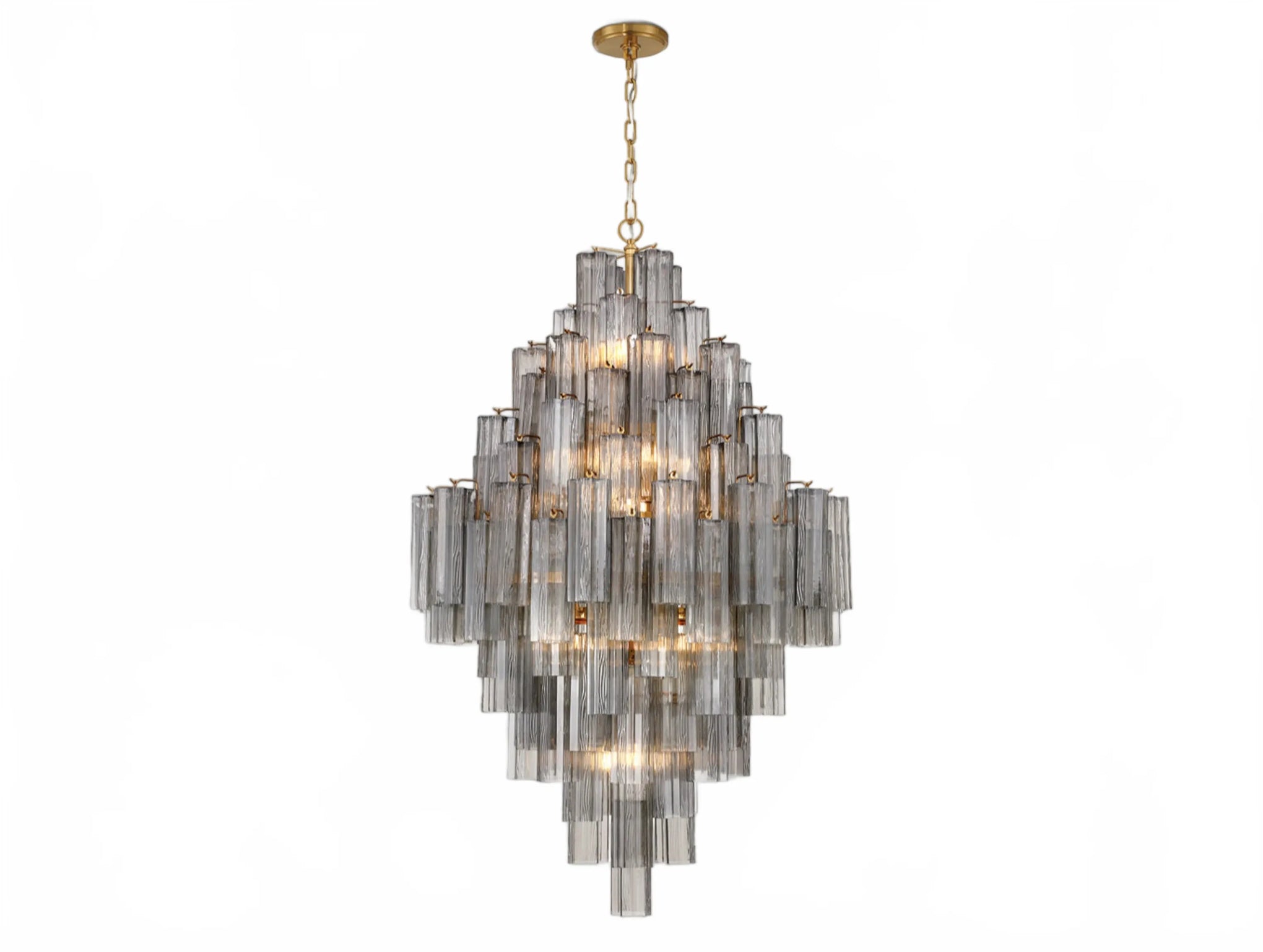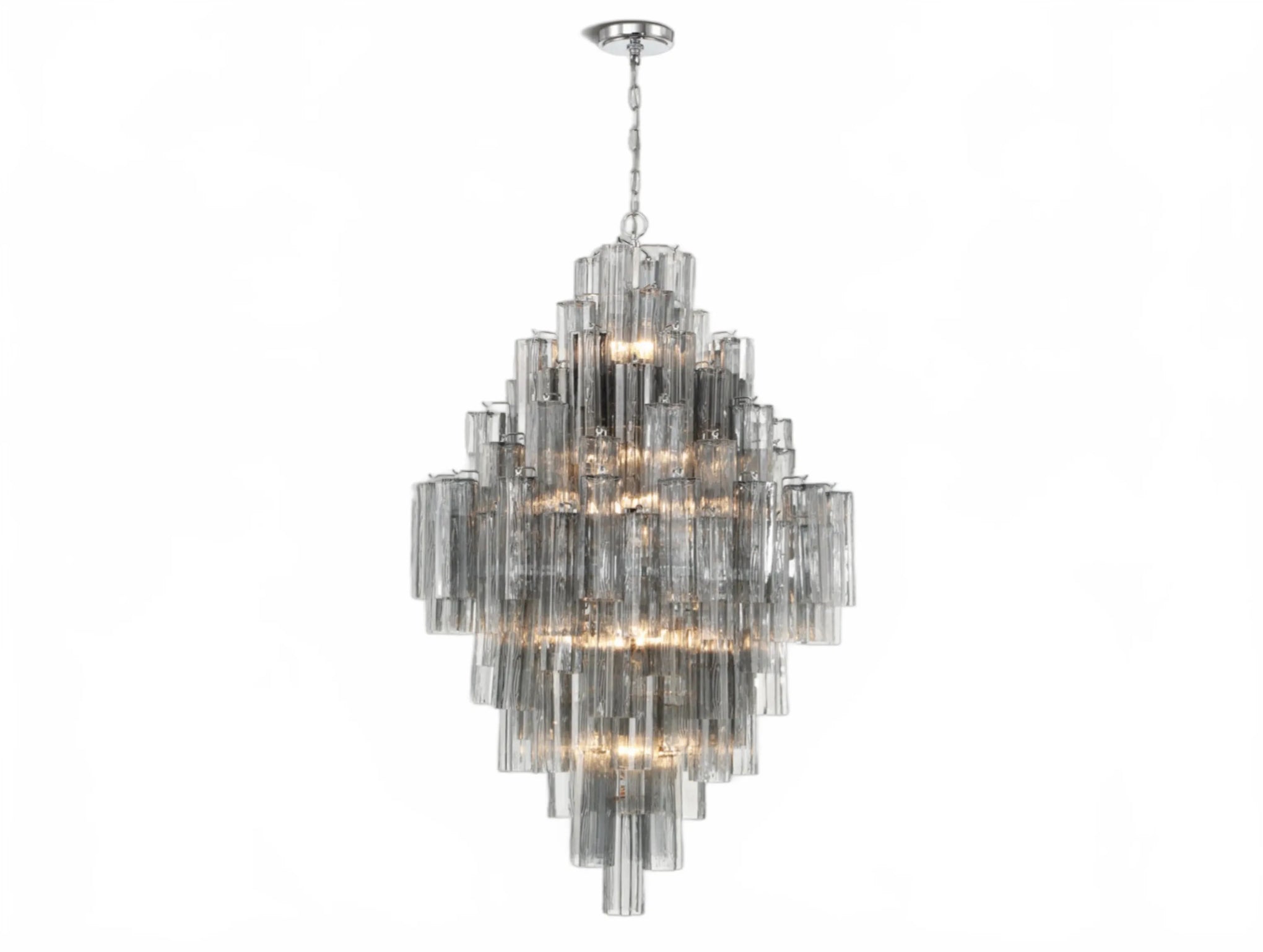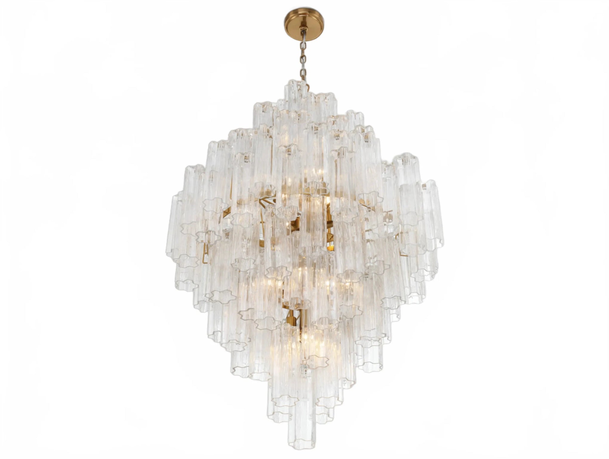 The Adois Foyer Chandelier introduces mid-century artistry into the center of your home. Influenced by the enduring Tronchi style, this chandelier showcases a refined frame in polished chrome or aged brass, paired with transparent rows of textured glass tubes that capture and refract light beautifully.