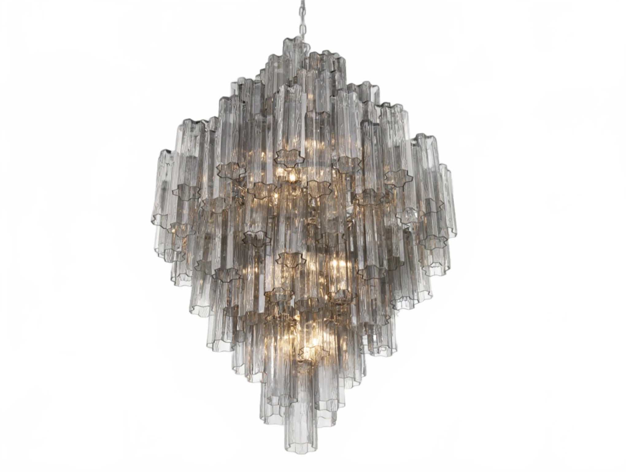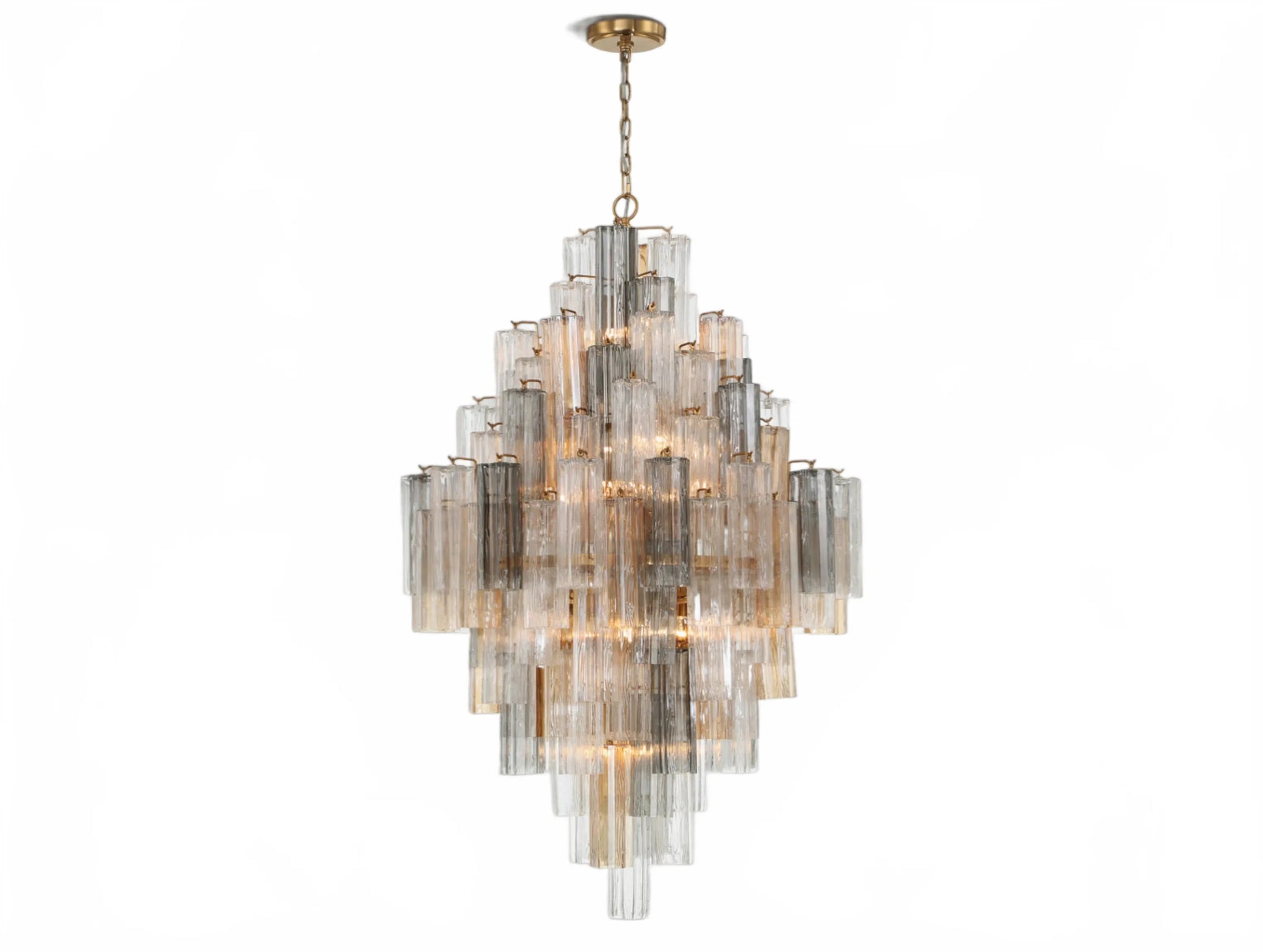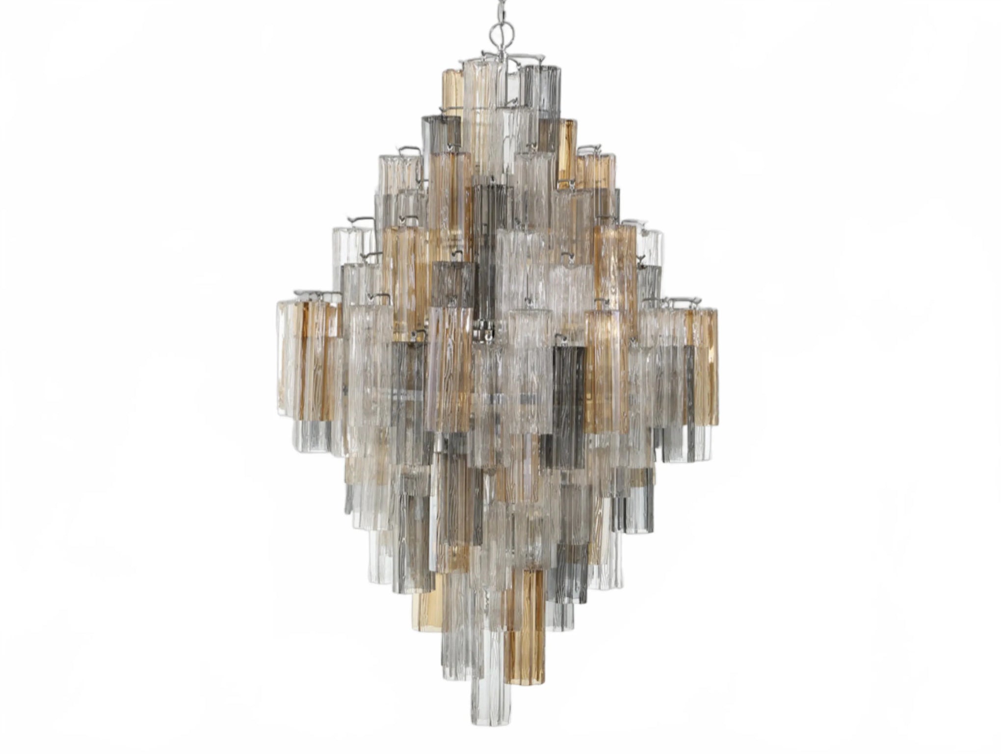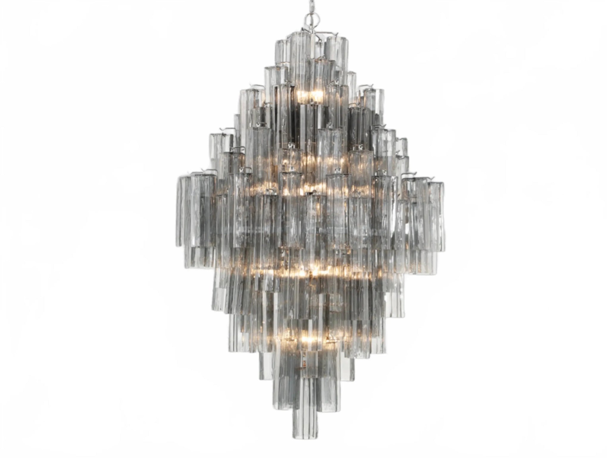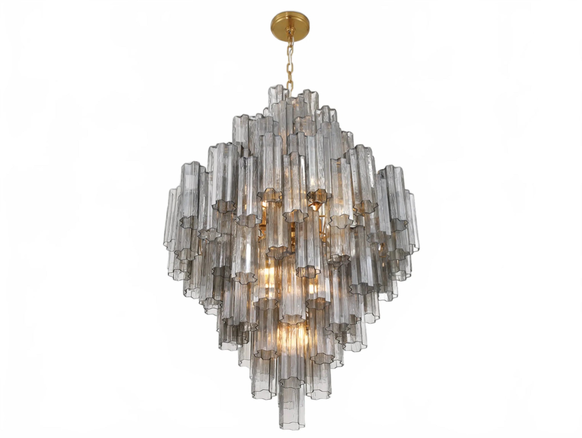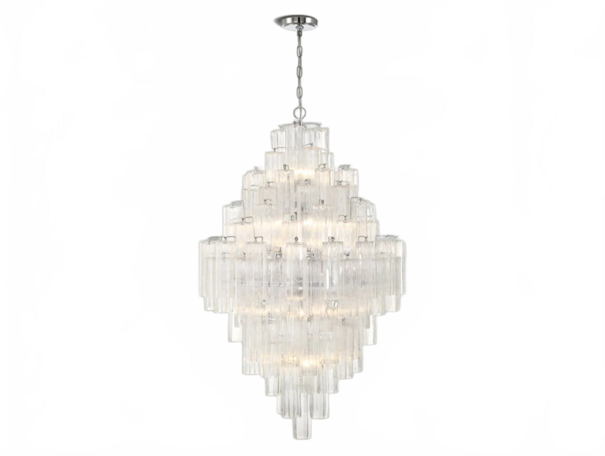 The Adois Foyer Chandelier introduces mid-century artistry into the center of your home. Influenced by the enduring Tronchi style, this chandelier showcases a refined frame in polished chrome or aged brass, paired with transparent rows of textured glass tubes that capture and refract light beautifully.