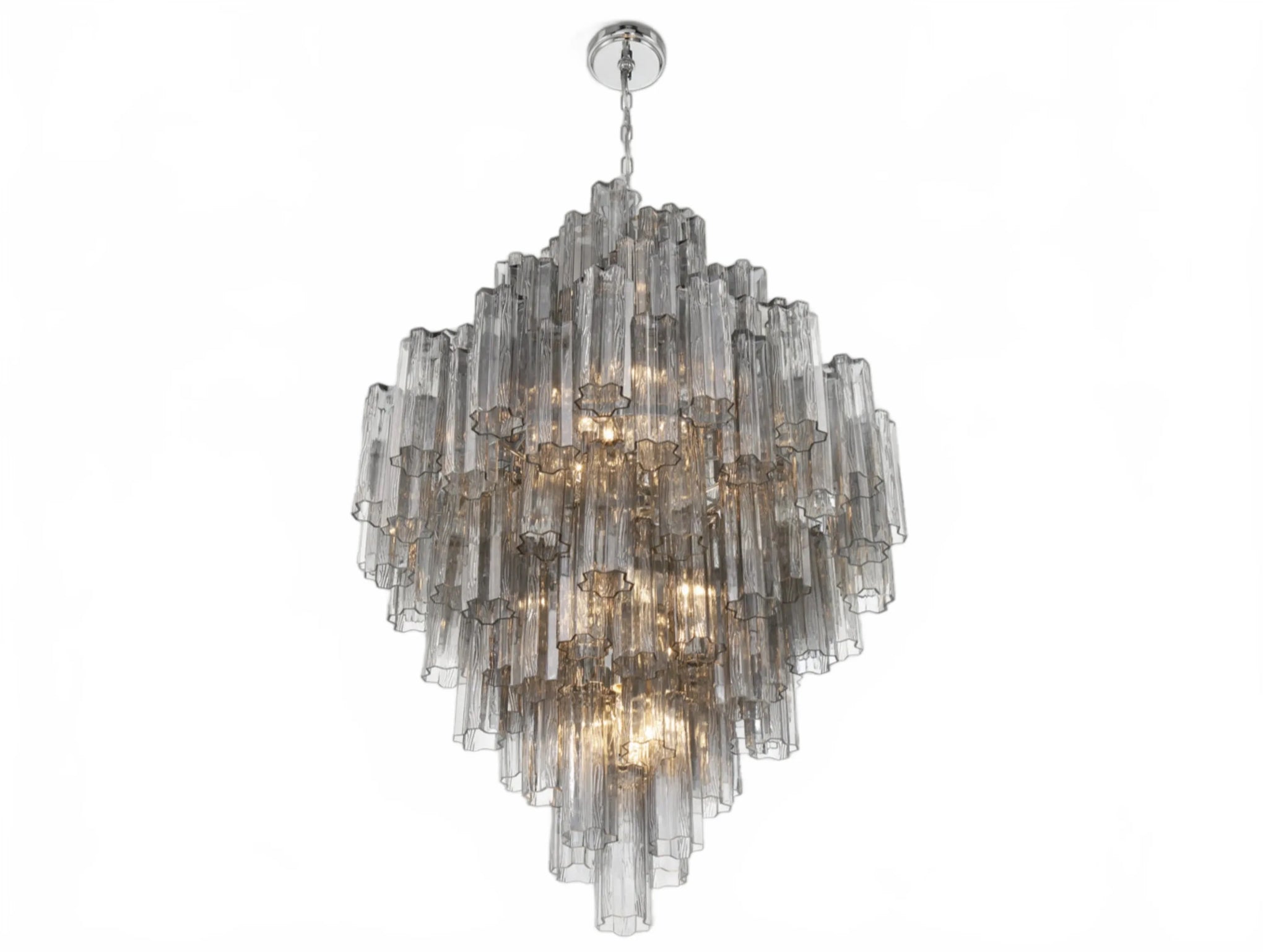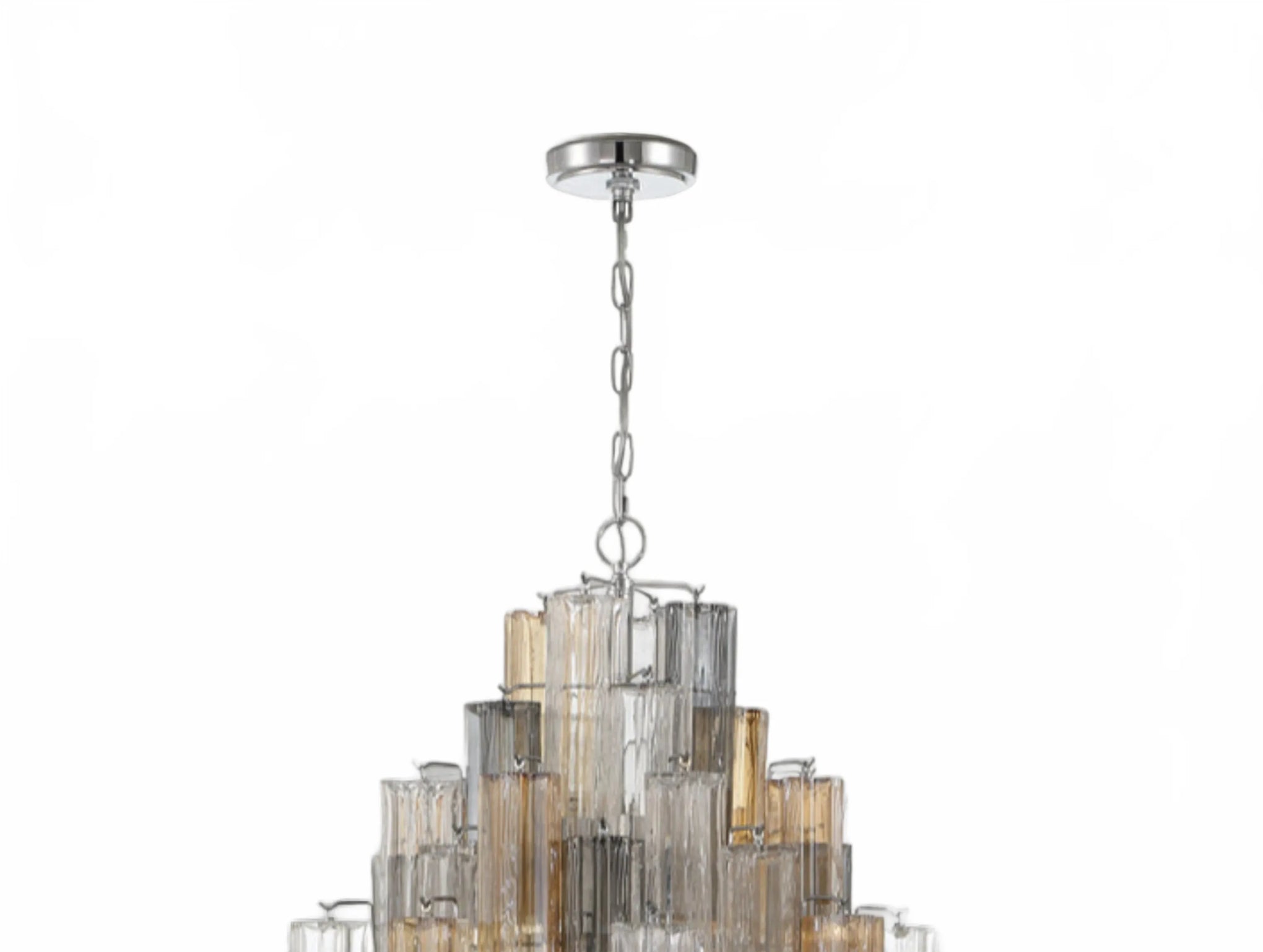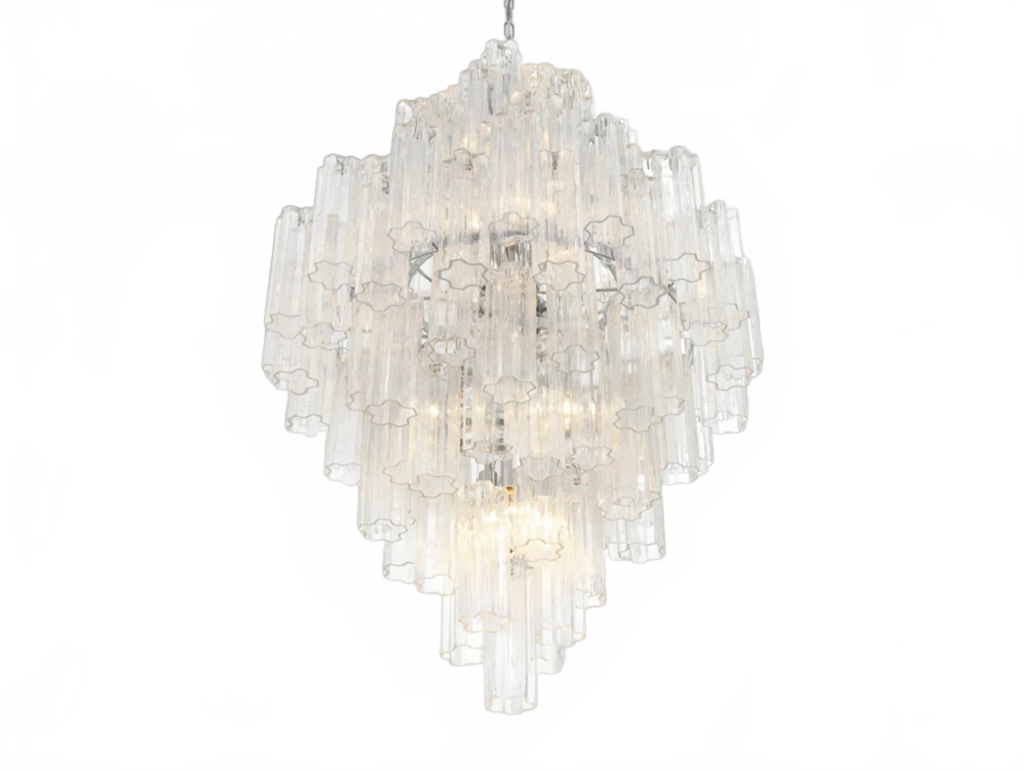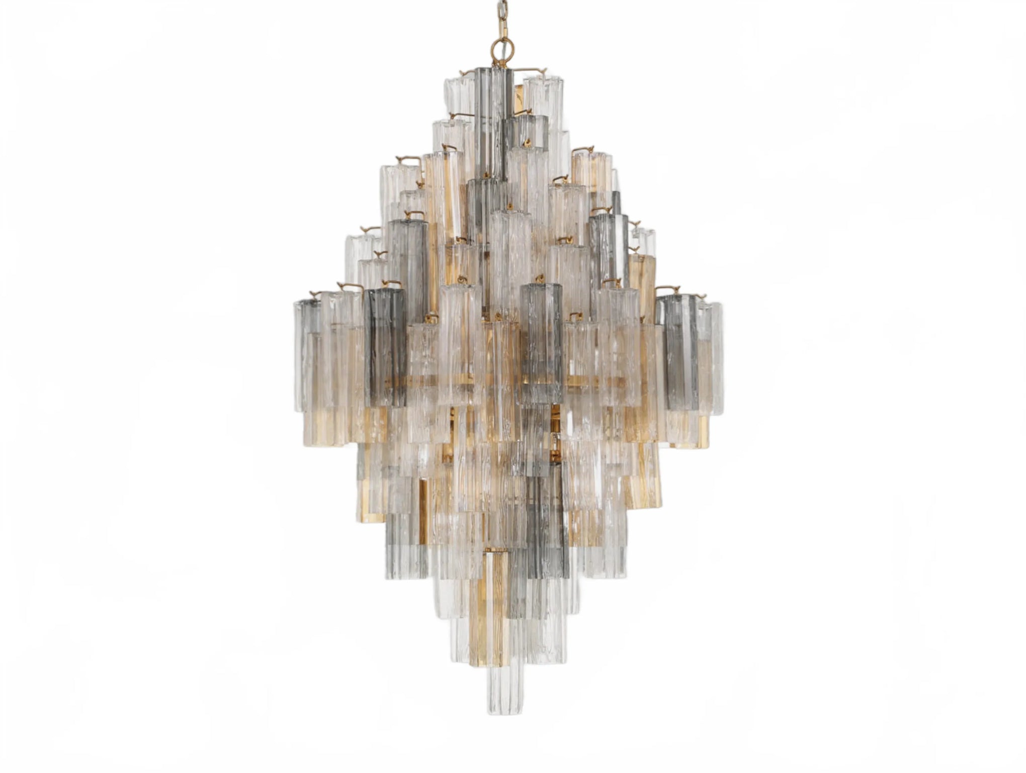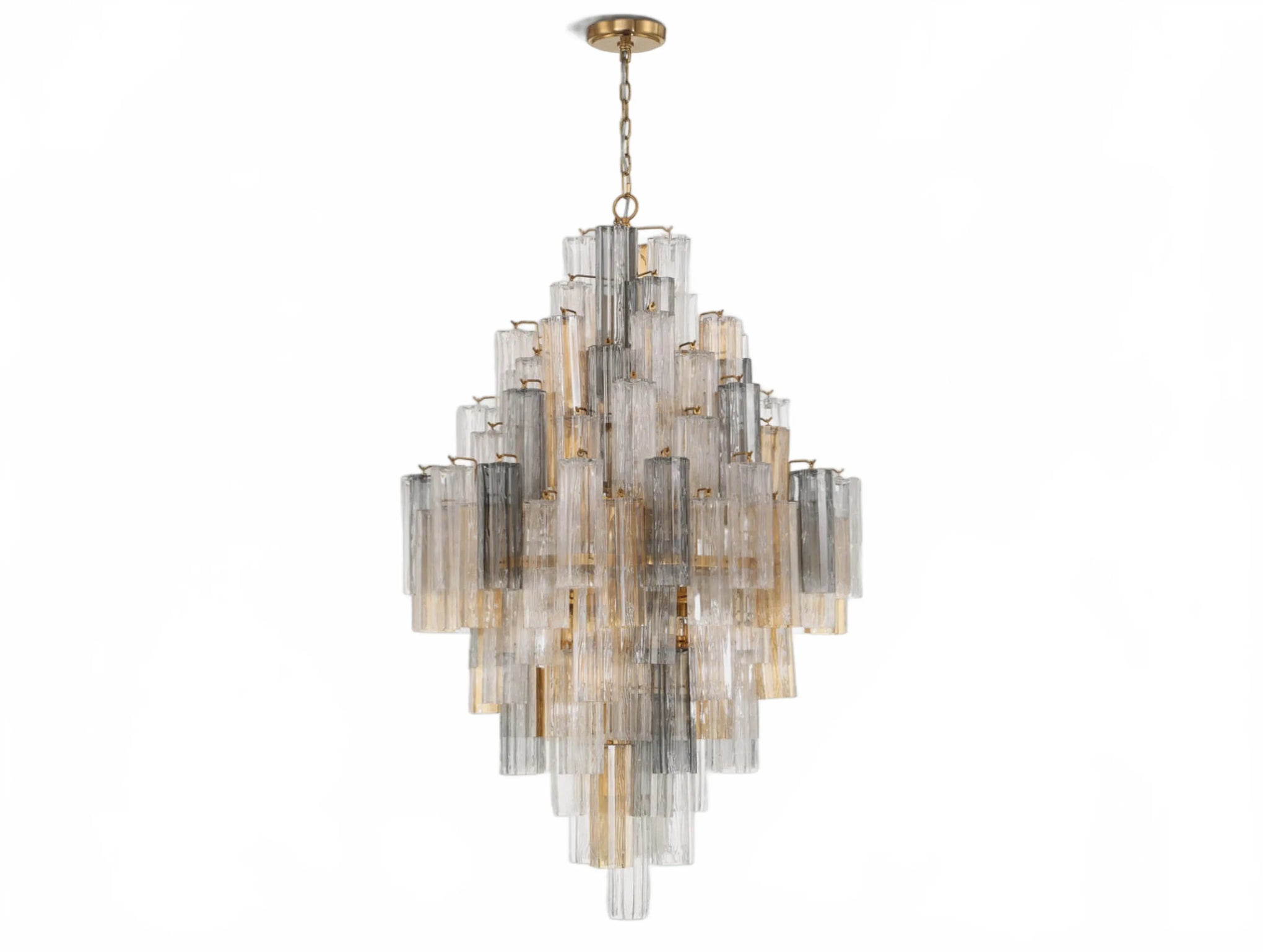 The Adois Foyer Chandelier introduces mid-century artistry into the center of your home. Influenced by the enduring Tronchi style, this chandelier showcases a refined frame in polished chrome or aged brass, paired with transparent rows of textured glass tubes that capture and refract light beautifully.