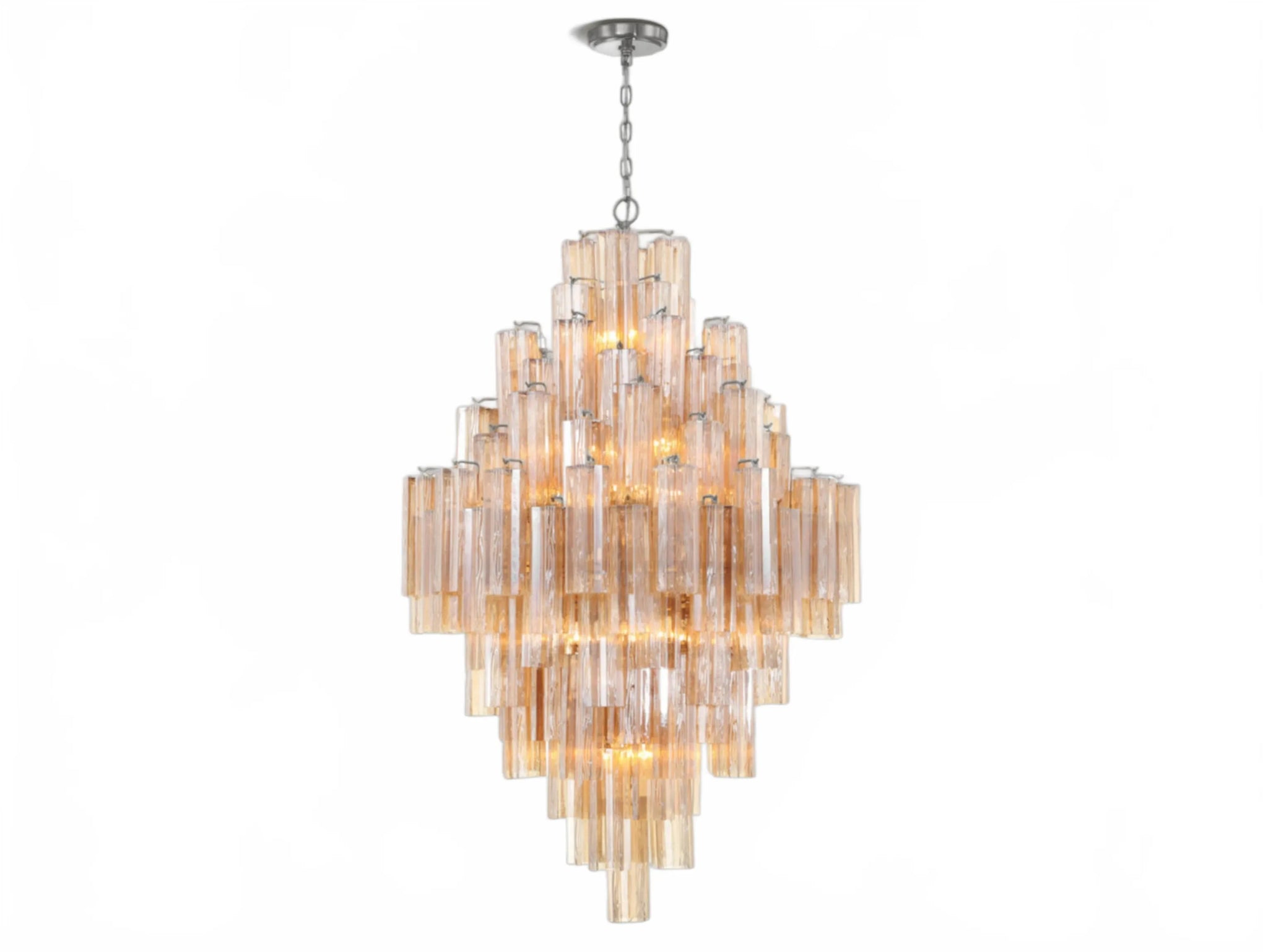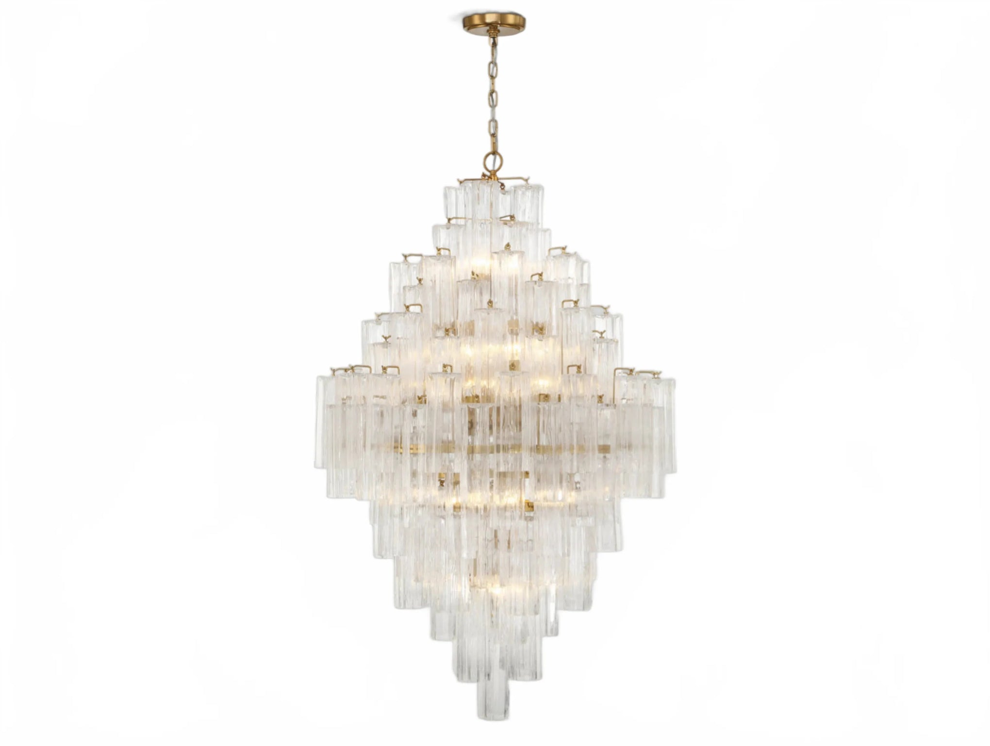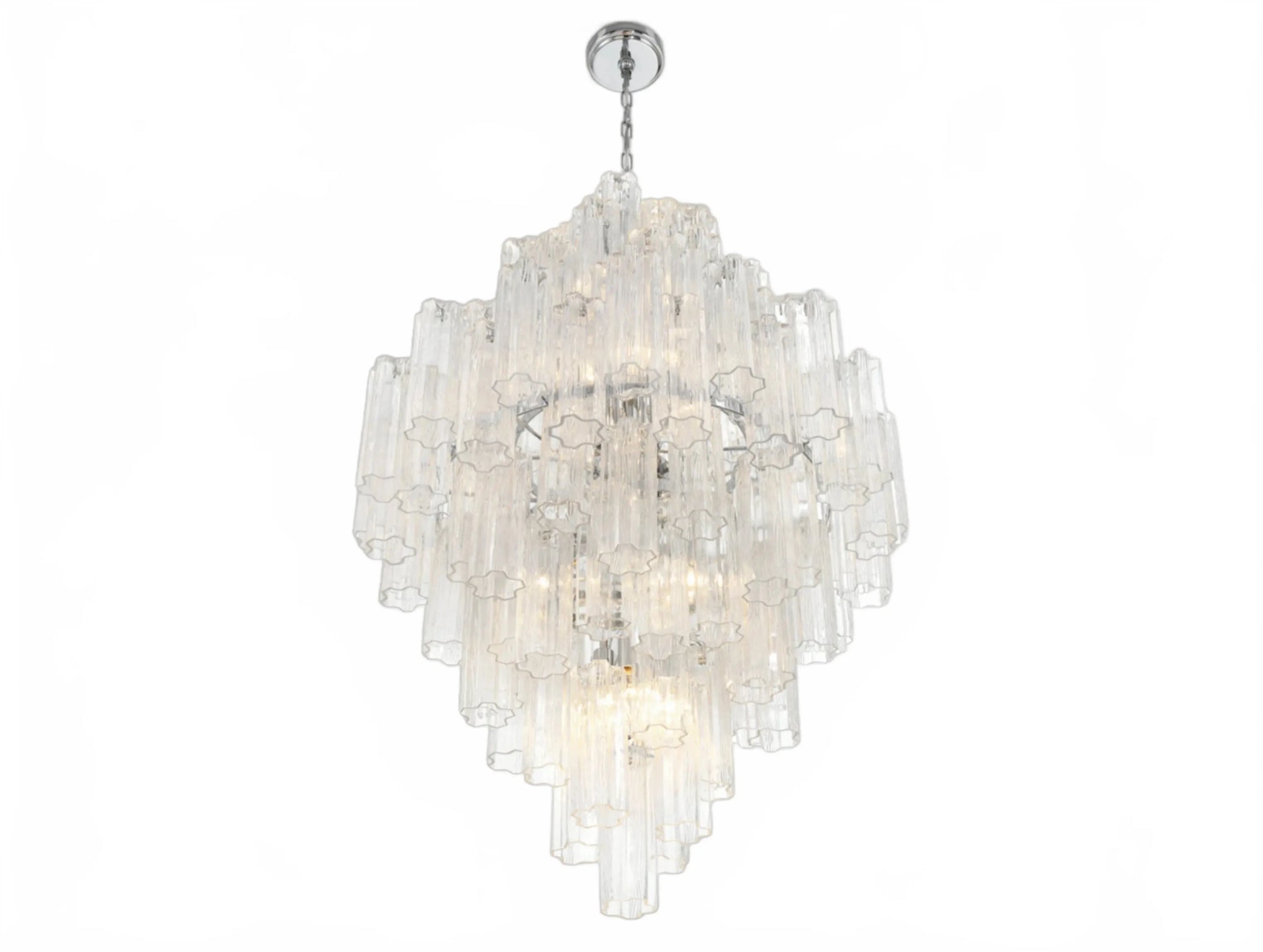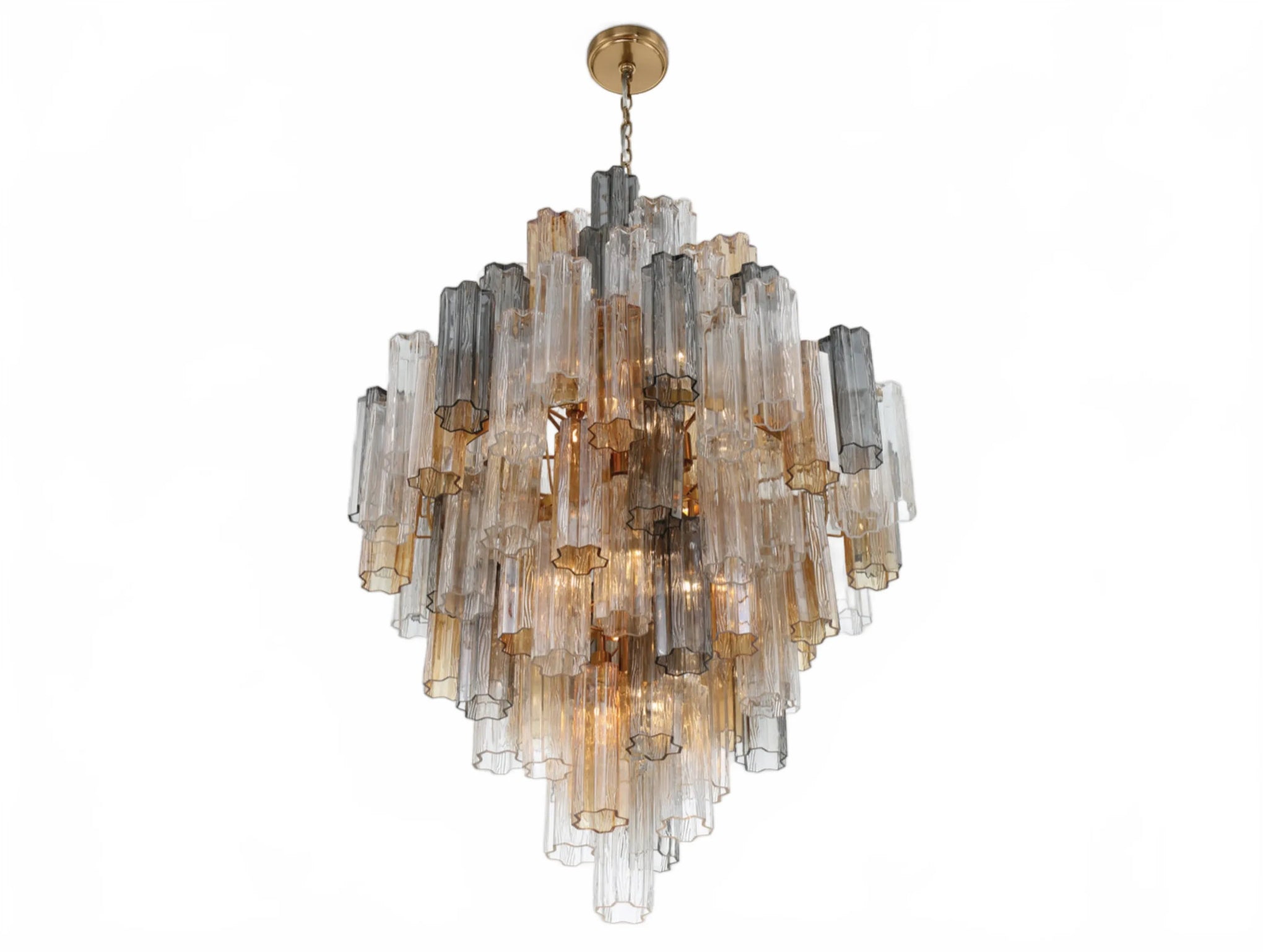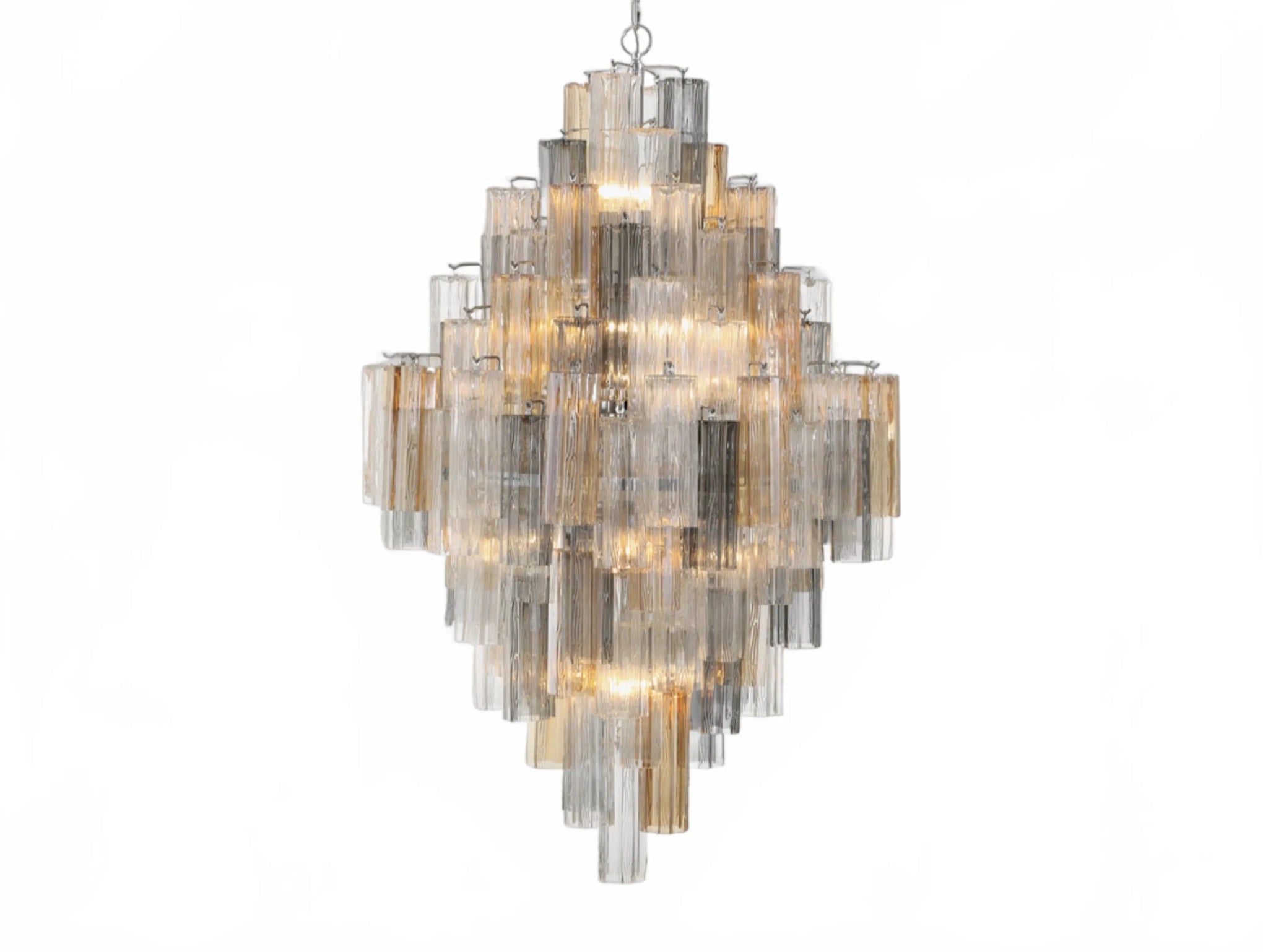 The Adois Foyer Chandelier introduces mid-century artistry into the center of your home. Influenced by the enduring Tronchi style, this chandelier showcases a refined frame in polished chrome or aged brass, paired with transparent rows of textured glass tubes that capture and refract light beautifully.