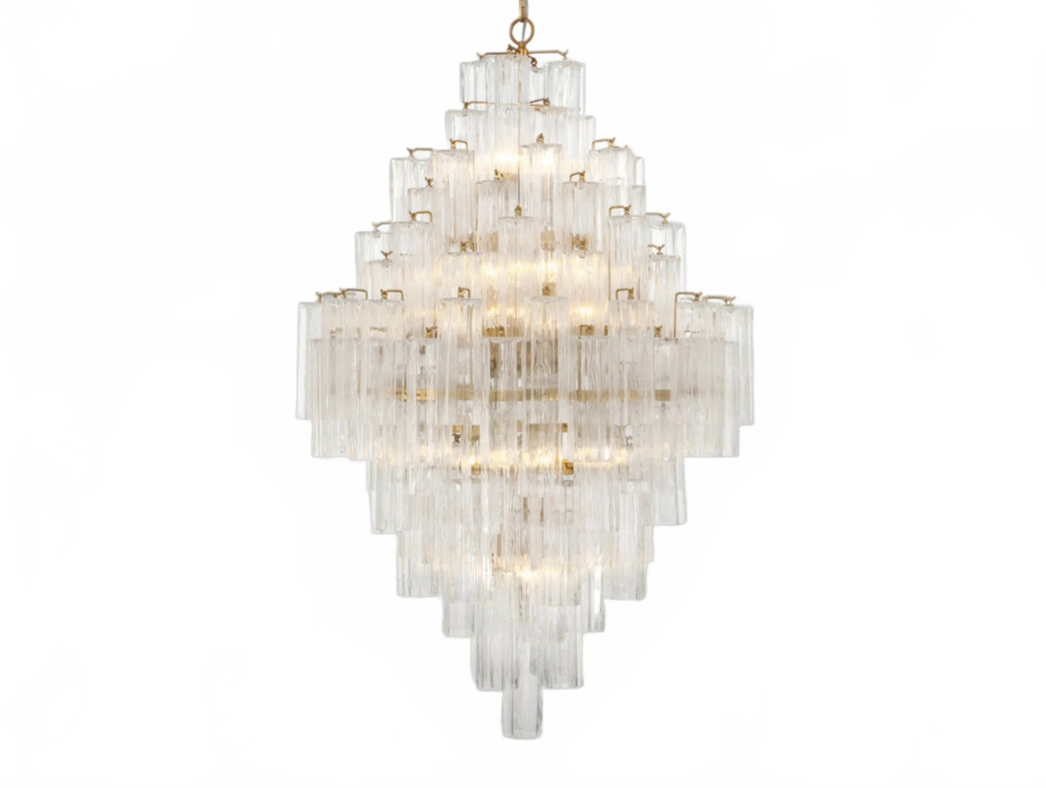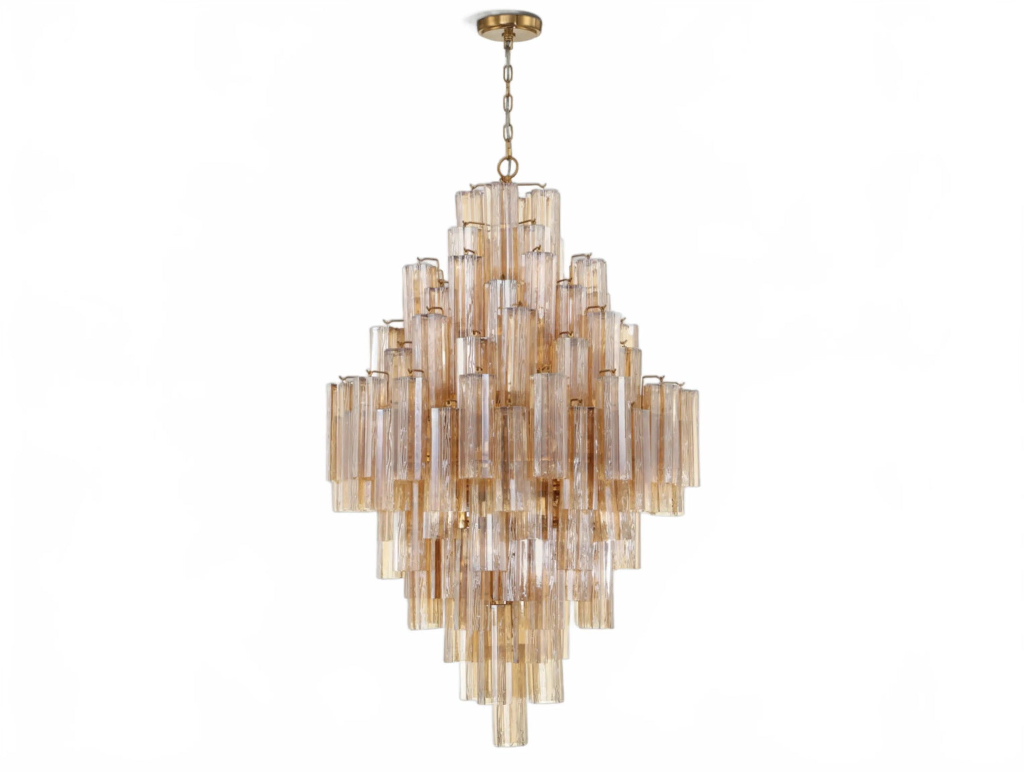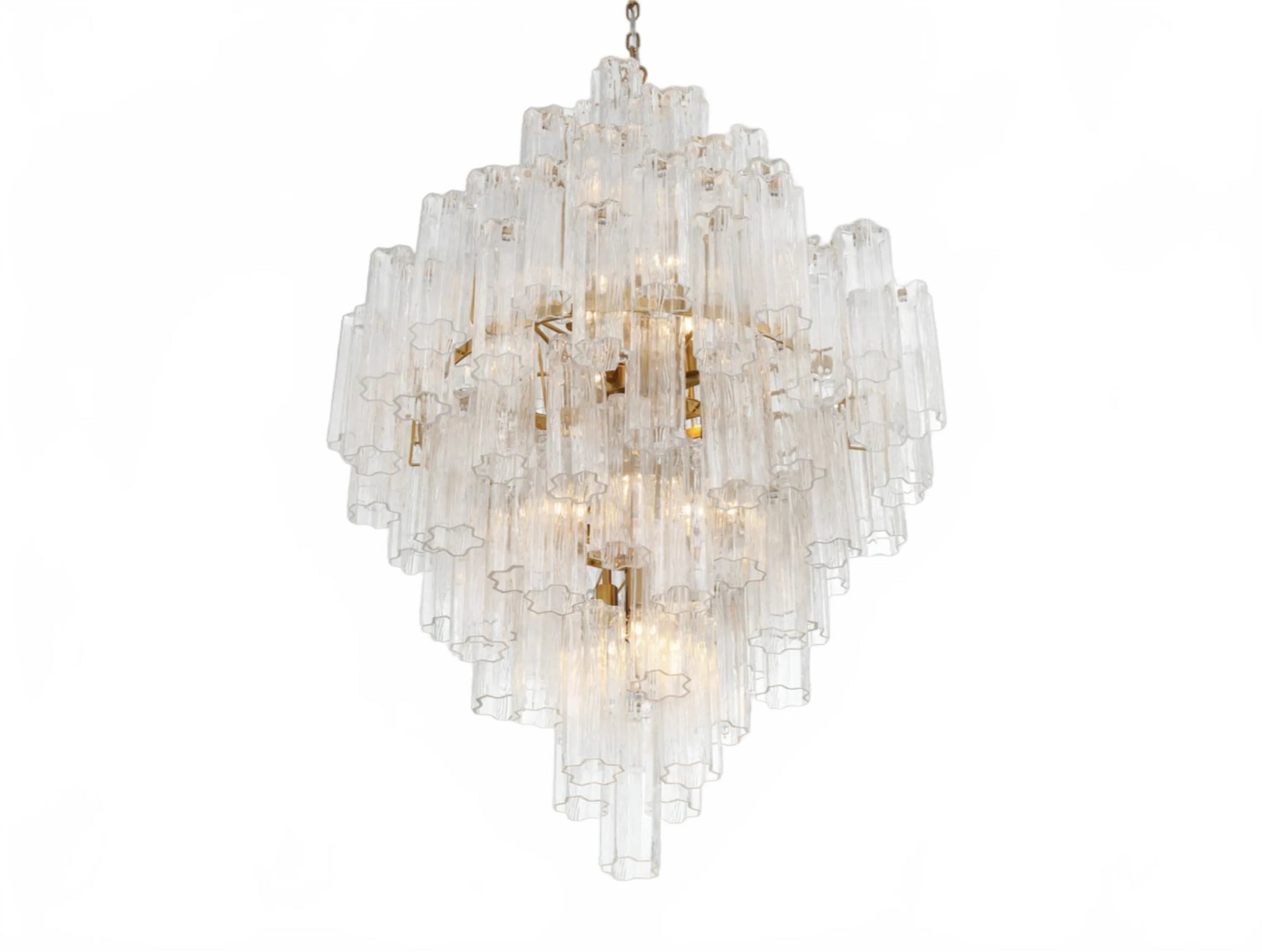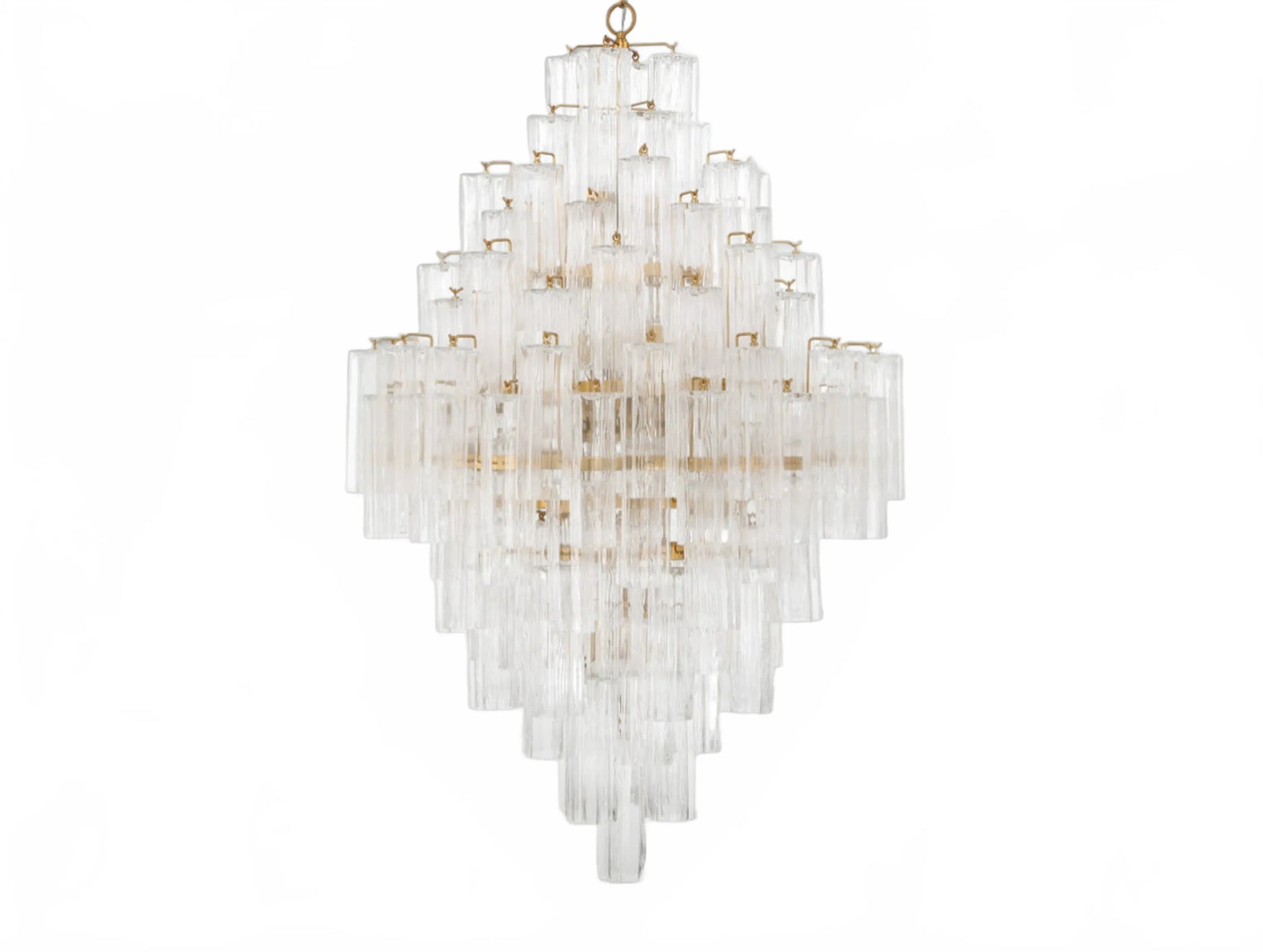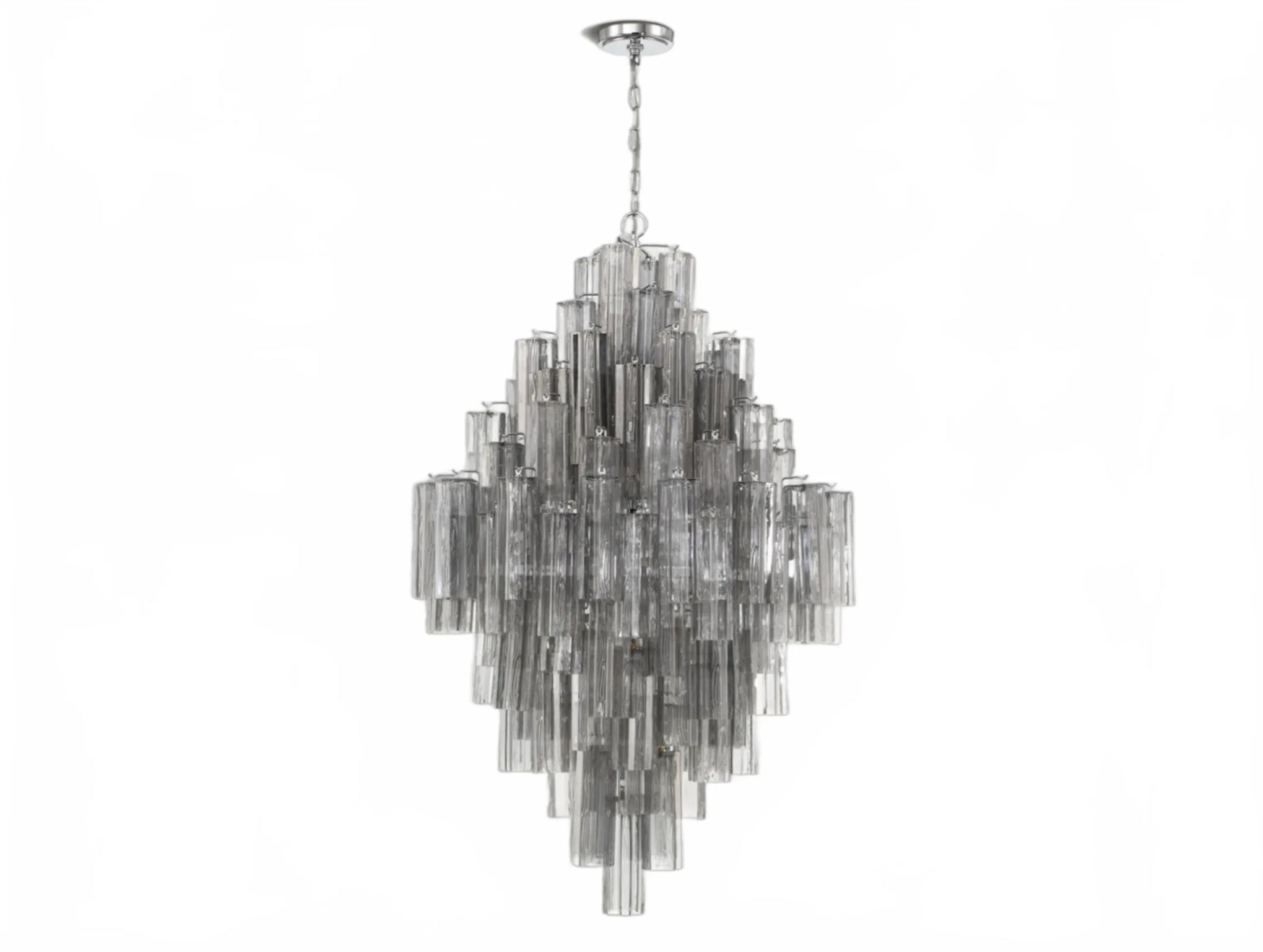 The Adois Foyer Chandelier introduces mid-century artistry into the center of your home. Influenced by the enduring Tronchi style, this chandelier showcases a refined frame in polished chrome or aged brass, paired with transparent rows of textured glass tubes that capture and refract light beautifully.