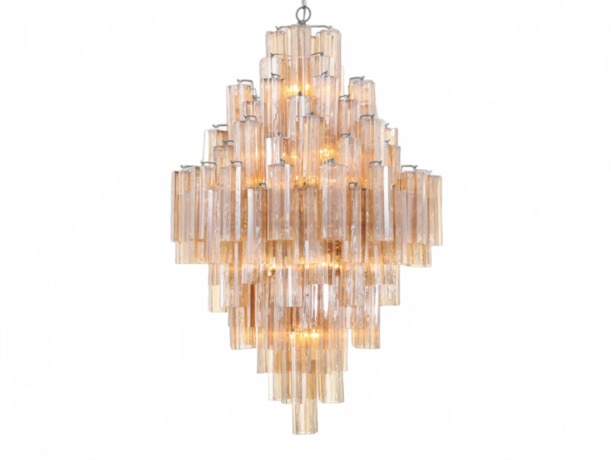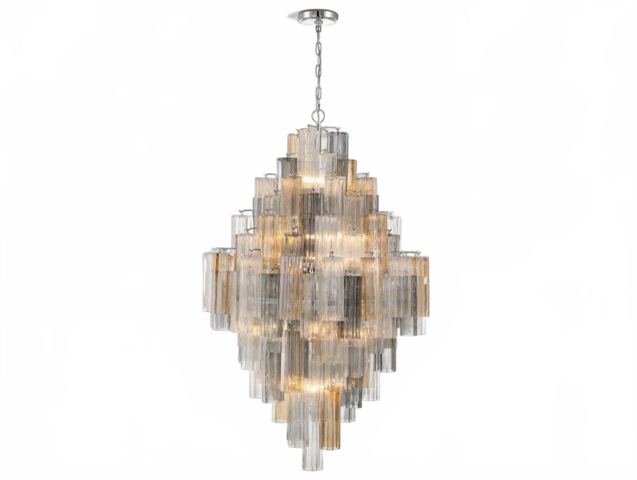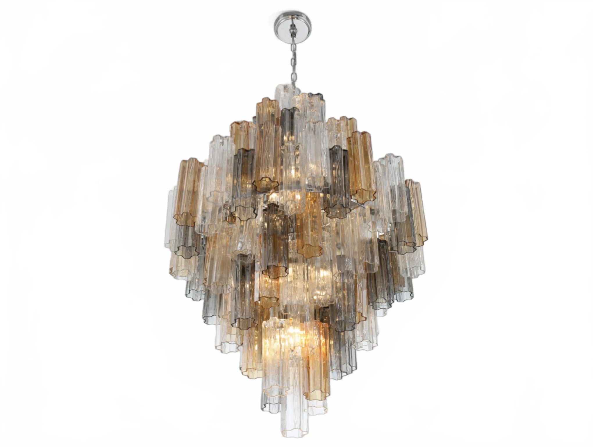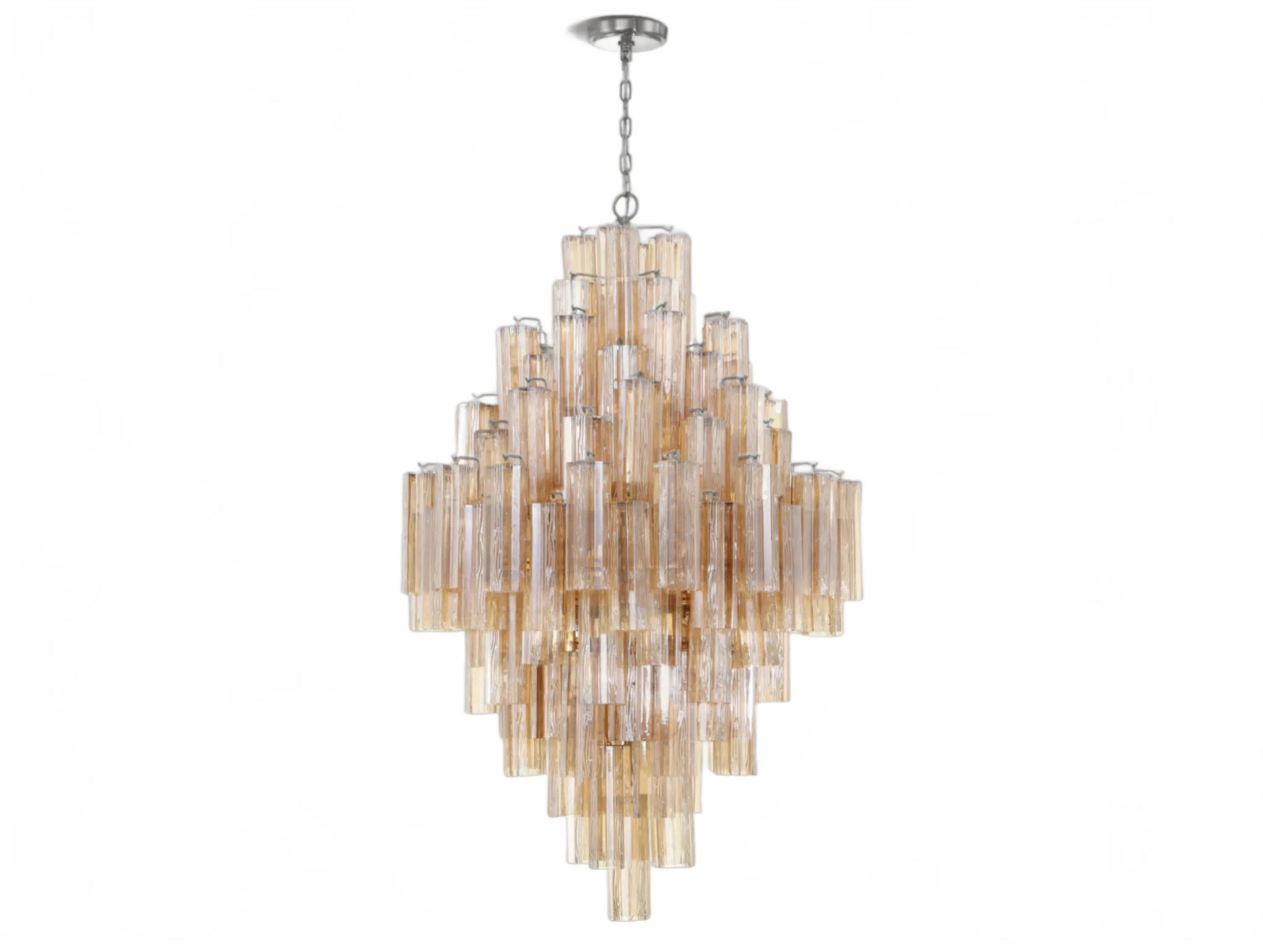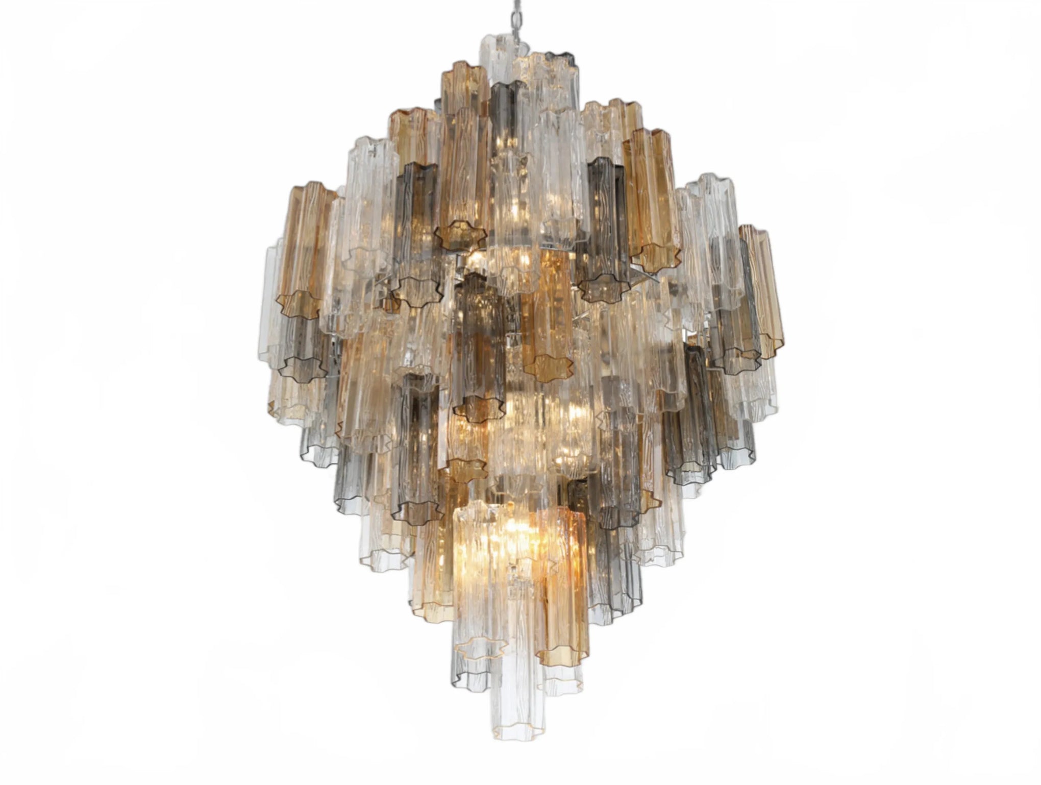 The Adois Foyer Chandelier introduces mid-century artistry into the center of your home. Influenced by the enduring Tronchi style, this chandelier showcases a refined frame in polished chrome or aged brass, paired with transparent rows of textured glass tubes that capture and refract light beautifully.