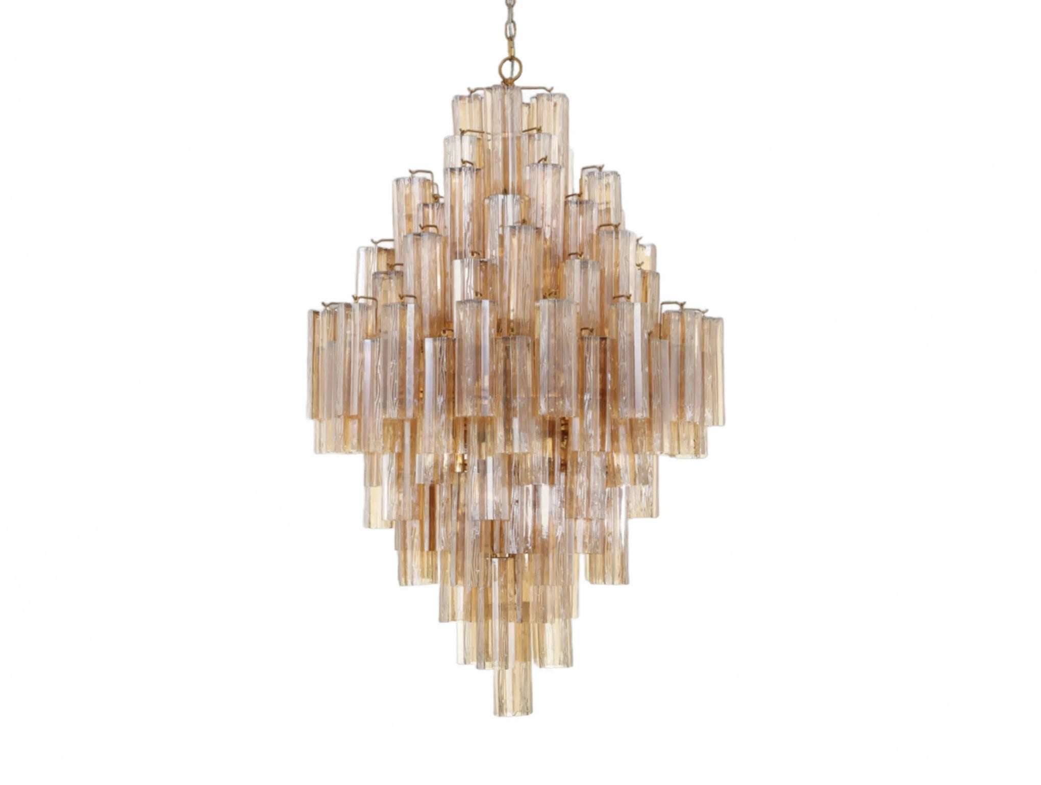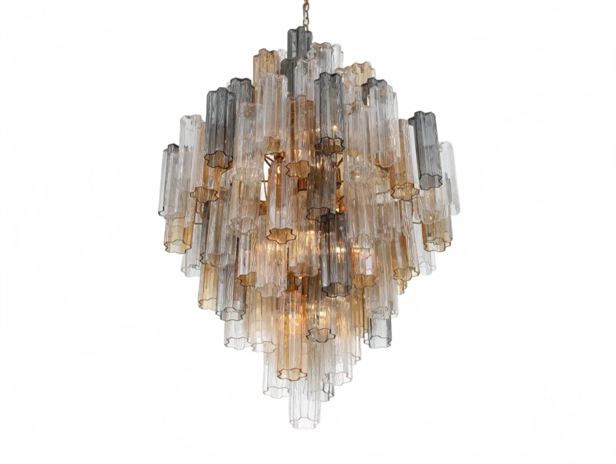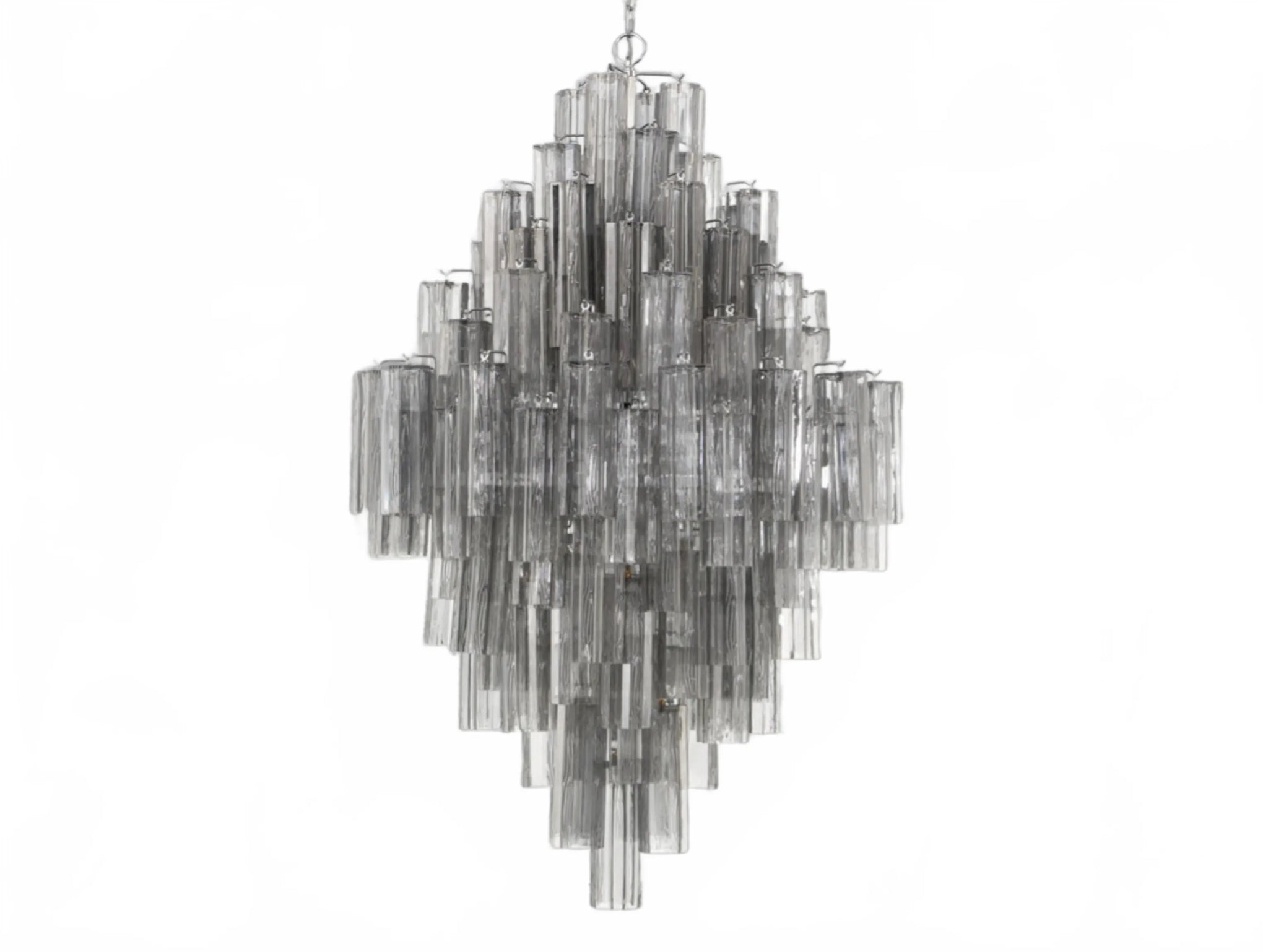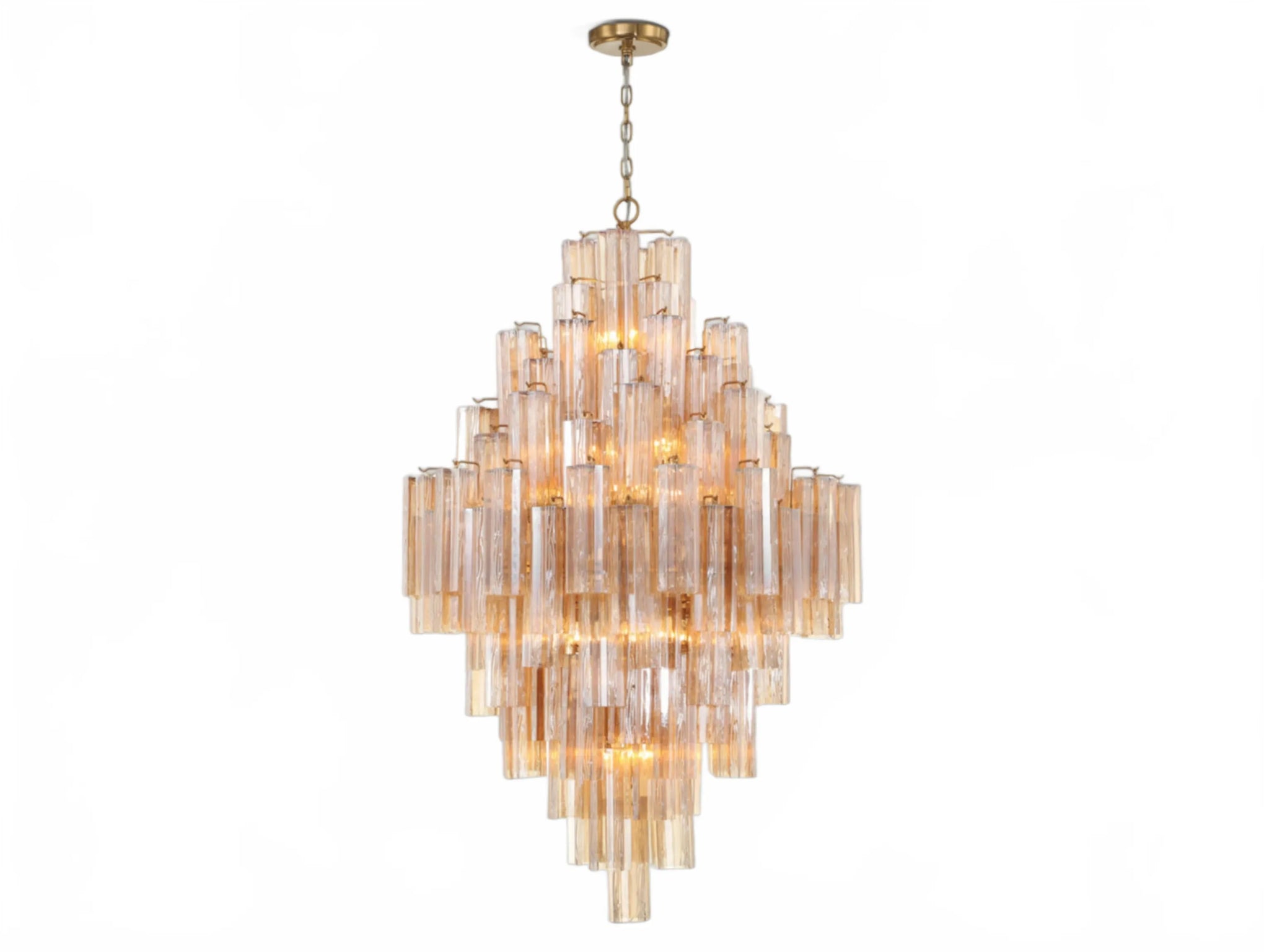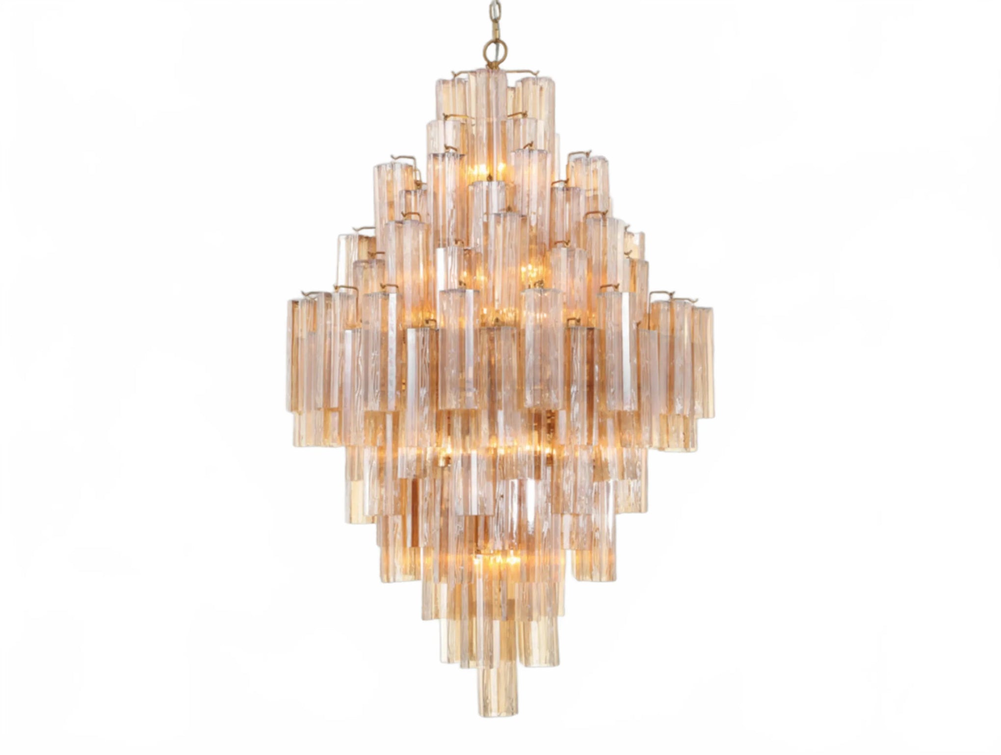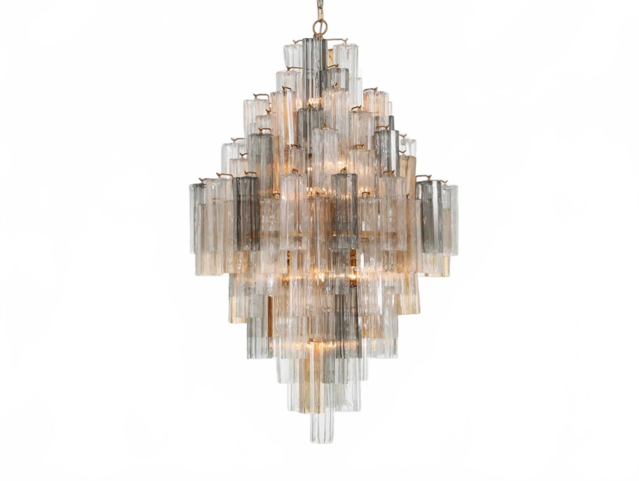 The Adois Foyer Chandelier introduces mid-century artistry into the center of your home. Influenced by the enduring Tronchi style, this chandelier showcases a refined frame in polished chrome or aged brass, paired with transparent rows of textured glass tubes that capture and refract light beautifully.