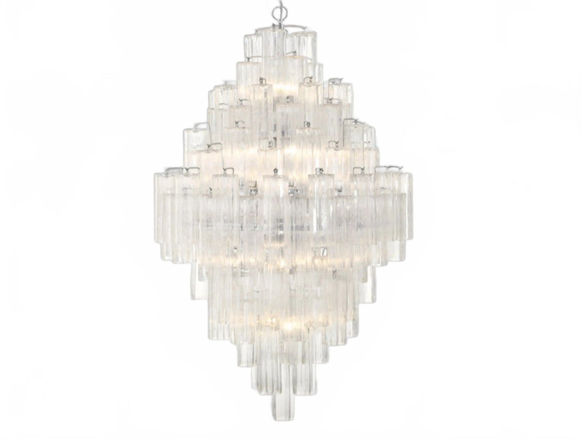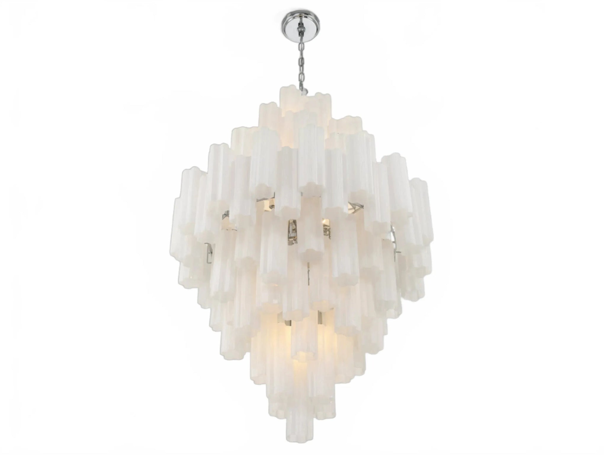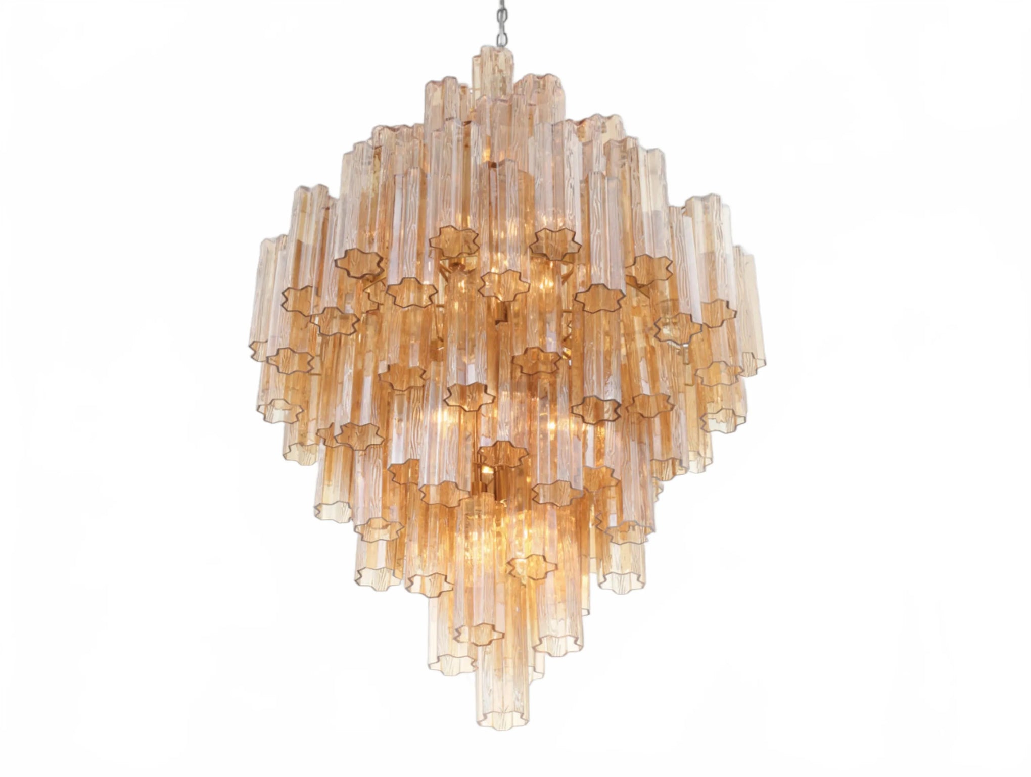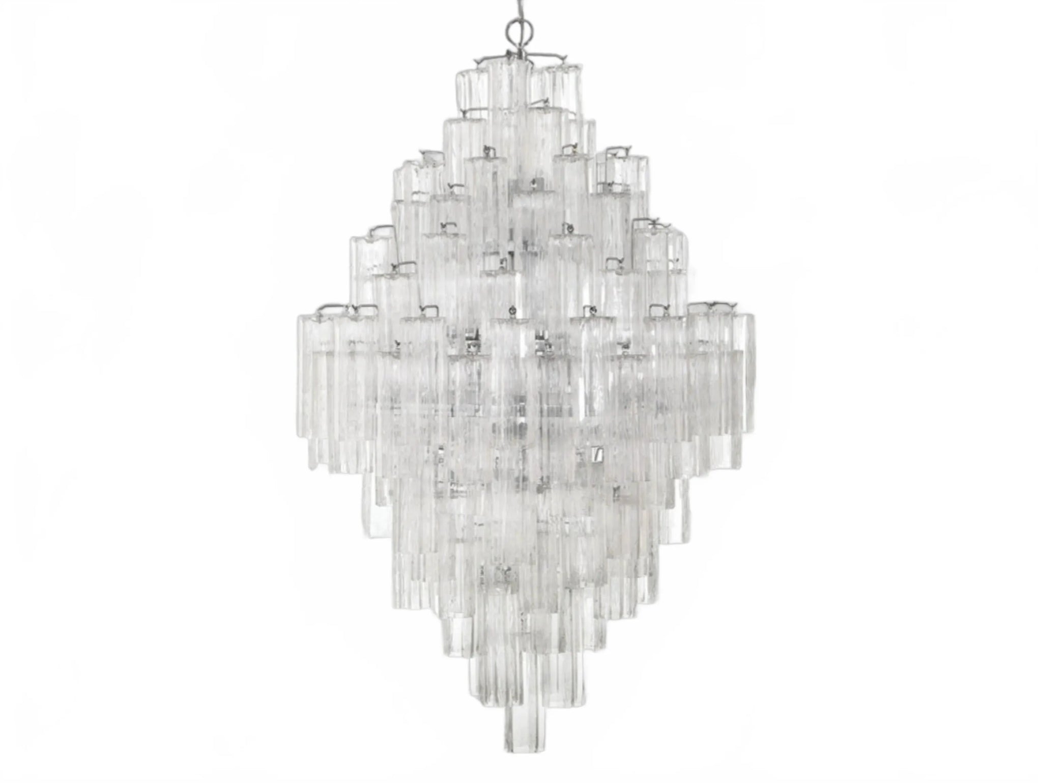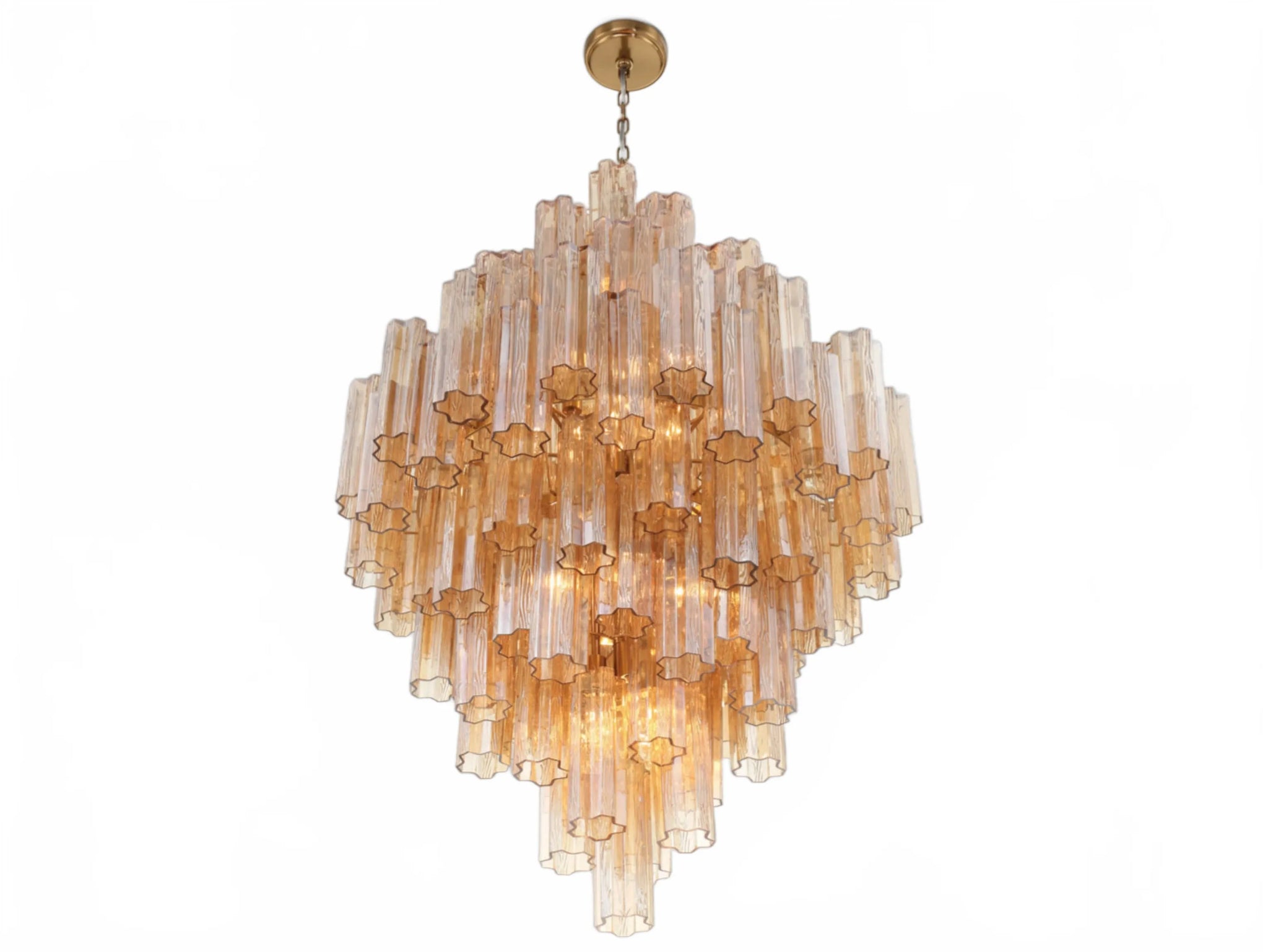The Adois Foyer Chandelier introduces mid-century artistry into the center of your home. Influenced by the enduring Tronchi style, this chandelier showcases a refined frame in polished chrome or aged brass, paired with transparent rows of textured glass tubes that capture and refract light beautifully.