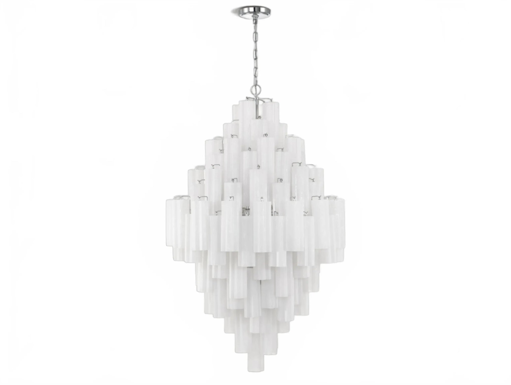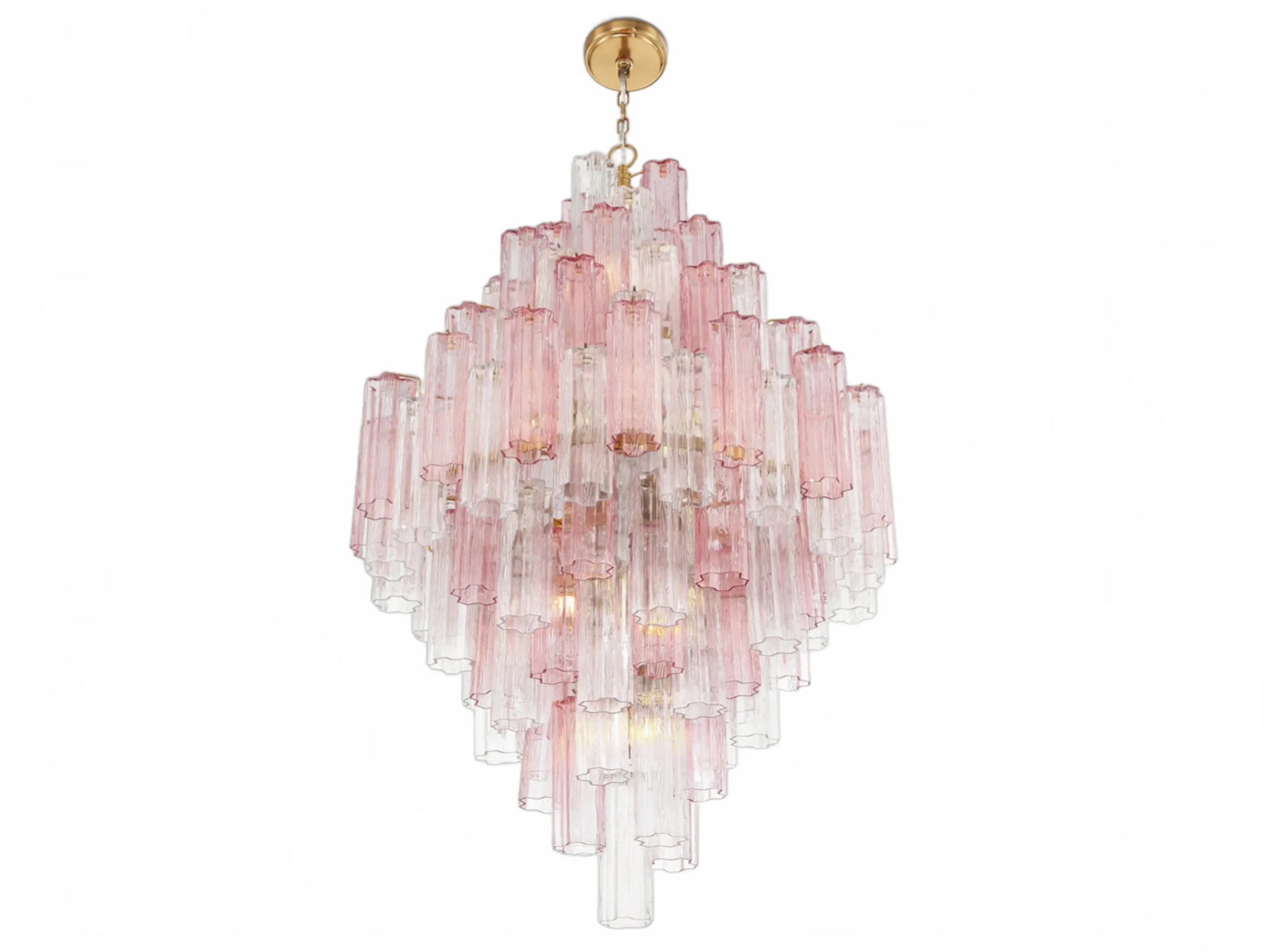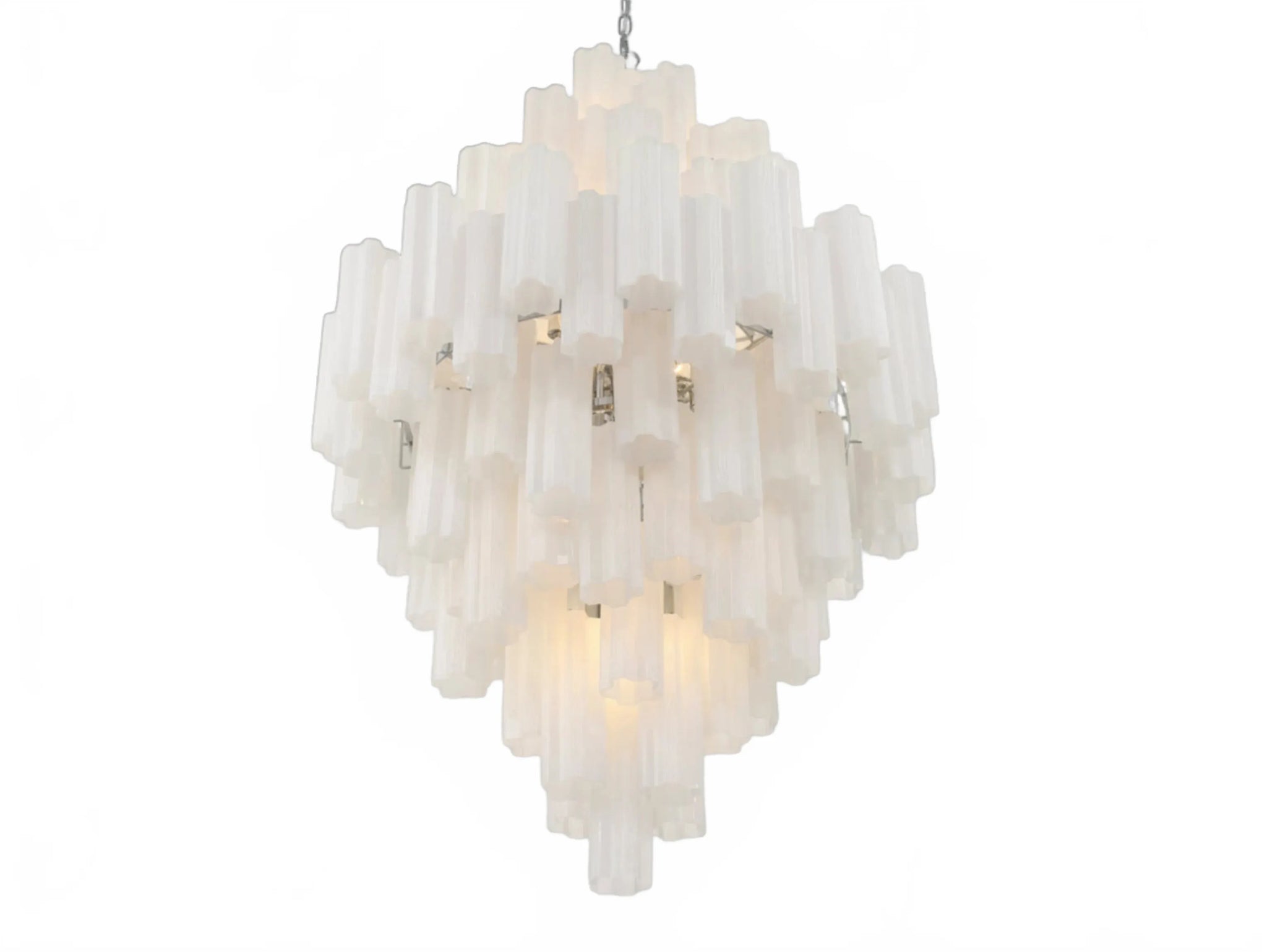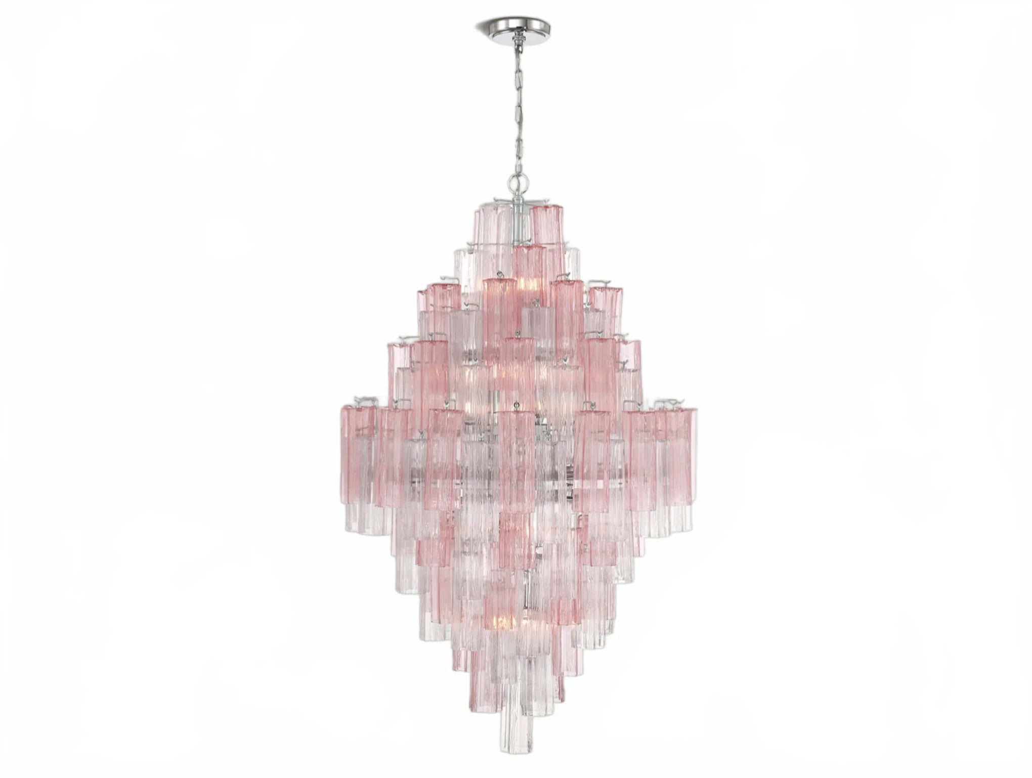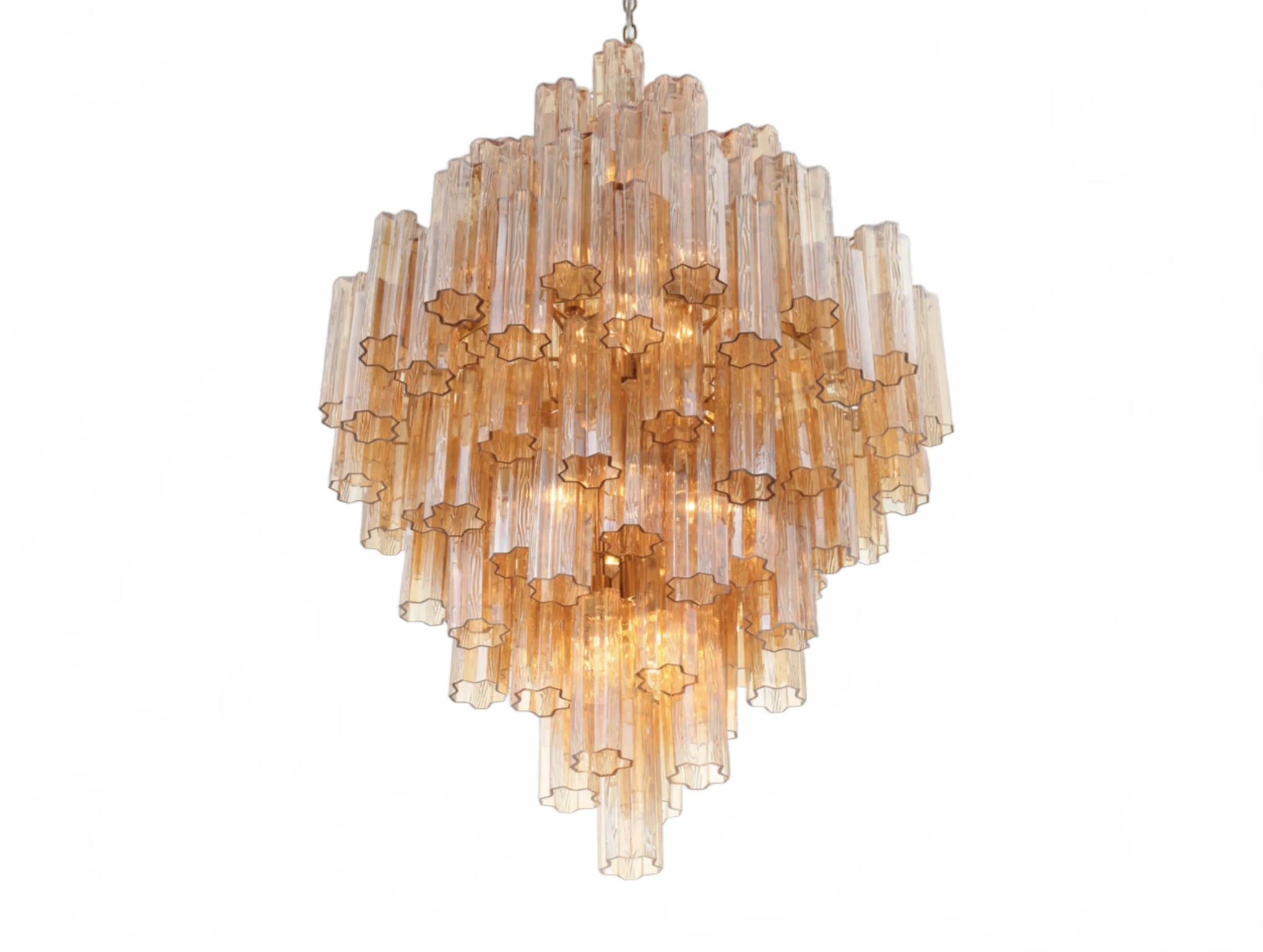 The Adois Foyer Chandelier introduces mid-century artistry into the center of your home. Influenced by the enduring Tronchi style, this chandelier showcases a refined frame in polished chrome or aged brass, paired with transparent rows of textured glass tubes that capture and refract light beautifully.