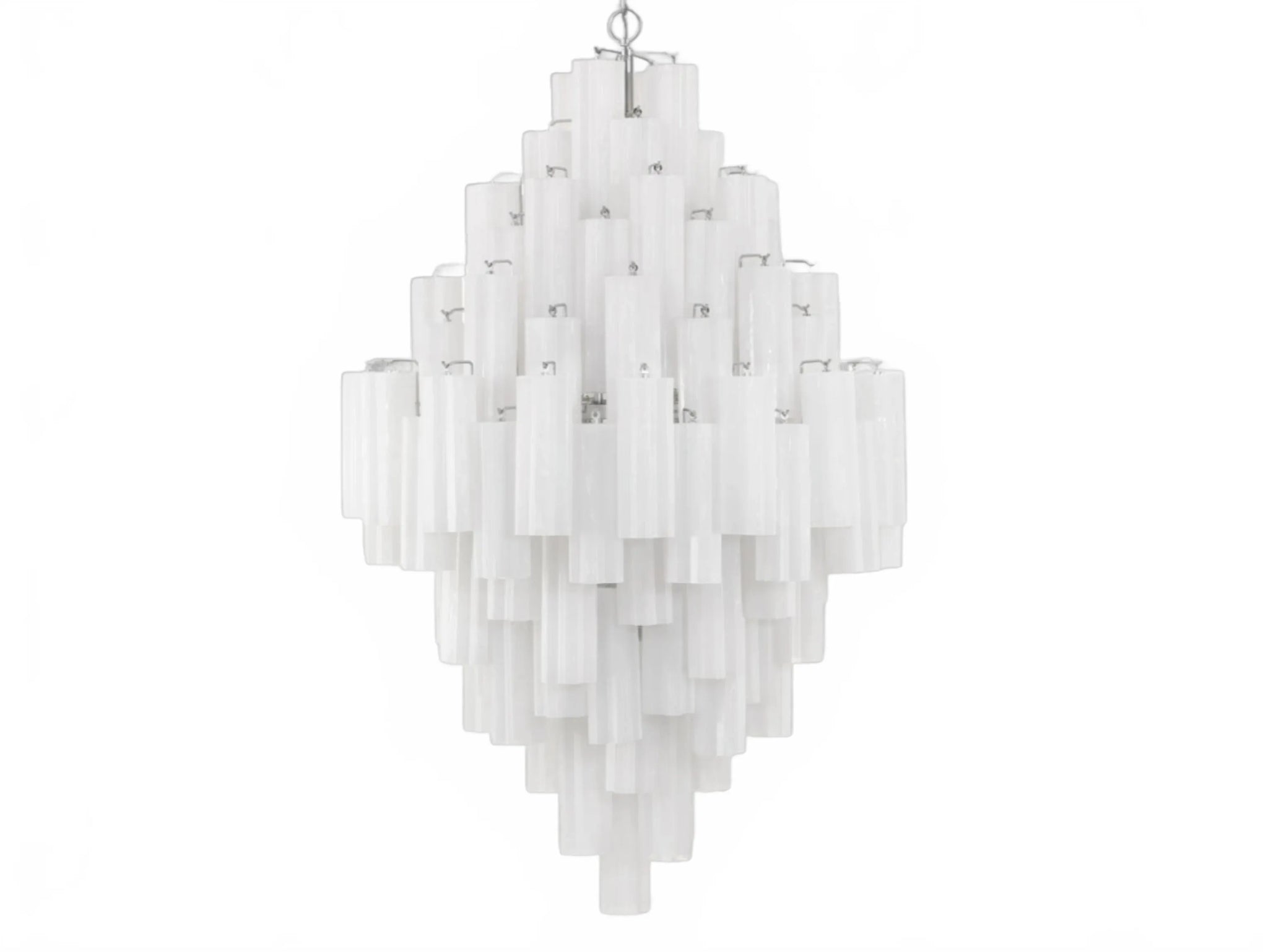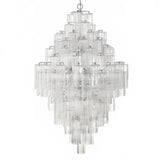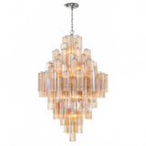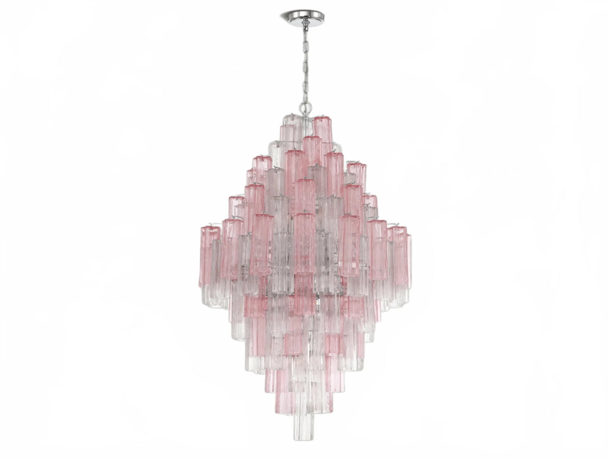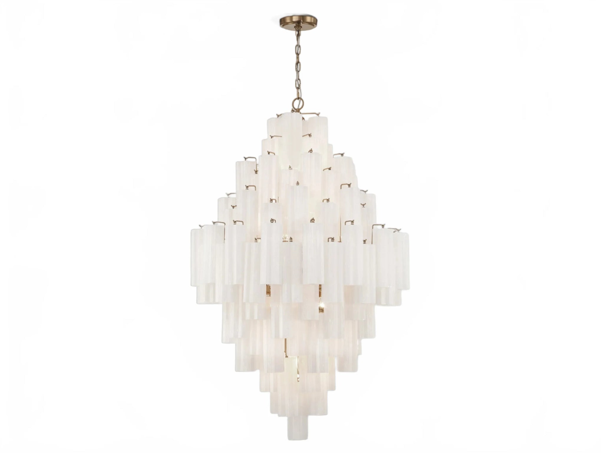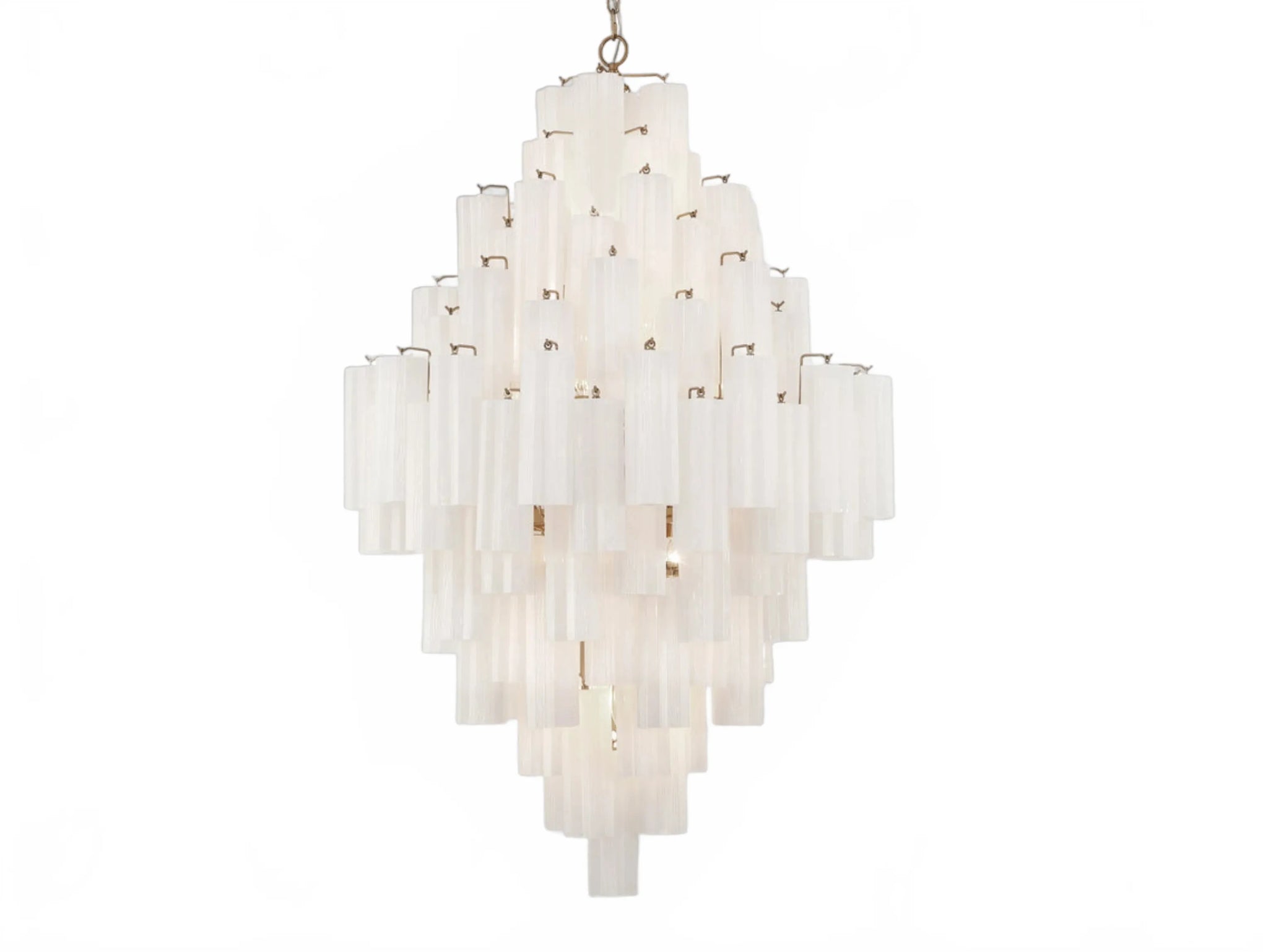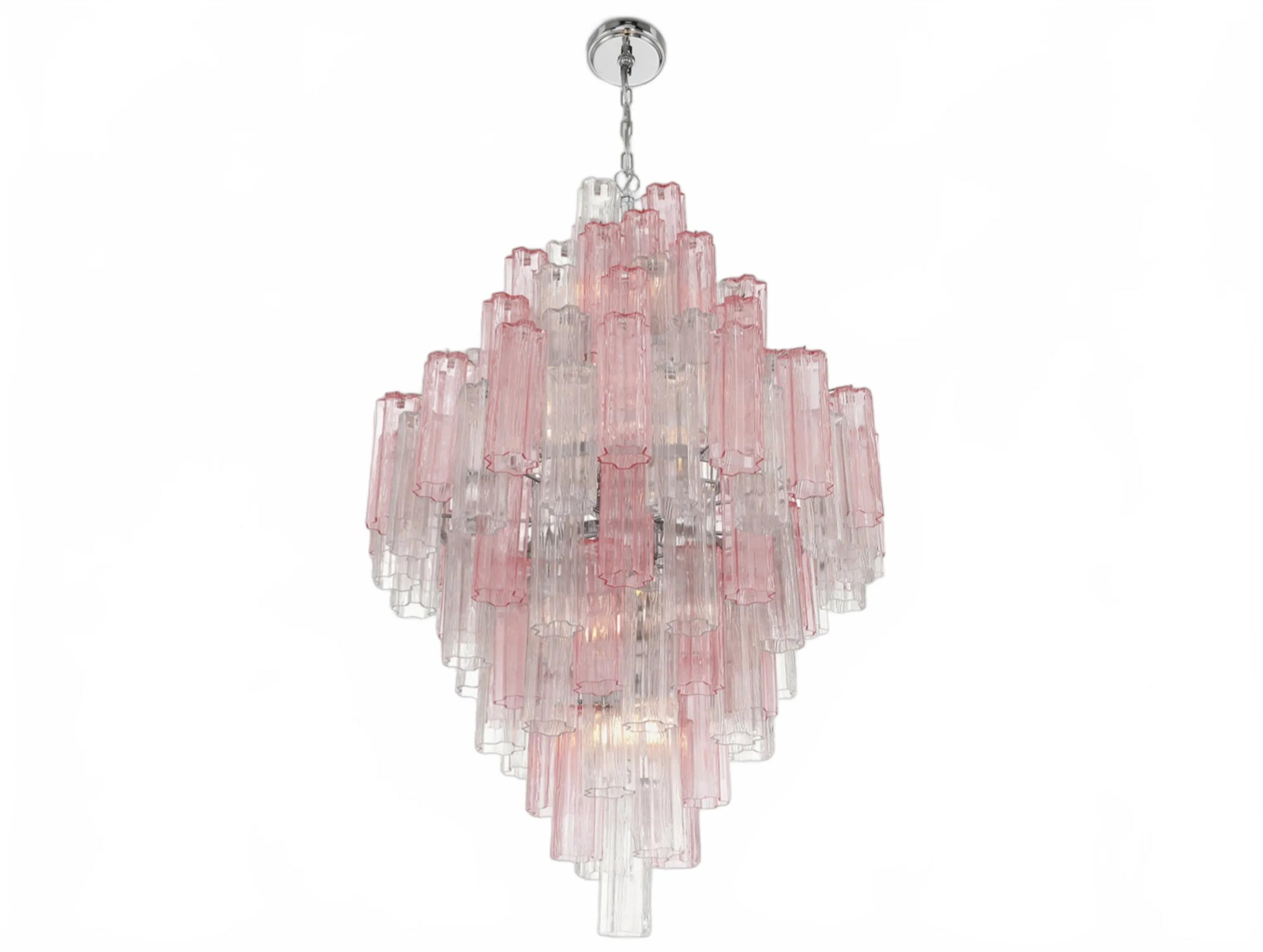 The Adois Foyer Chandelier introduces mid-century artistry into the center of your home. Influenced by the enduring Tronchi style, this chandelier showcases a refined frame in polished chrome or aged brass, paired with transparent rows of textured glass tubes that capture and refract light beautifully.