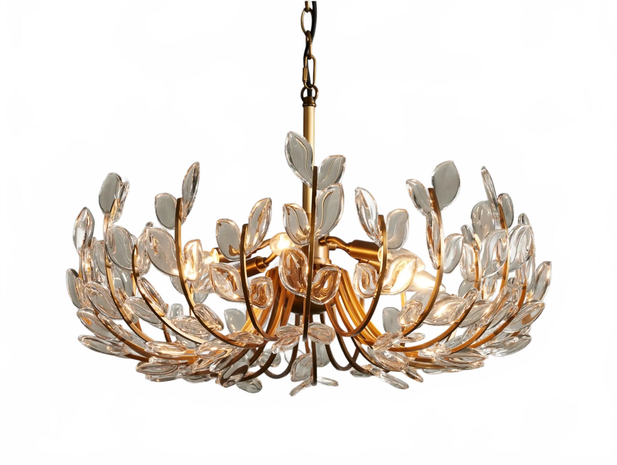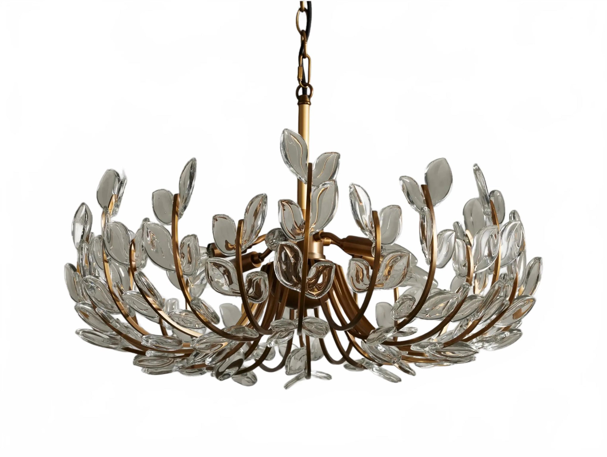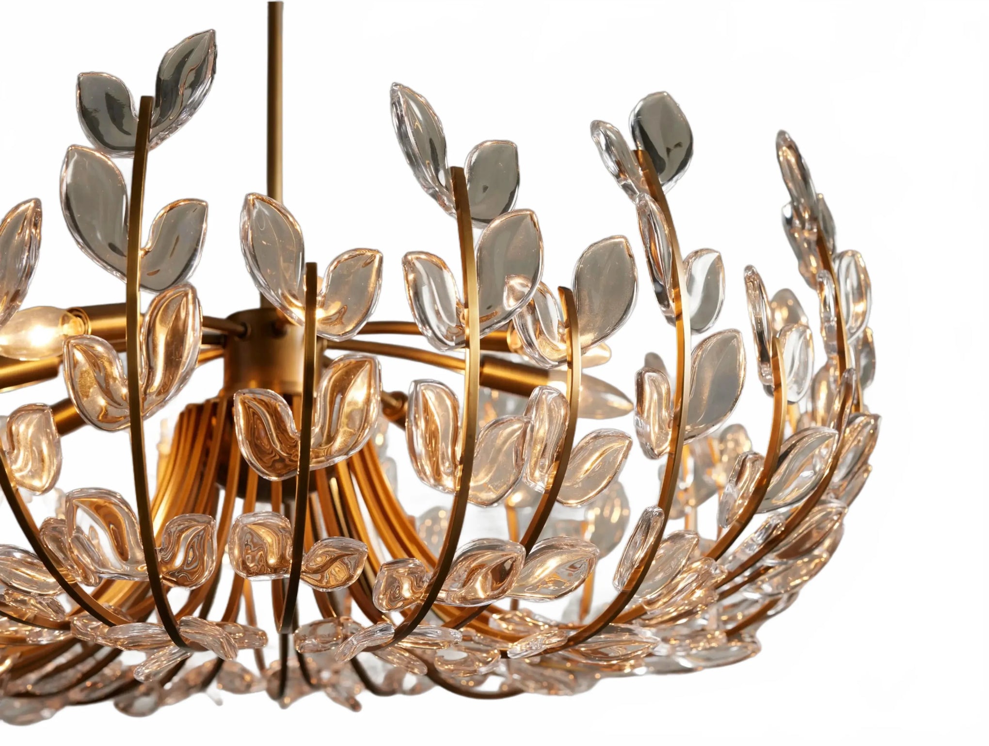 Sculptural yet organic, this chandelier is handcrafted from steel with a burnished brass finish and adorned with glass petals that refract the light beautifully. Its gently curved petals suggest a natural refinement, while steel branches ensure structure and harmony. A striking centerpiece for dining rooms, lounge areas, or foyers.