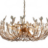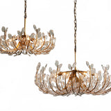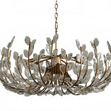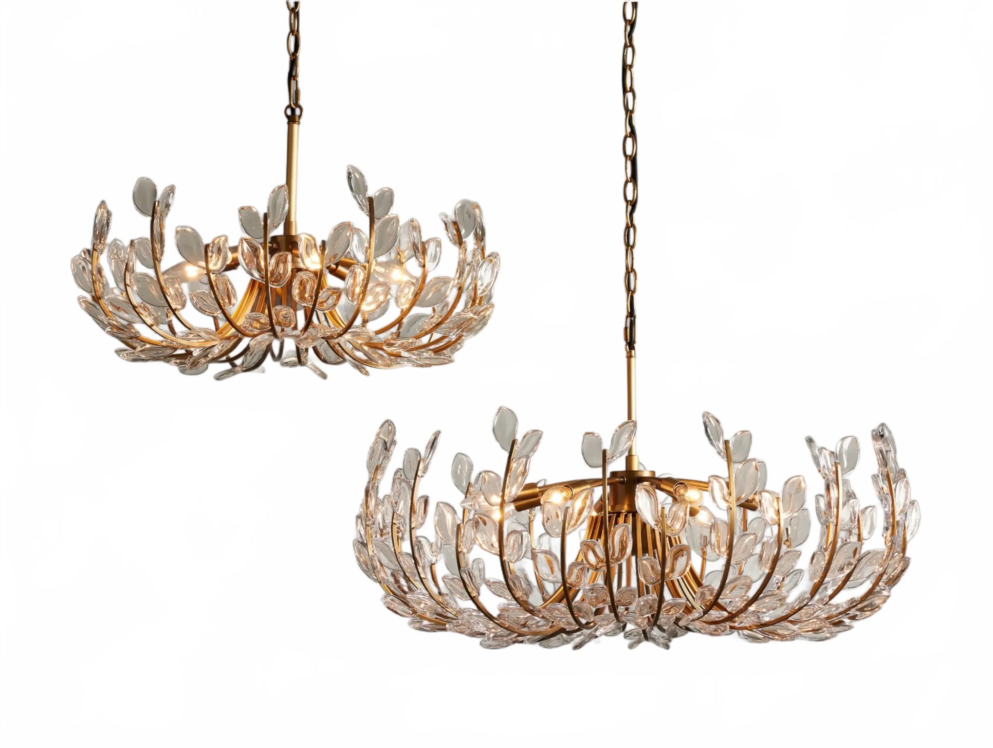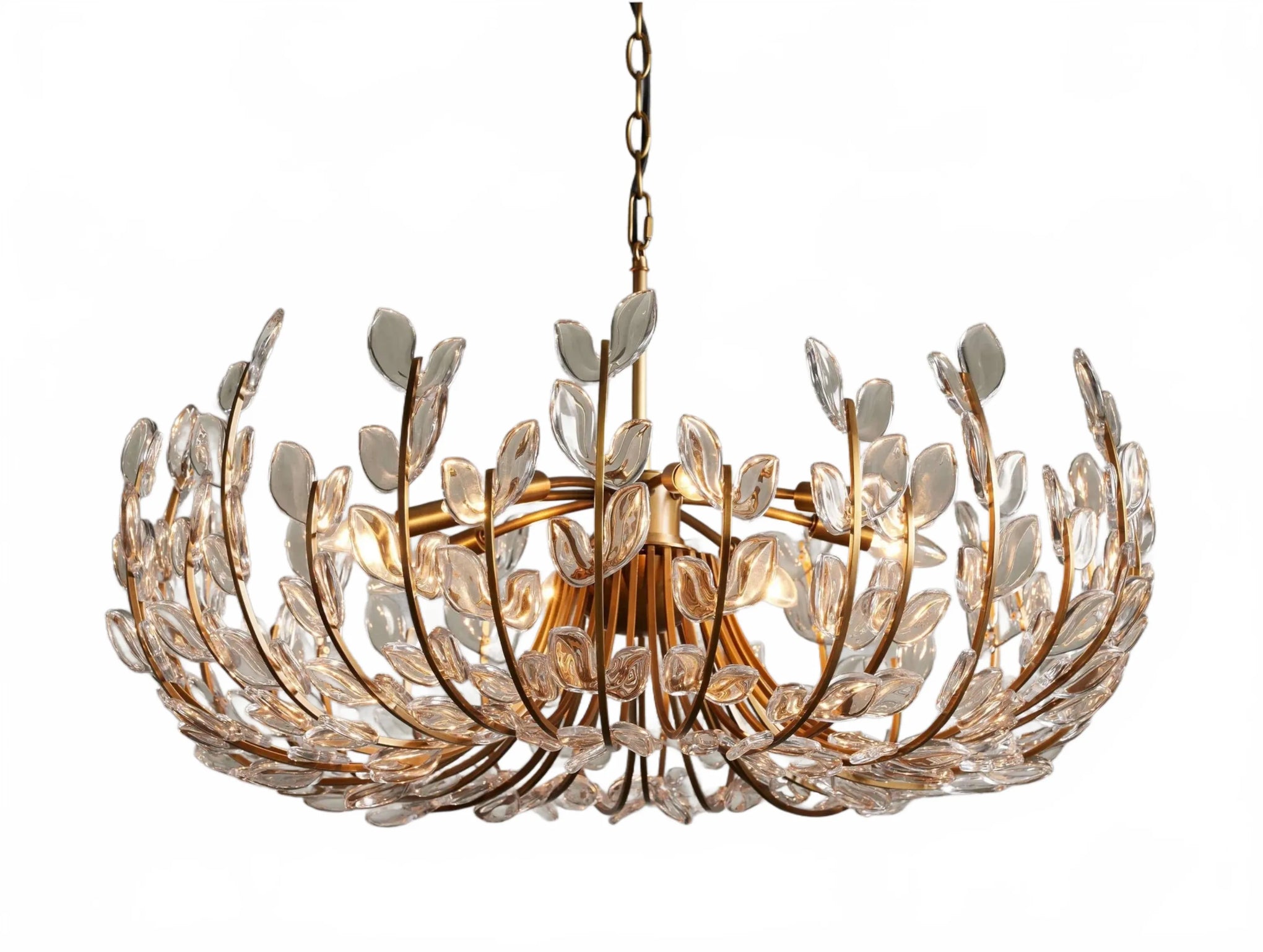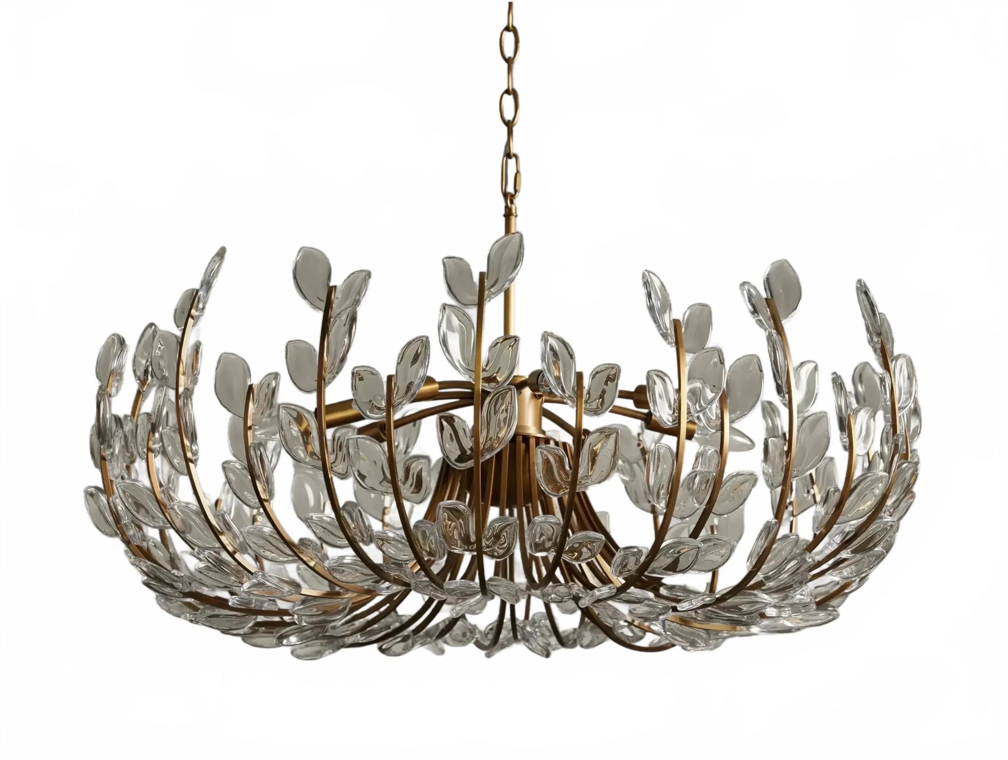 Sculptural yet organic, this chandelier is handcrafted from steel with a burnished brass finish and adorned with glass petals that refract the light beautifully. Its gently curved petals suggest a natural refinement, while steel branches ensure structure and harmony. A striking centerpiece for dining rooms, lounge areas, or foyers.