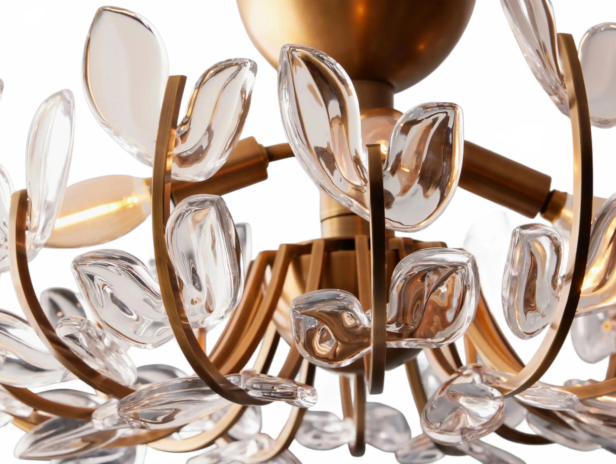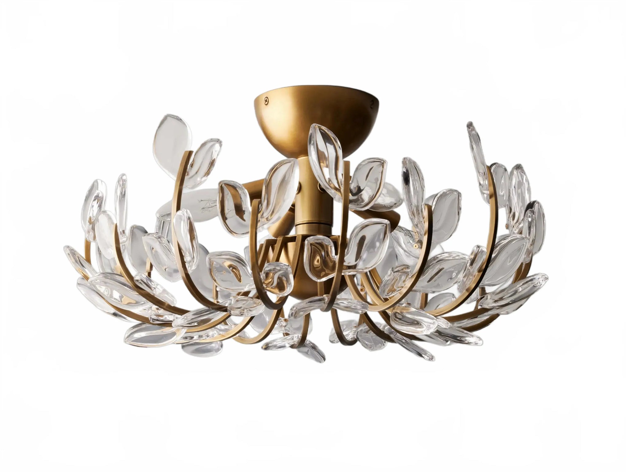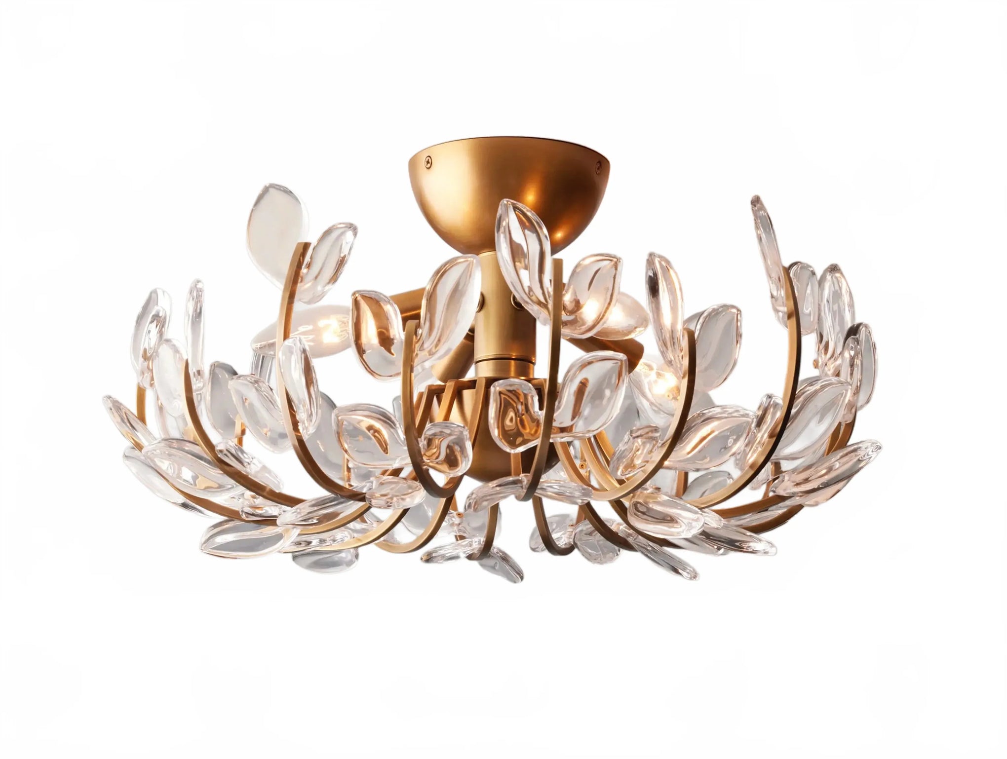 Artisanal steel construction with a burnished brass sheen, this flush mount features delicately molded glass petals that disperse illumination with organic refinement. The gently arched contours suggest the splendor of nature, while the defined steel limbs ensure strength and harmony. An adaptable accent for corridors, bedrooms, and lounge areas.